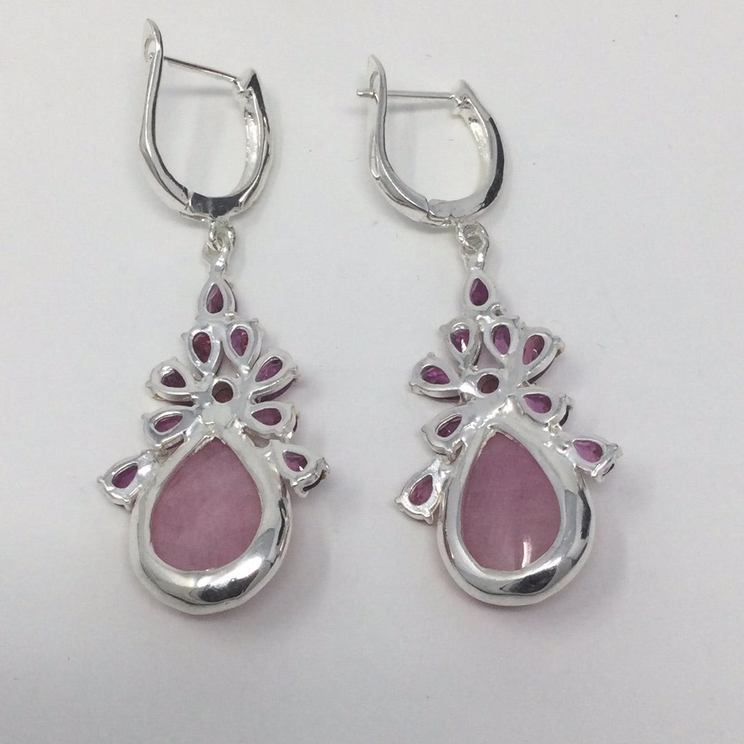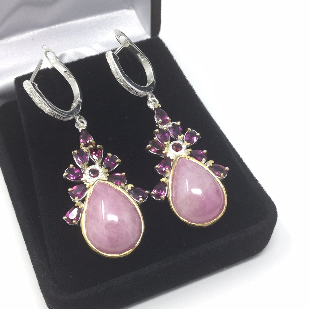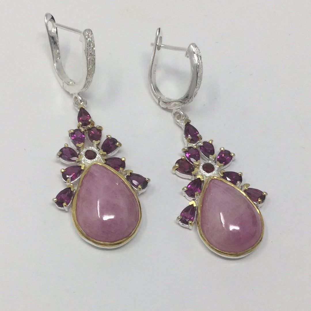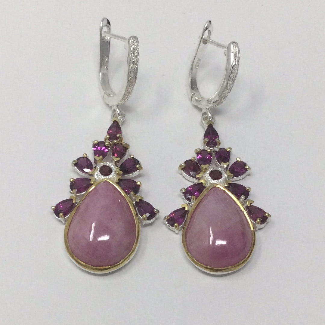 Outstanding genuine soft pink Ruby cabochons, majestically accented with genuine Rhodolite Garnets, a symphony of enchantment. These are custom made, one of a kind artisan made gemstone earrings. Every girl should have genuine gemstones in her jewelers collection especially unique pieces such as these. Each gemstone is hand selected as if for a cohesive work of art. The only way worthy to frame you face with luminescence, genuine gemstones. Set in .925 sterling silver overlaid with 14 K white gold with 14K yellow gold accents. Approximately 1 1/2” Long.