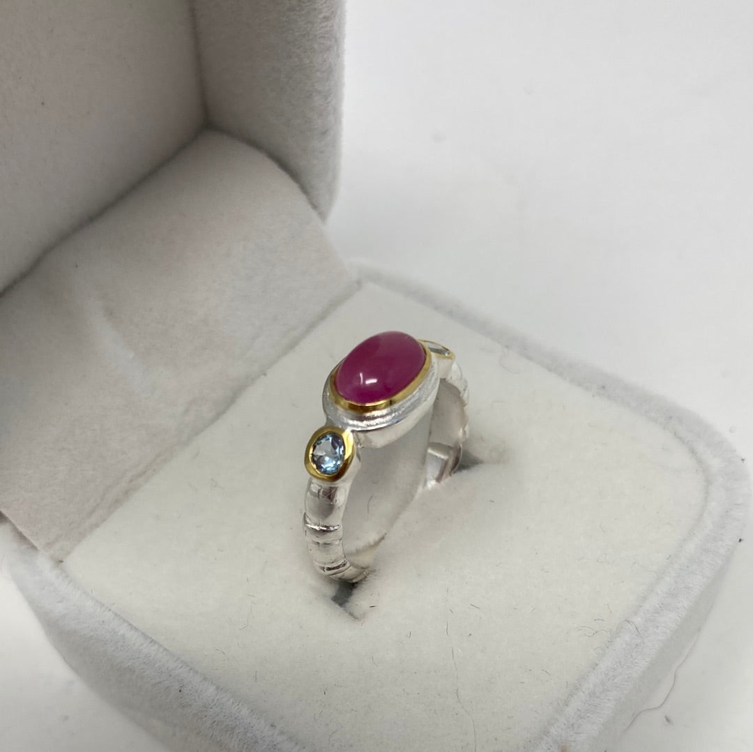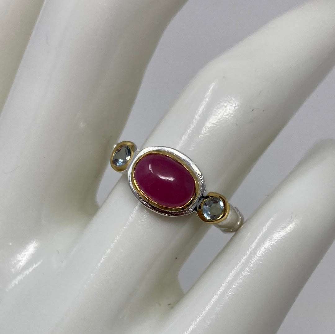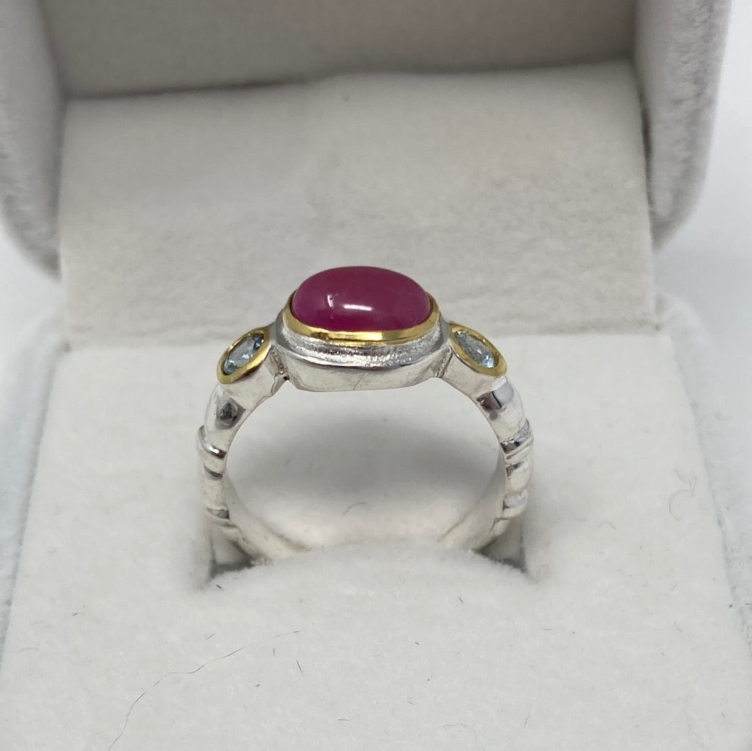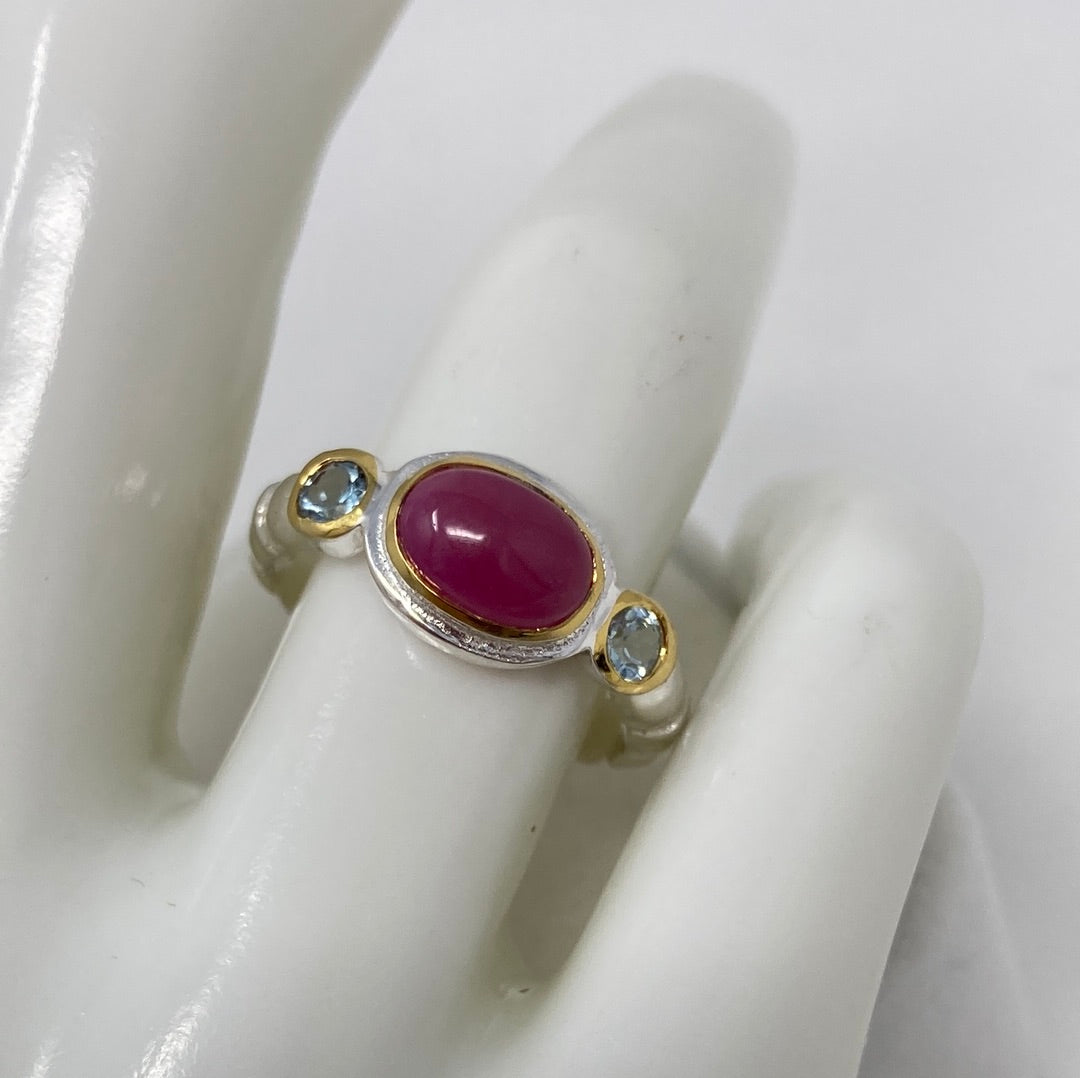 A sweet petite, genuine 8mm by 6mm Ruby flanked on each side by Sky Blue Topaz. This is a Ruby Cabochon polish gemstone set in .925 sterling silver with yellow gold accents. A timeless classic that will be cherished for generations to come. A dainty, romantic ring. Size 6, Resize at your jeweler or use a ring guard.