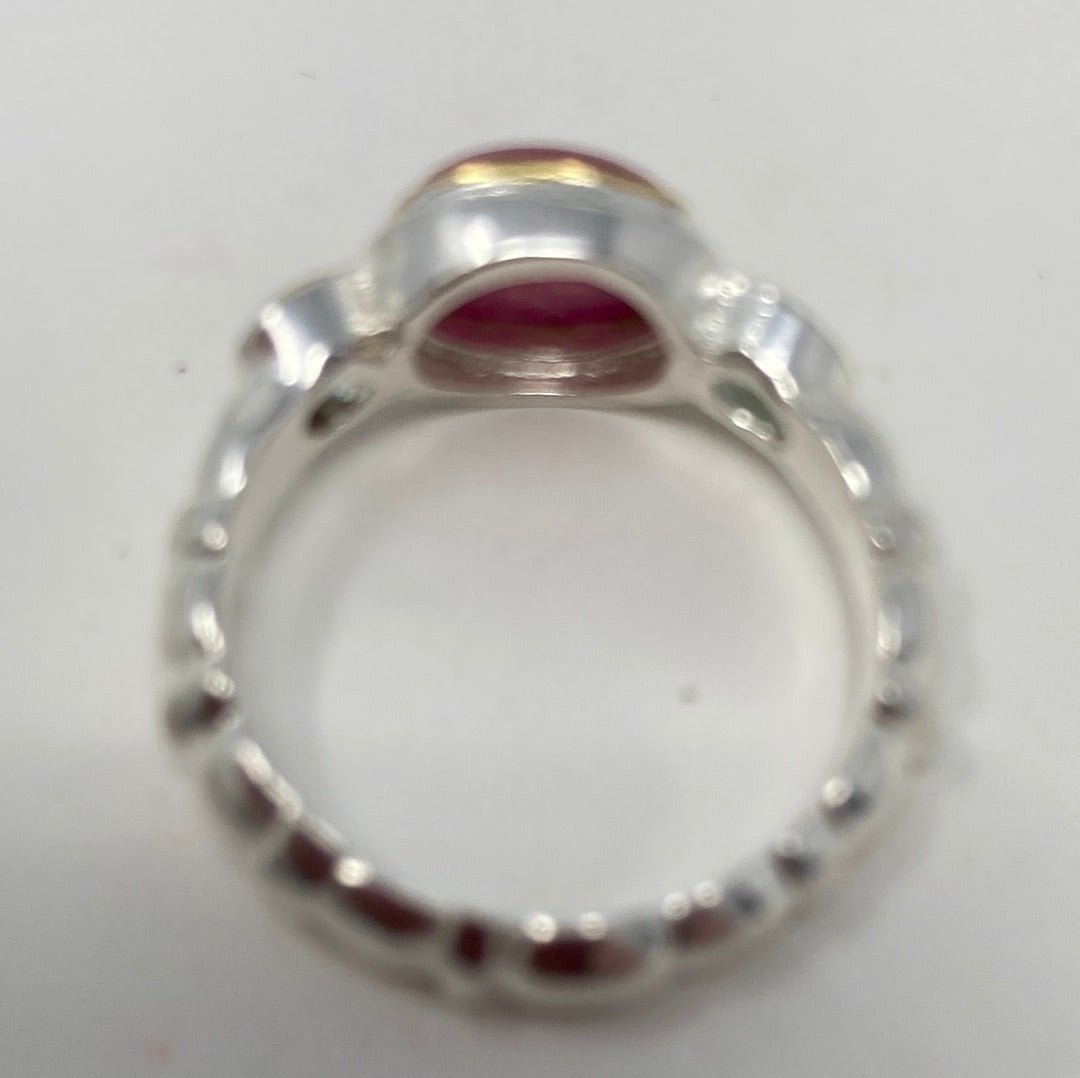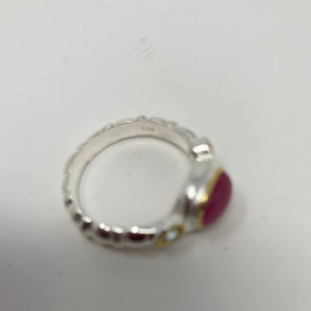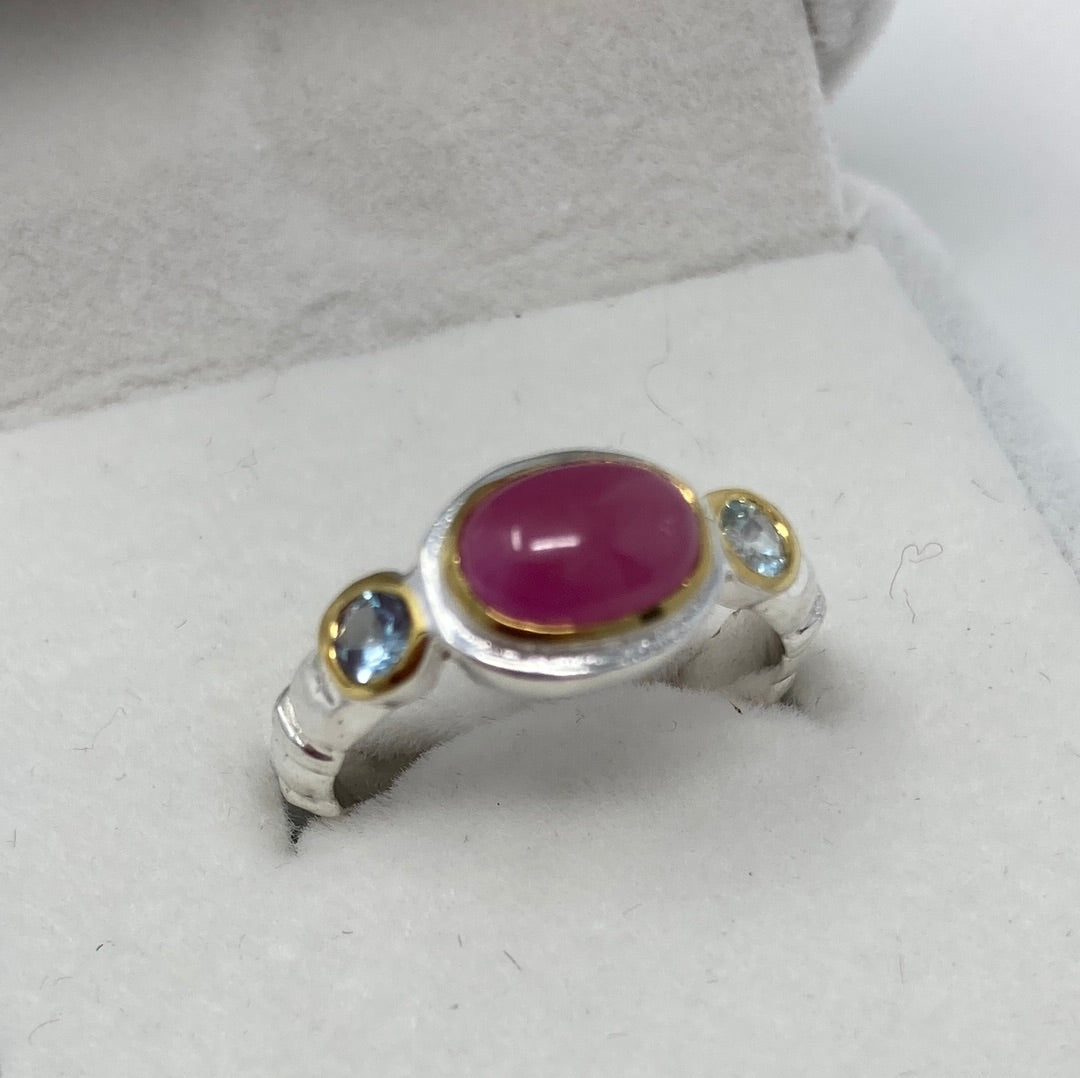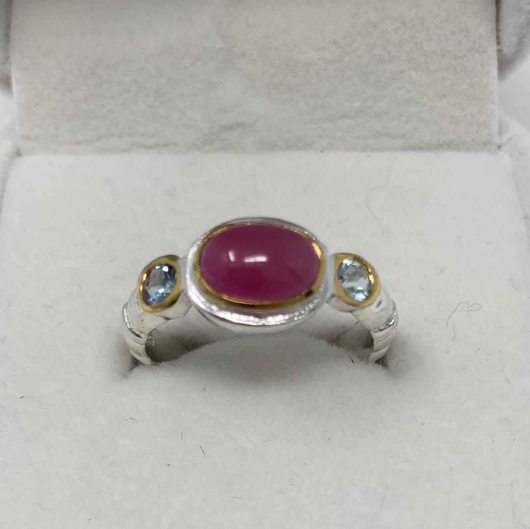 A sweet petite, genuine 8mm by 6mm Ruby flanked on each side by Sky Blue Topaz. This is a Ruby Cabochon polish gemstone set in .925 sterling silver with yellow gold accents. A timeless classic that will be cherished for generations to come. A dainty, romantic ring. Size 6, Resize at your jeweler or use a ring guard.