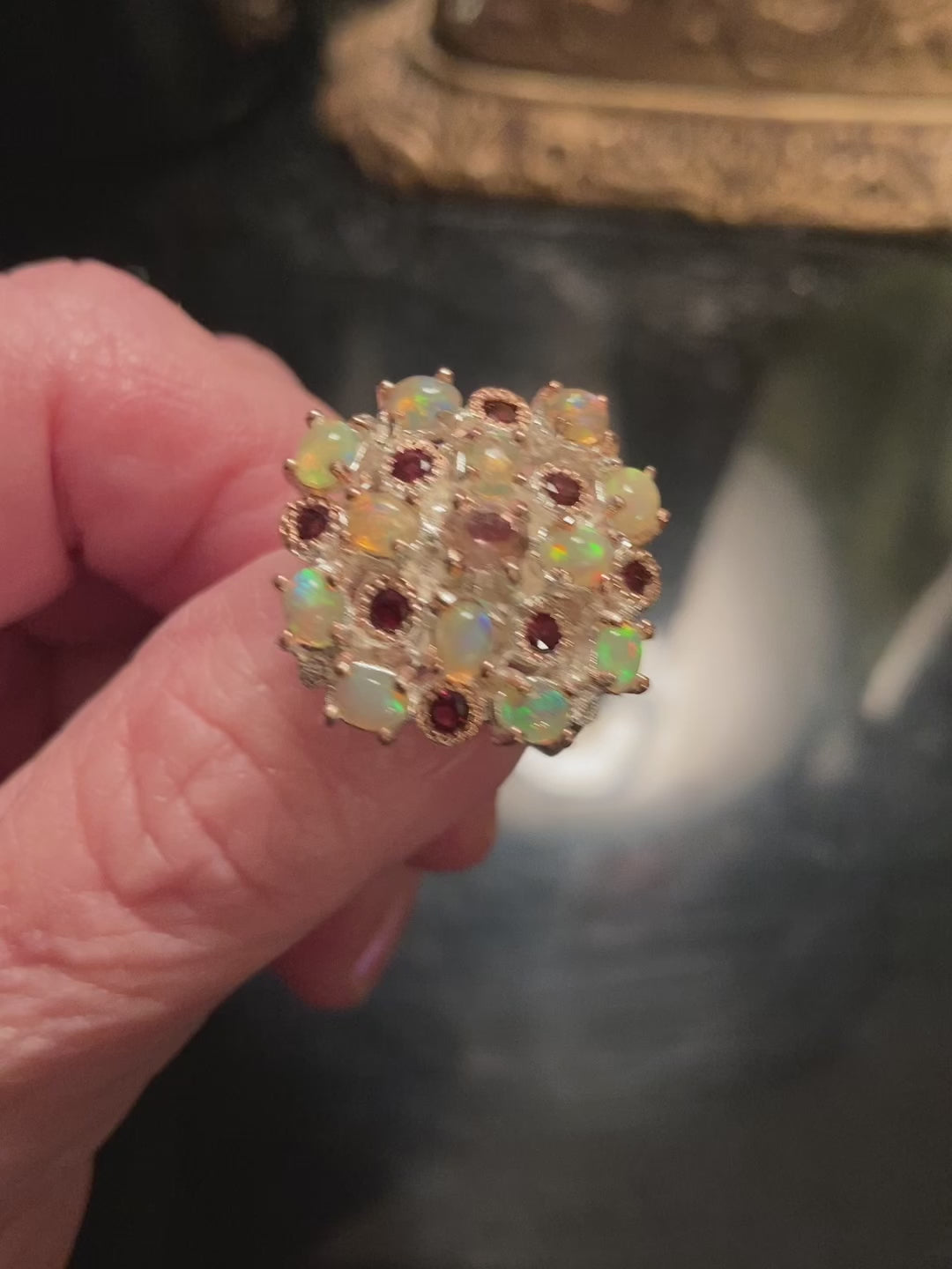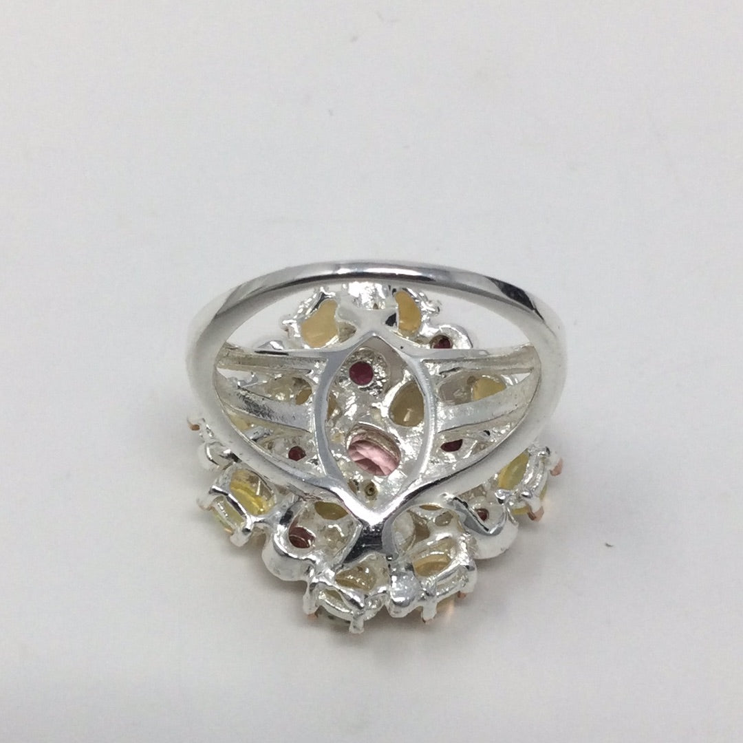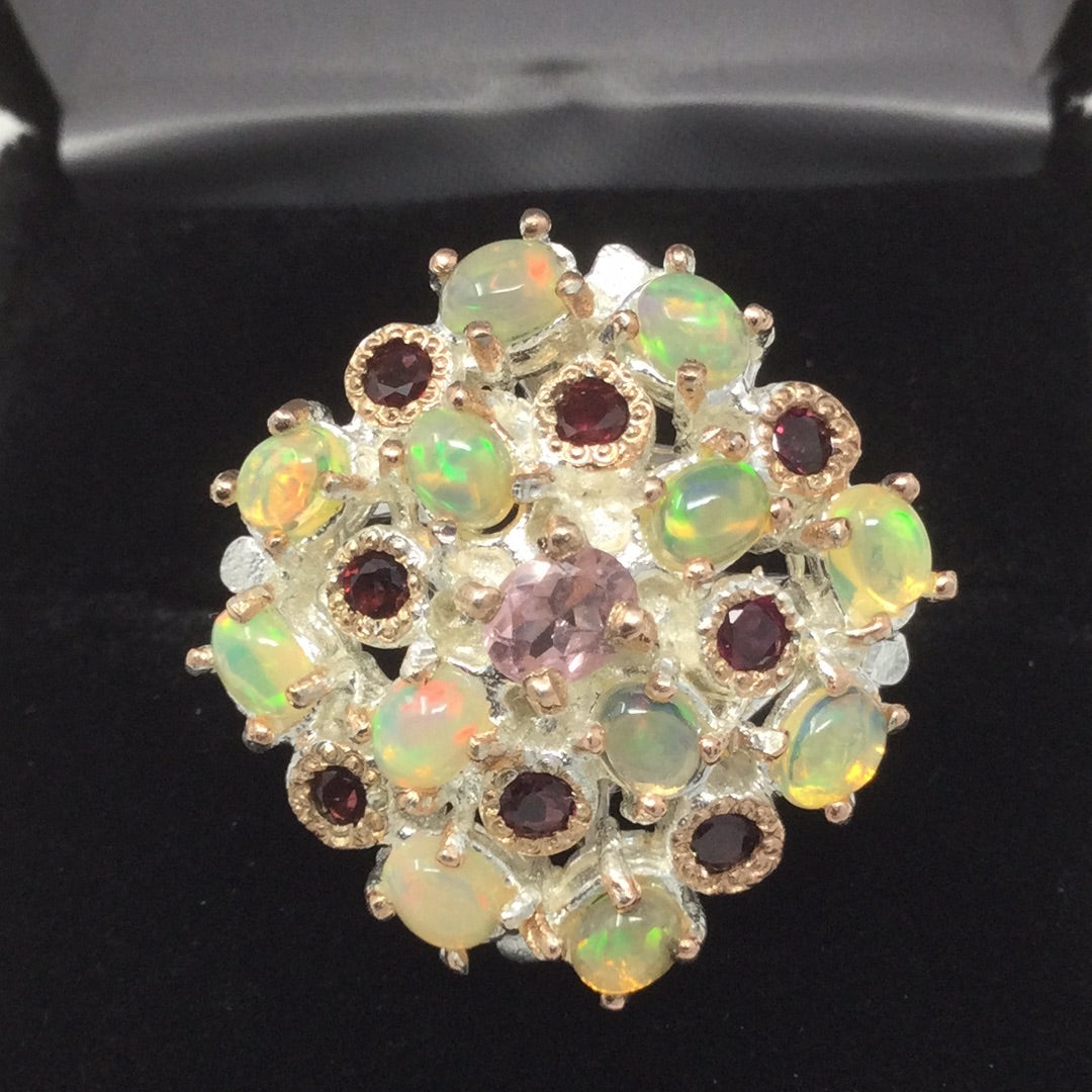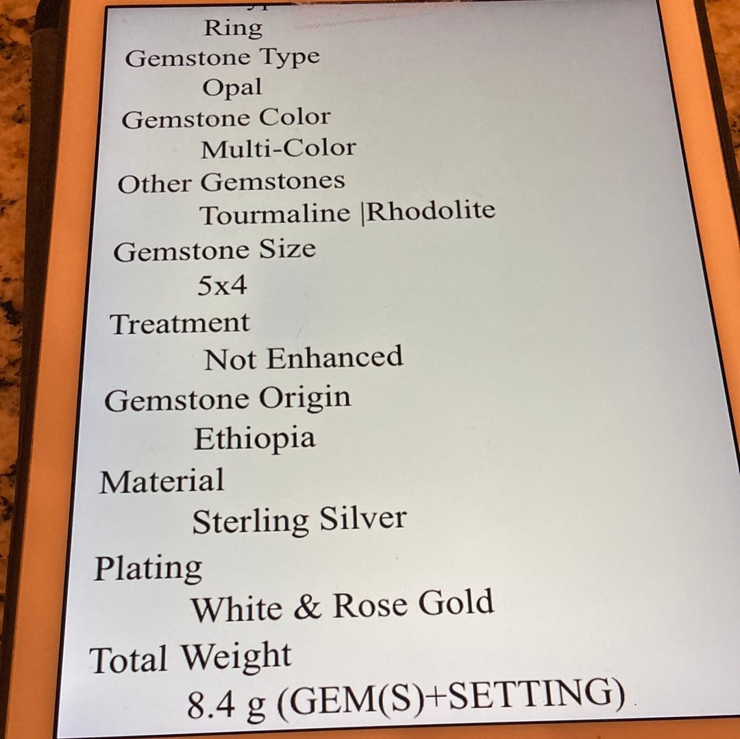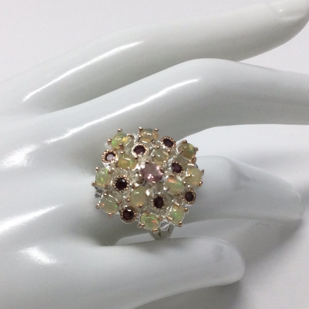 This custom made ring features a genuine Pink Tourmaline surrounded by genuine Opals and Garnets. Notice the exquisite intricate design and .925 sterling silver setting with 14K Rose gold encircling the Garnets and prongs that embrace these genuine gemstones. Pink Tourmalines are difficult to obtain and I think this one would be a wonderful edition to your future heirloom collection. Size 7 1/2 Resize at your jeweler.