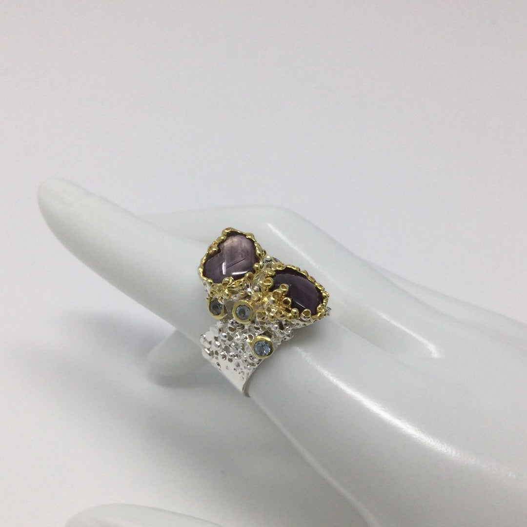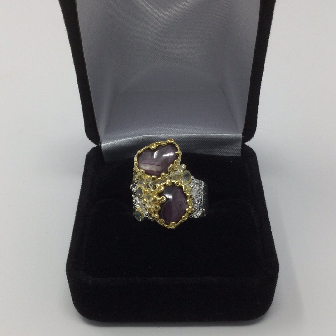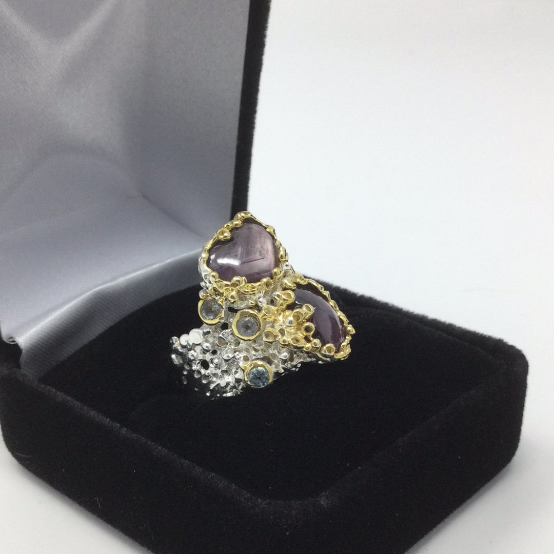 A contemporary unique artisan created design, using genuine Rubies and Topaz in this one of a kind ring. Notice the creative workmanship in this .925 setting with white and yellow gold overlay. The Rubies pop when embraced in gold, a very elevated stylized look. Size 8, Resize at your jeweler