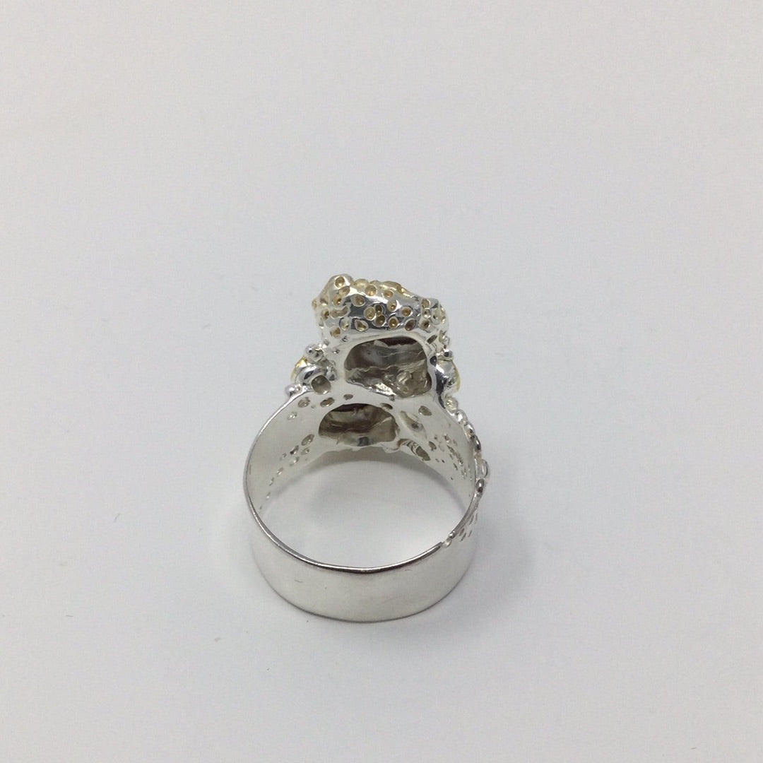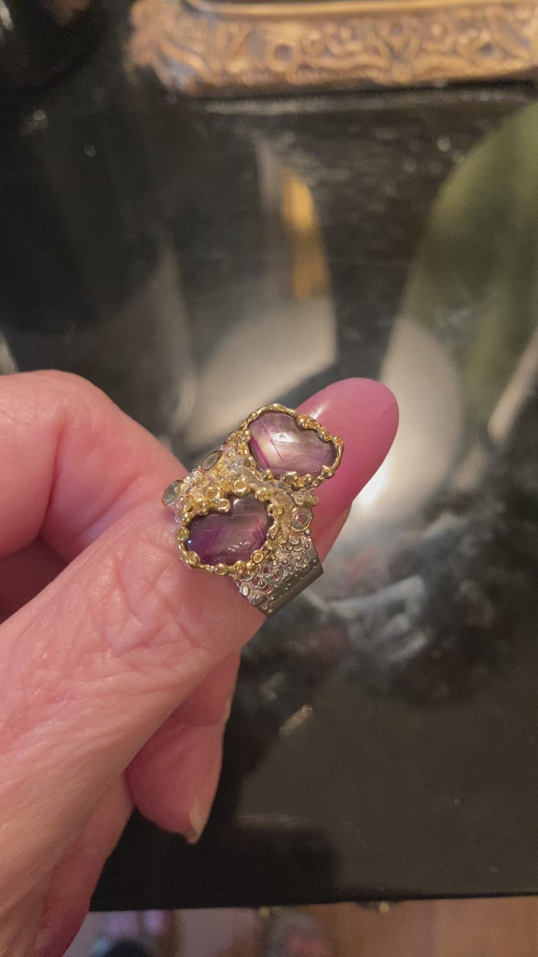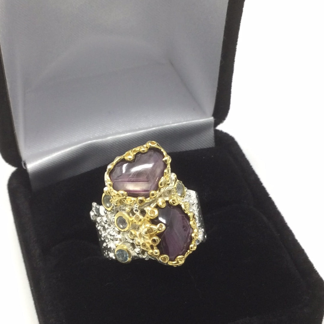 A contemporary unique artisan created design, using genuine Rubies and Topaz in this one of a kind ring. Notice the creative workmanship in this .925 setting with white and yellow gold overlay. The Rubies pop when embraced in gold, a very elevated stylized look. Size 8, Resize at your jeweler
