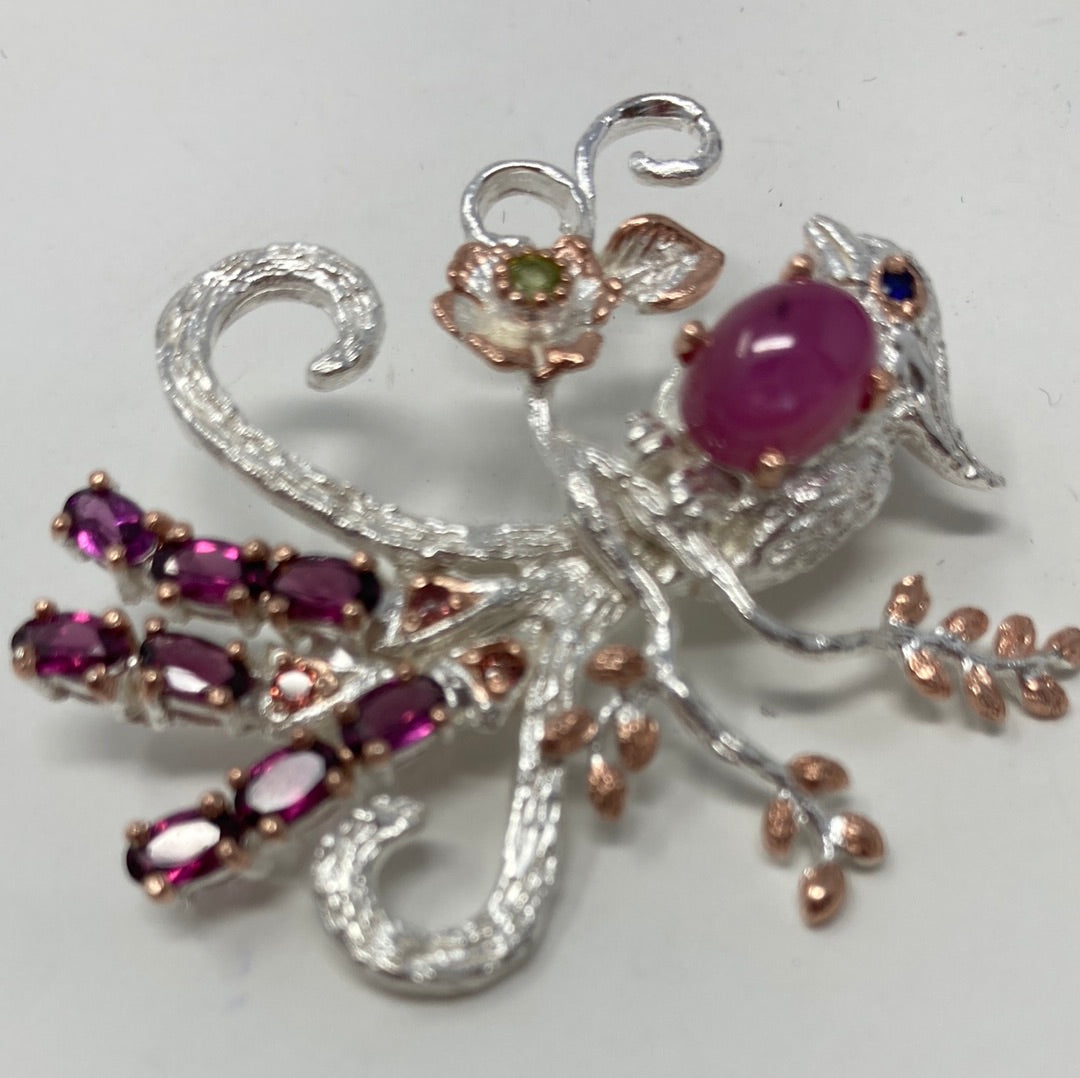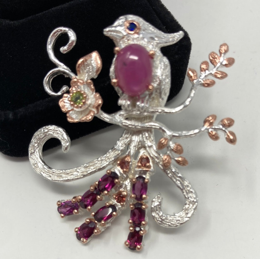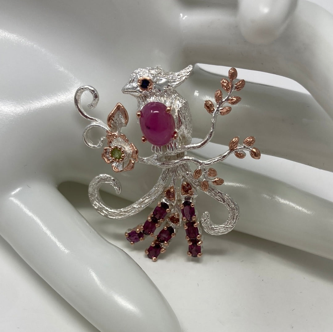 Inspirational genuine pink Ruby bird brooch. Almost 2” of sterling silver accented with genuine Rhodolite Garnets sprinkled with tiny CZS for accenting the bird. This brooch can be worn on a variety of ways, on a hat, your sleeve just about anywhere. It’s a one of a kind crafted by artistic. artisans. This is forever jewelry to become your future heirlooms. Has a white gold overlay with rose gold accents for durability and beauty.