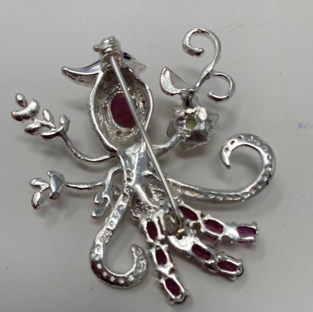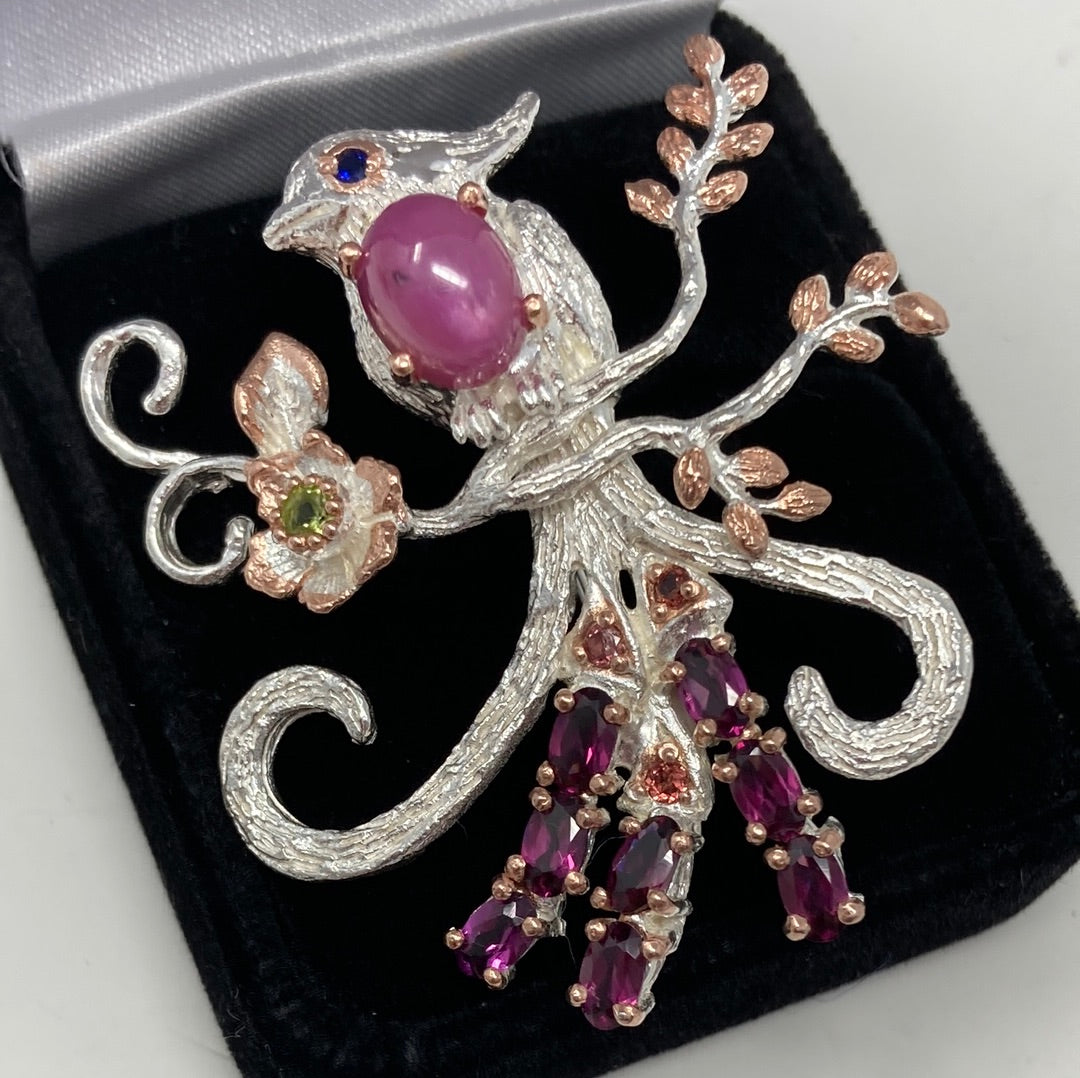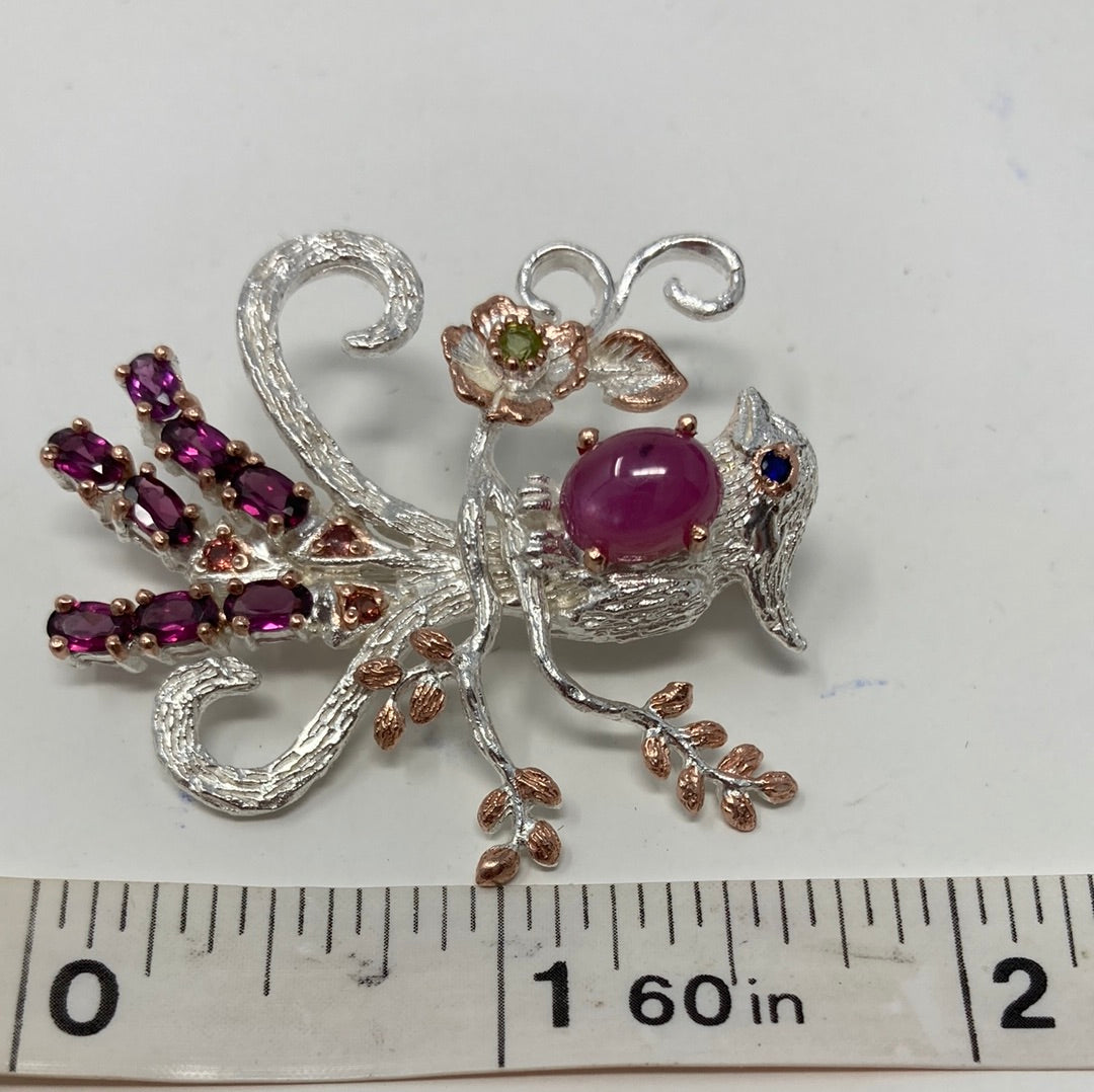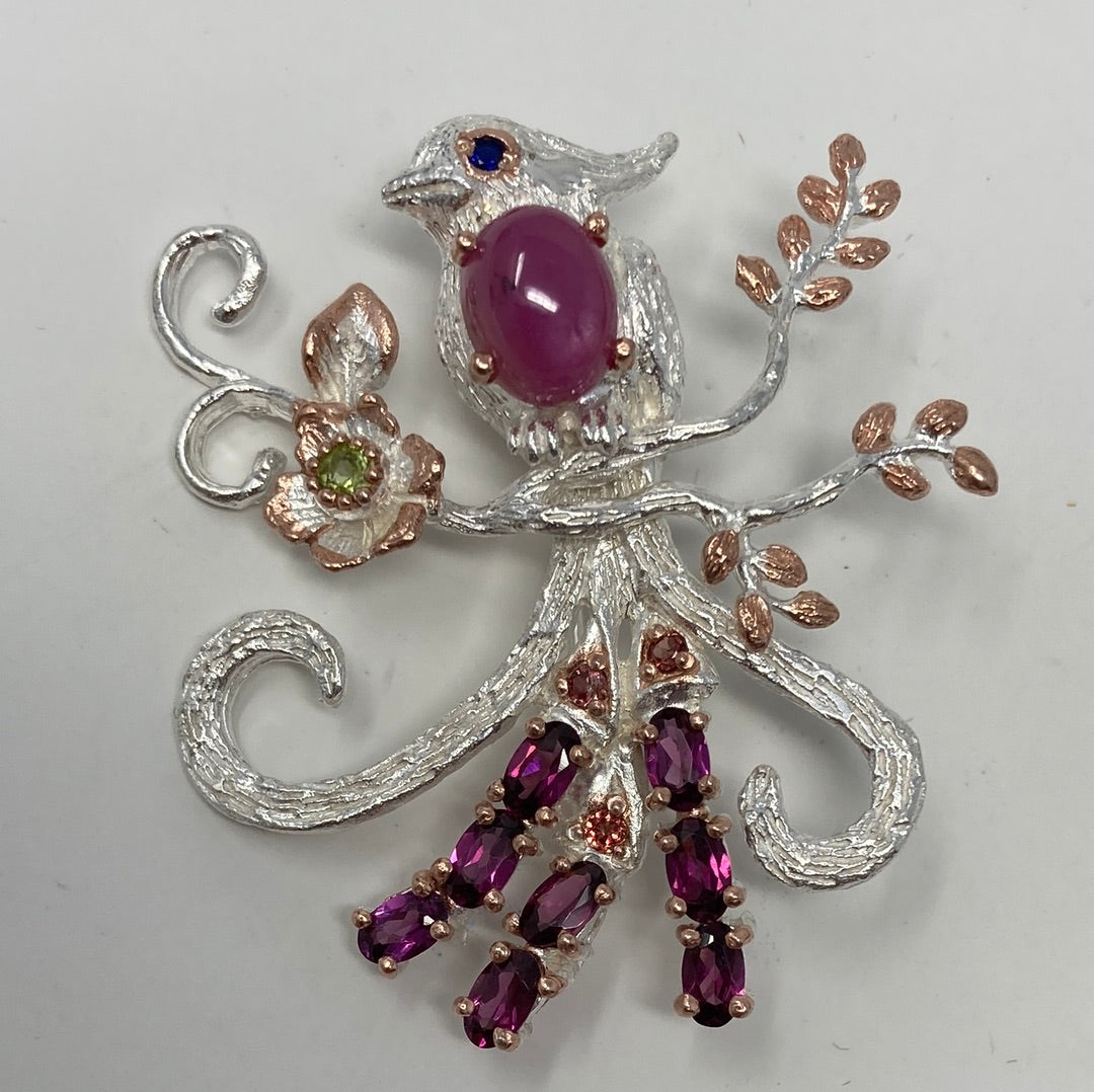 Inspirational genuine pink Ruby bird brooch. Almost 2” of sterling silver accented with genuine Rhodolite Garnets sprinkled with tiny CZS for accenting the bird. This brooch can be worn on a variety of ways, on a hat, your sleeve just about anywhere. It’s a one of a kind crafted by artistic. artisans. This is forever jewelry to become your future heirlooms. Has a white gold overlay with rose gold accents for durability and beauty.