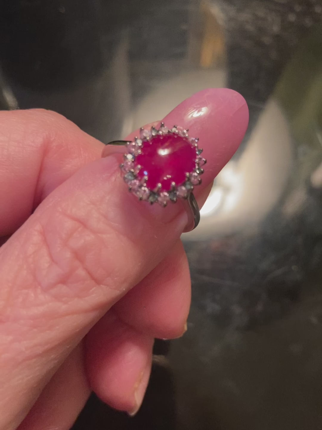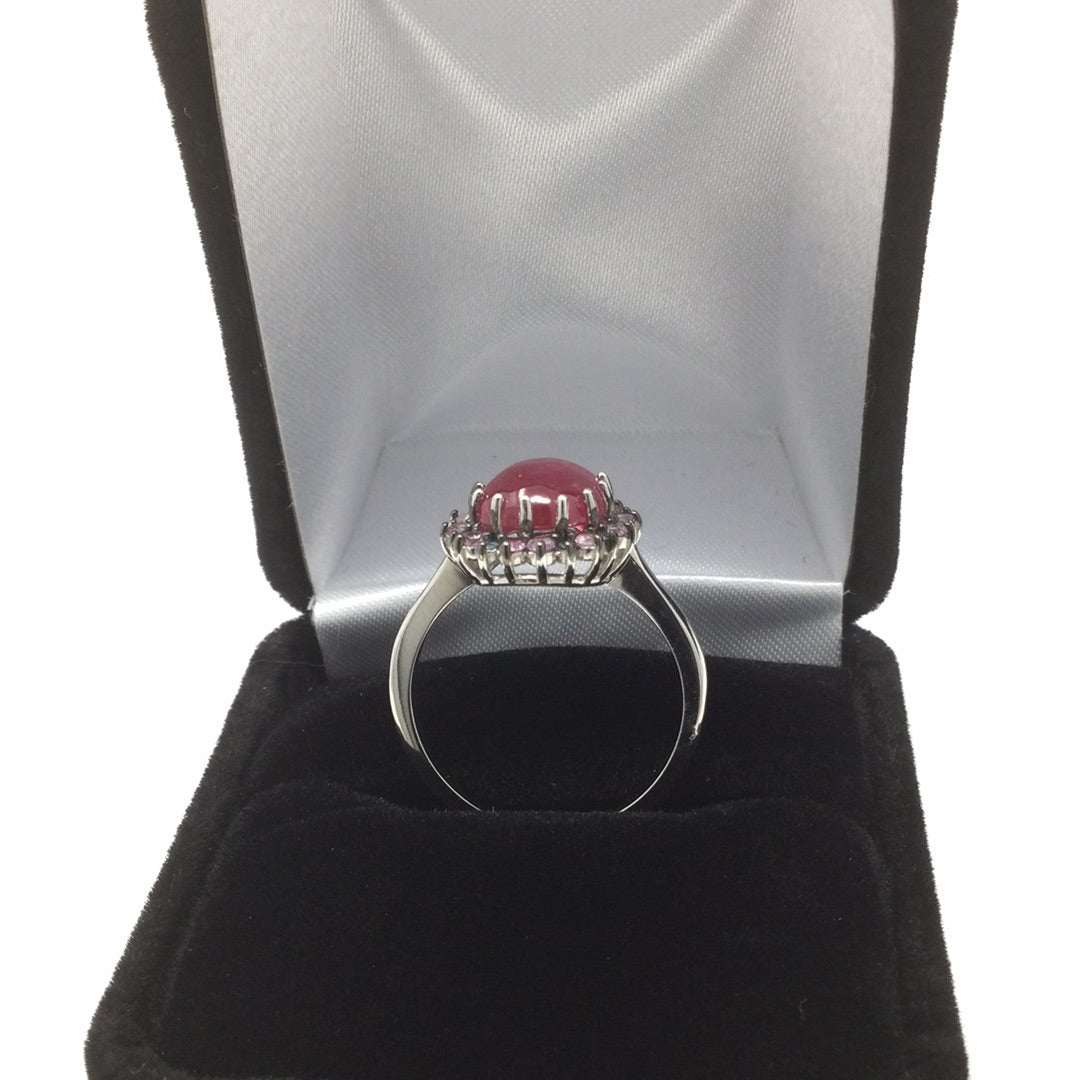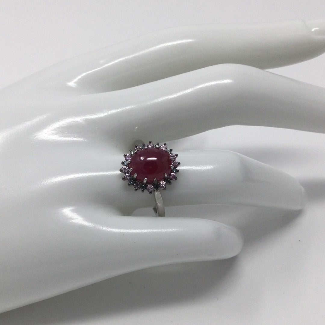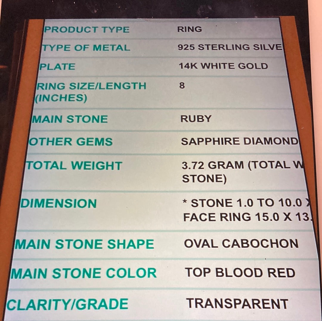 A rich genuine Ruby cabochon, 10mm by 8mm, surrounded by genuine Sapphires in this very classy ring. Crafted in .925 silver with a genuine 14K white gold overlay. This Ruby is from exotic Madagascar, top blood red, an eternal gemstone for your collection. Size 8, can be resized at your jeweler.