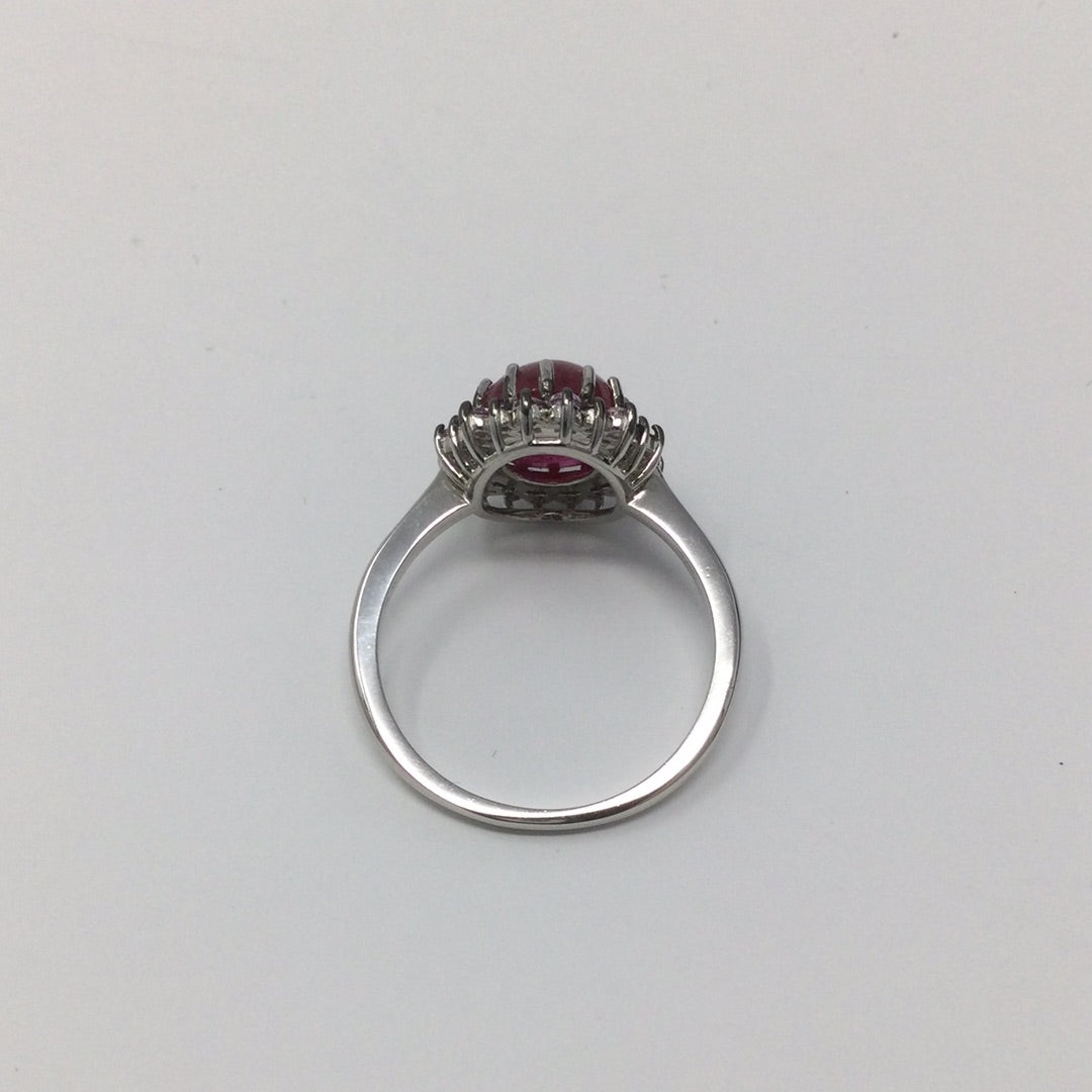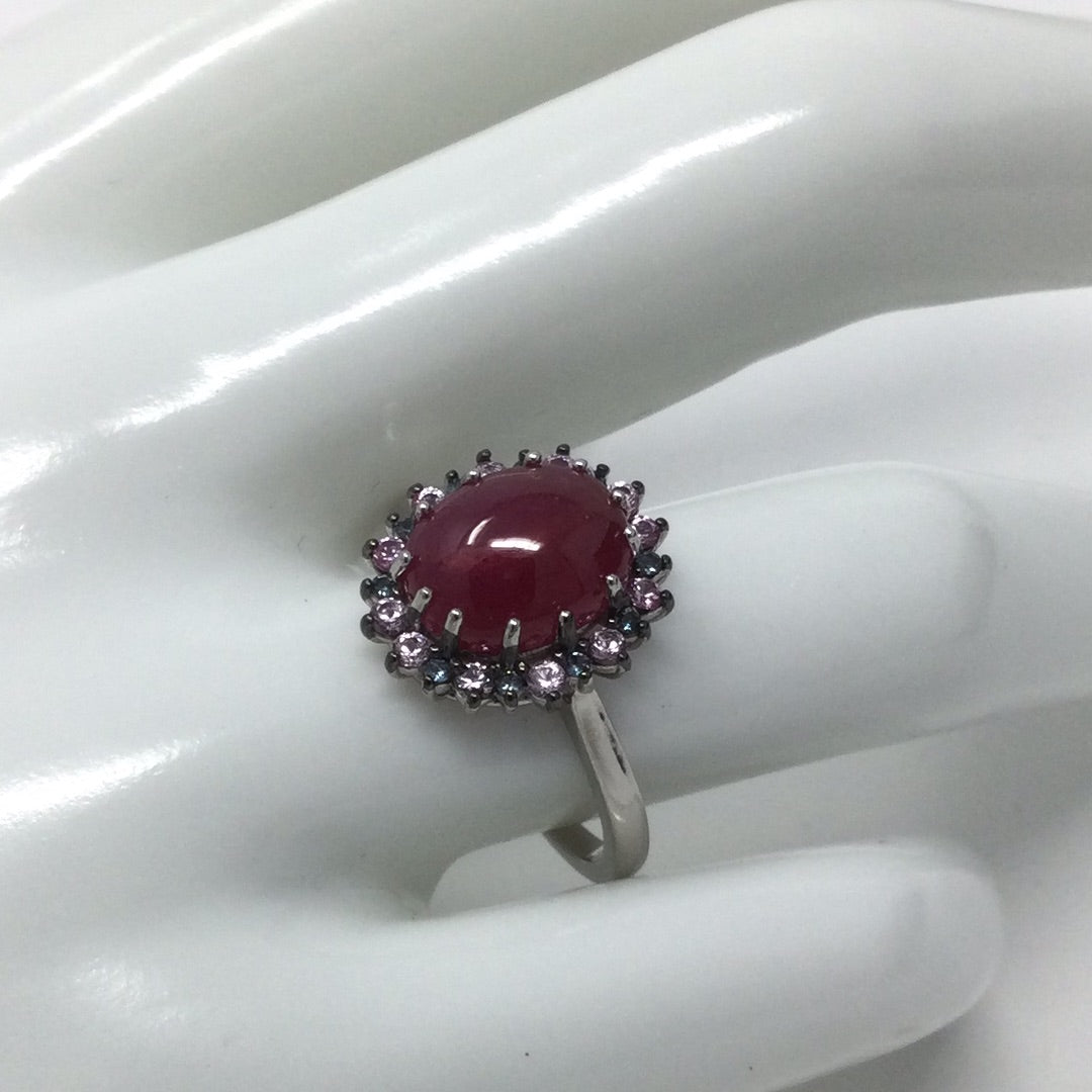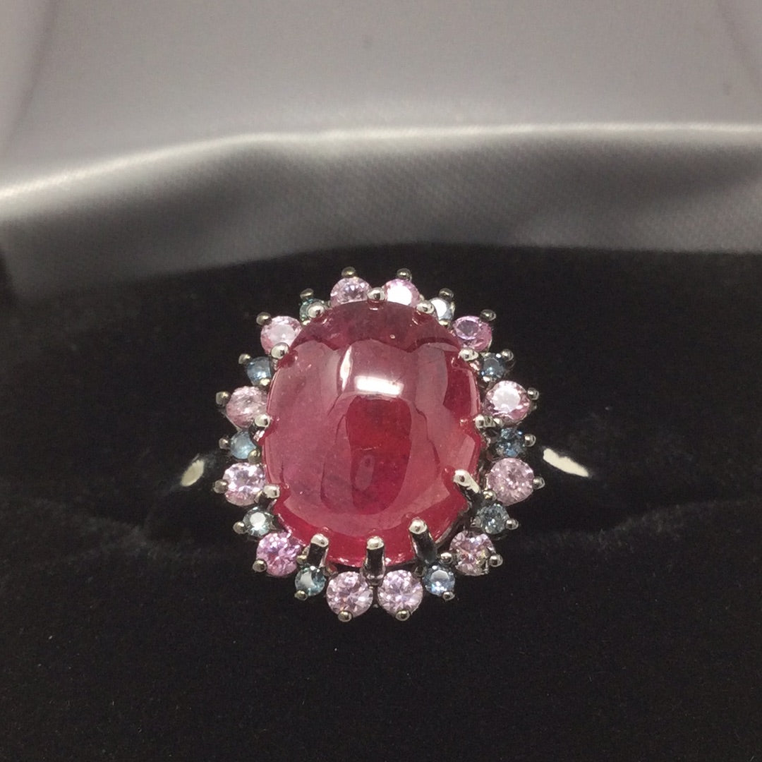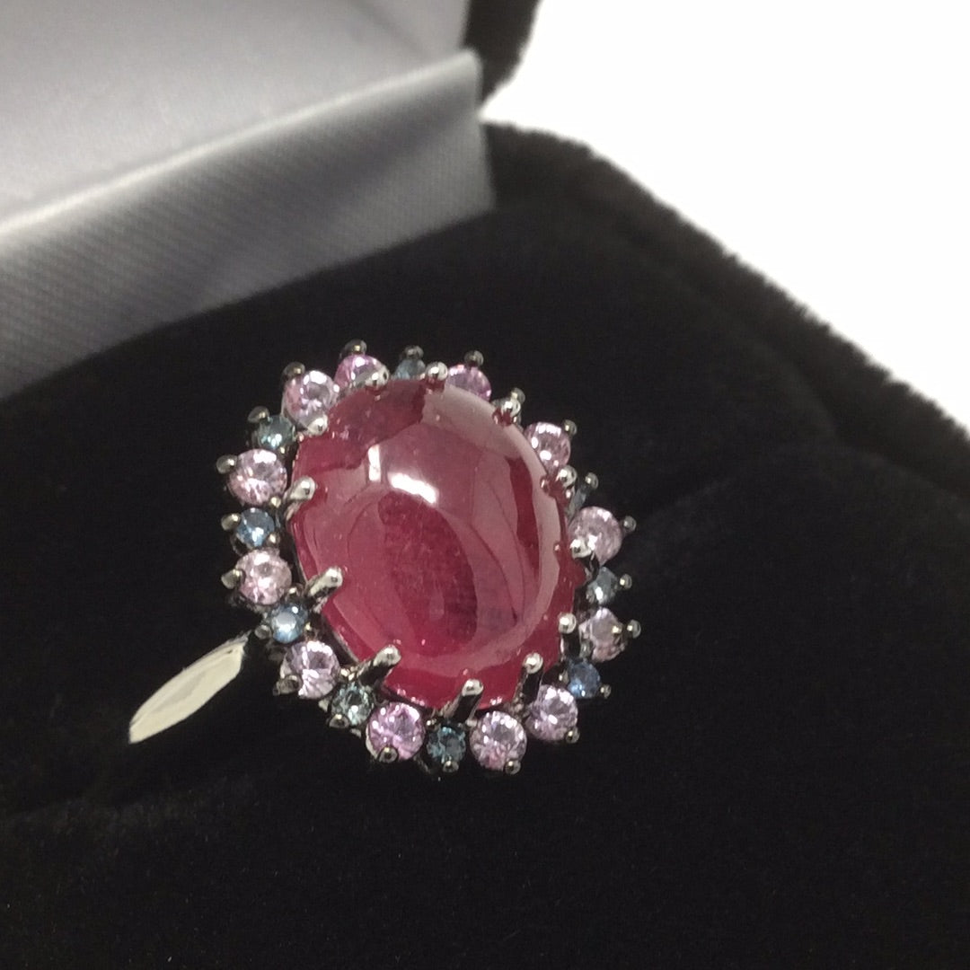 A rich genuine Ruby cabochon, 10mm by 8mm, surrounded by genuine Sapphires in this very classy ring. Crafted in .925 silver with a genuine 14K white gold overlay. This Ruby is from exotic Madagascar, top blood red, an eternal gemstone for your collection. Size 8, can be resized at your jeweler.