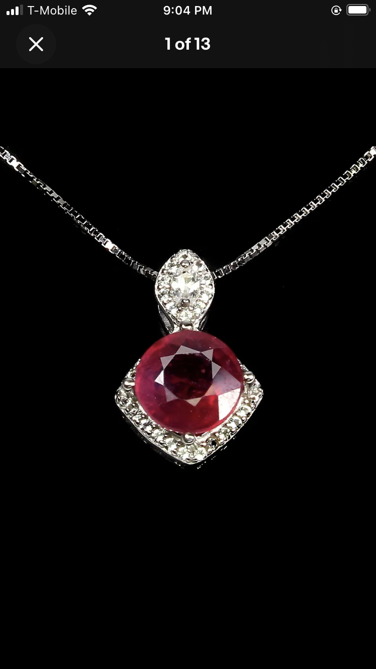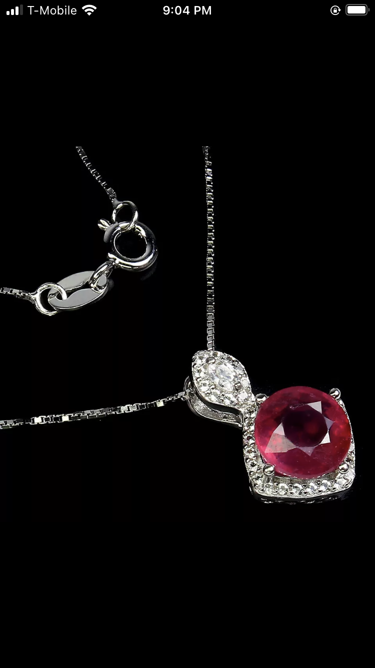 A stunning 8mm round faceted, Genuine Ruby. A treasure to cherish that is a classic, surrounded by Genuine White Topaz and set in .925 Sterling Silver on an 18” sterling silver chain. Sure to become a future heirloom in your family.