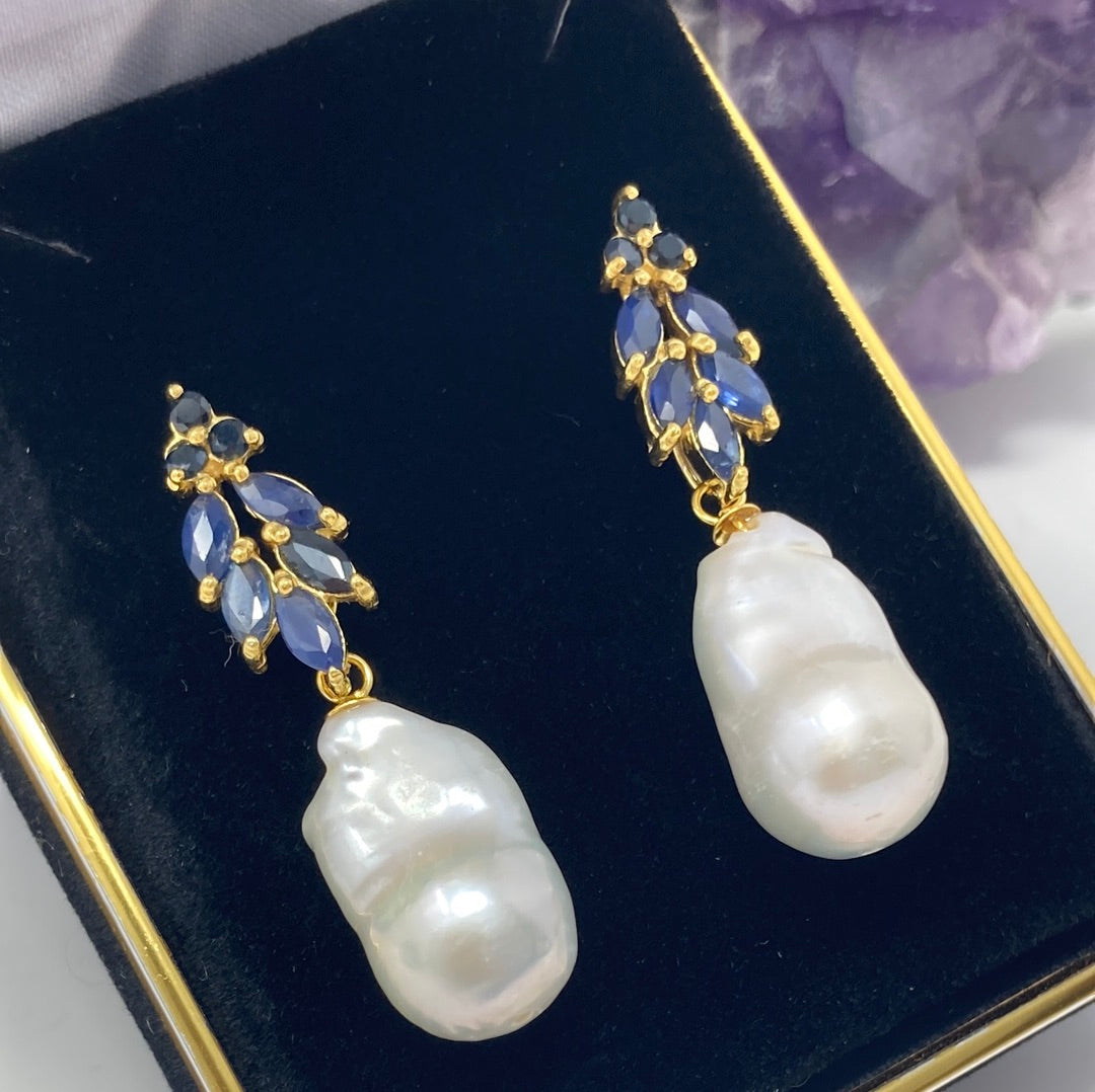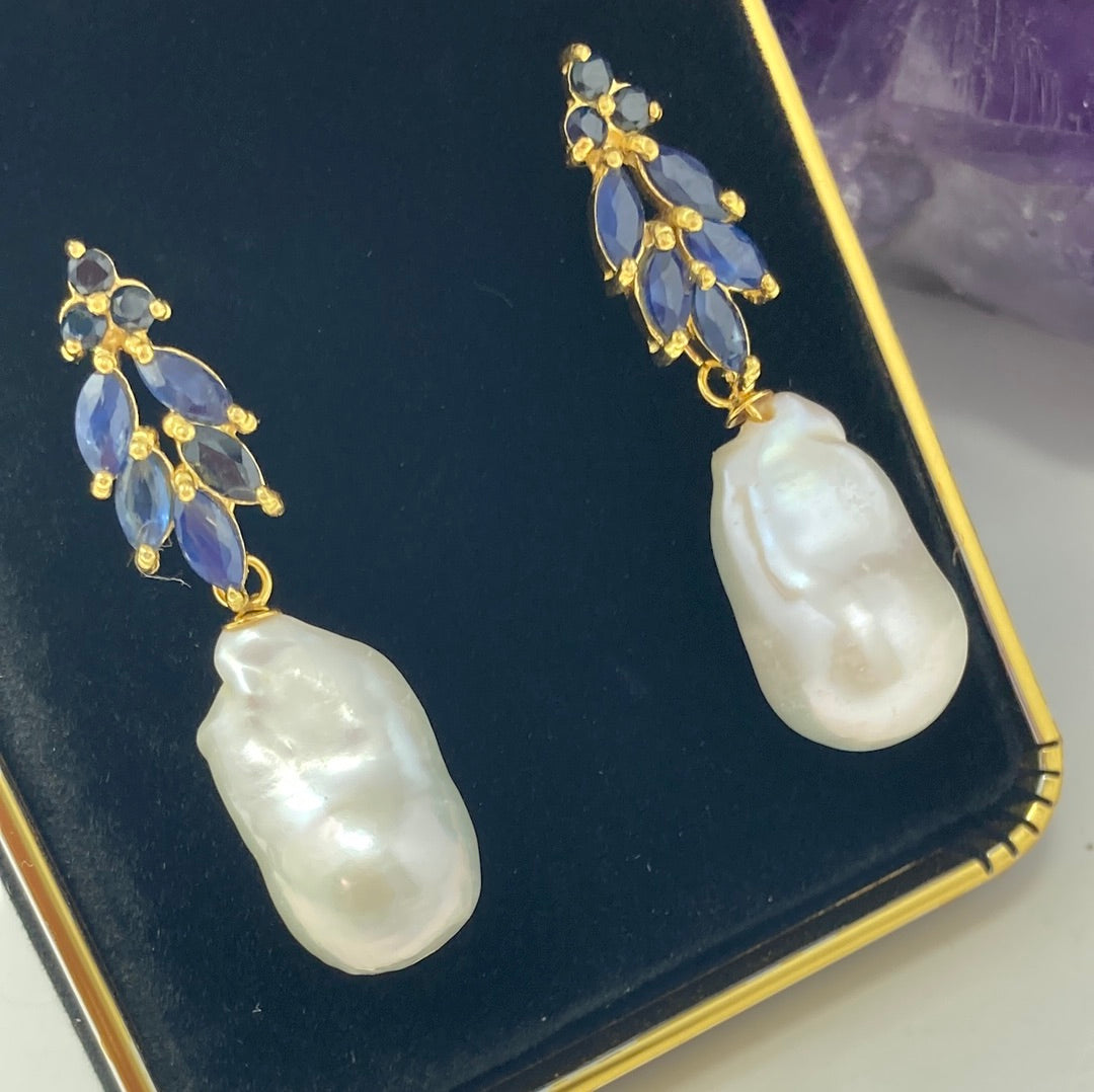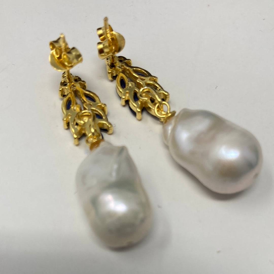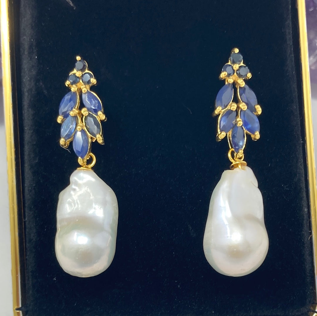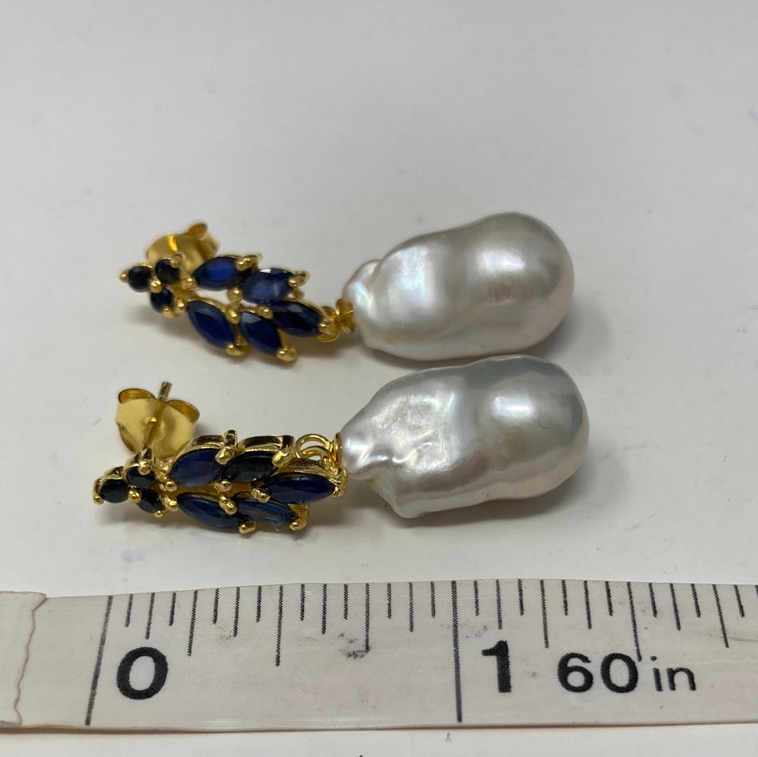 A gorgeous, timeless classic, these earrings sets you apart with distinction. Genuine marquee Sapphires accent these glamorous natural baroque Pearl earrings. You have the best of both worlds, genuine Sapphires and lustrous baroque pearls. Refined elegance, invest in lifetime jewelry to become future heirlooms for your collection. Approx 1 1/4” long