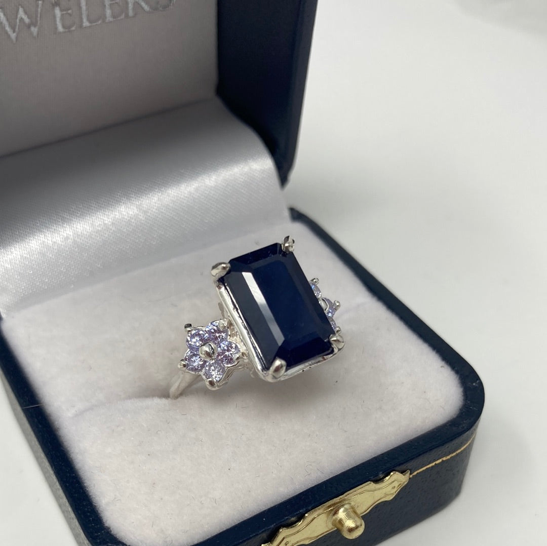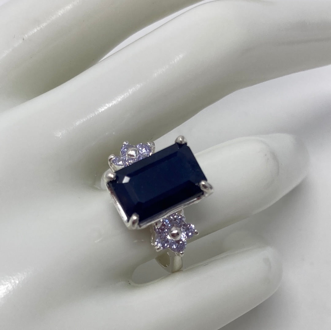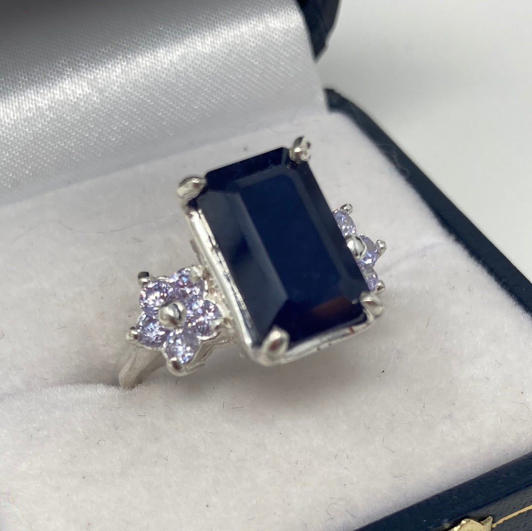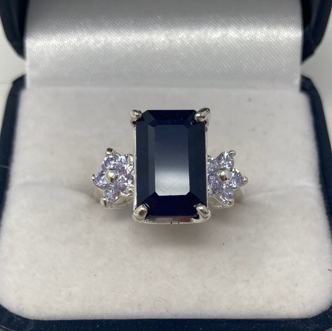 Genuine faceted 13mm by 8mm Sapphire, elegance always is a step in the right direction as you wear genuine gemstones. These Sapphire earrings have that rich deep blue, accented with genuine Amethysts as a lovely contrast highlighting the beauty of the Sapphire gemstones. Set in .925 Sterling Silver. Size 7 3/4, Resize at your Jeweler