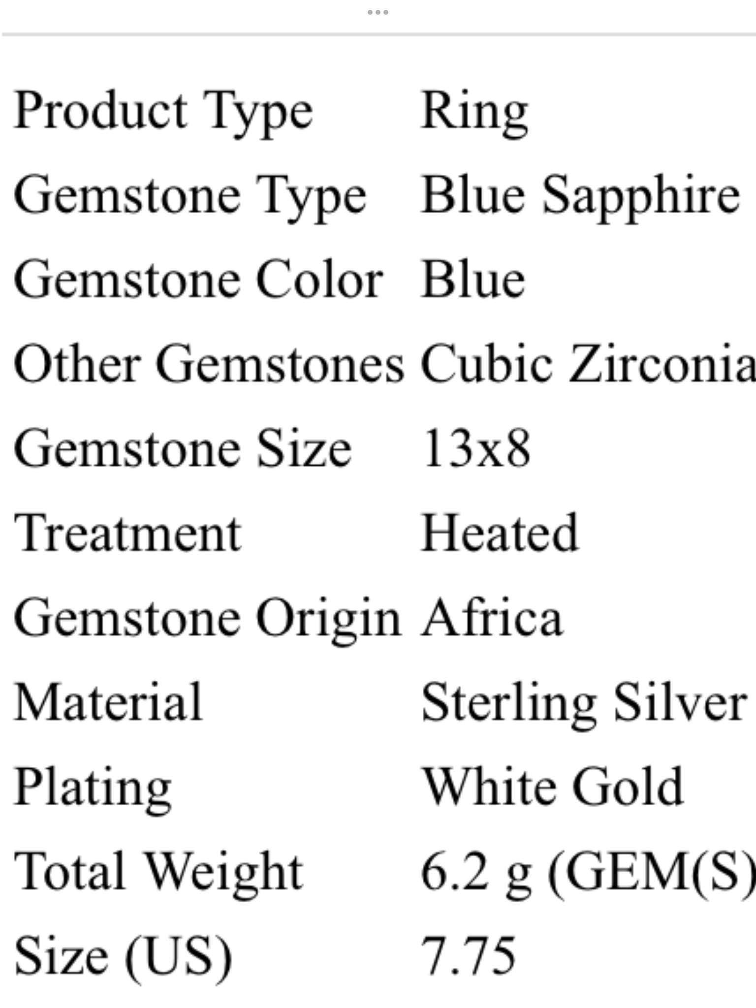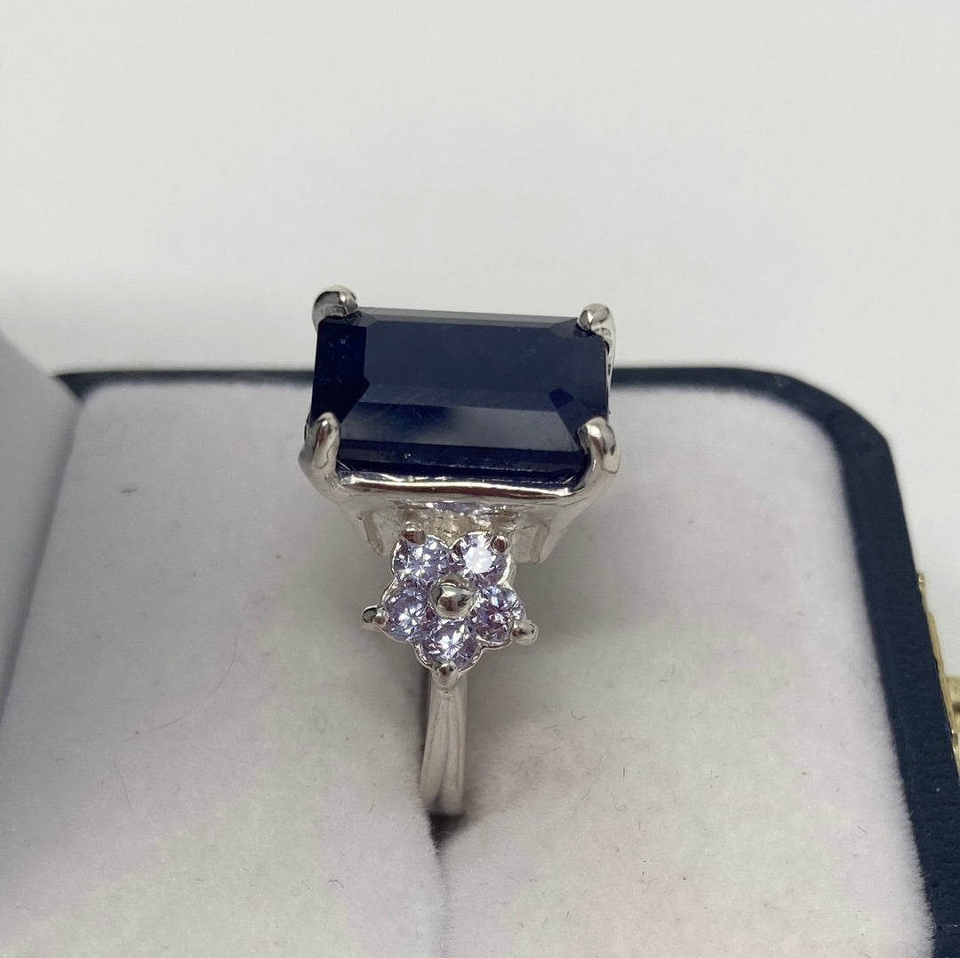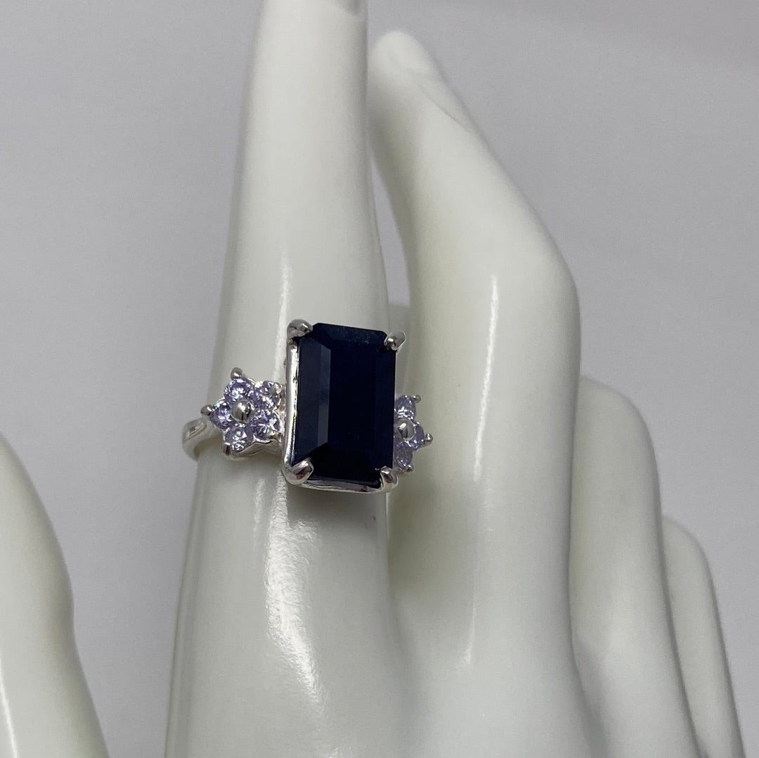 Genuine faceted 13mm by 8mm Sapphire, elegance always is a step in the right direction as you wear genuine gemstones. These Sapphire earrings have that rich deep blue, accented with genuine Amethysts as a lovely contrast highlighting the beauty of the Sapphire gemstones. Set in .925 Sterling Silver. Size 7 3/4, Resize at your Jeweler
