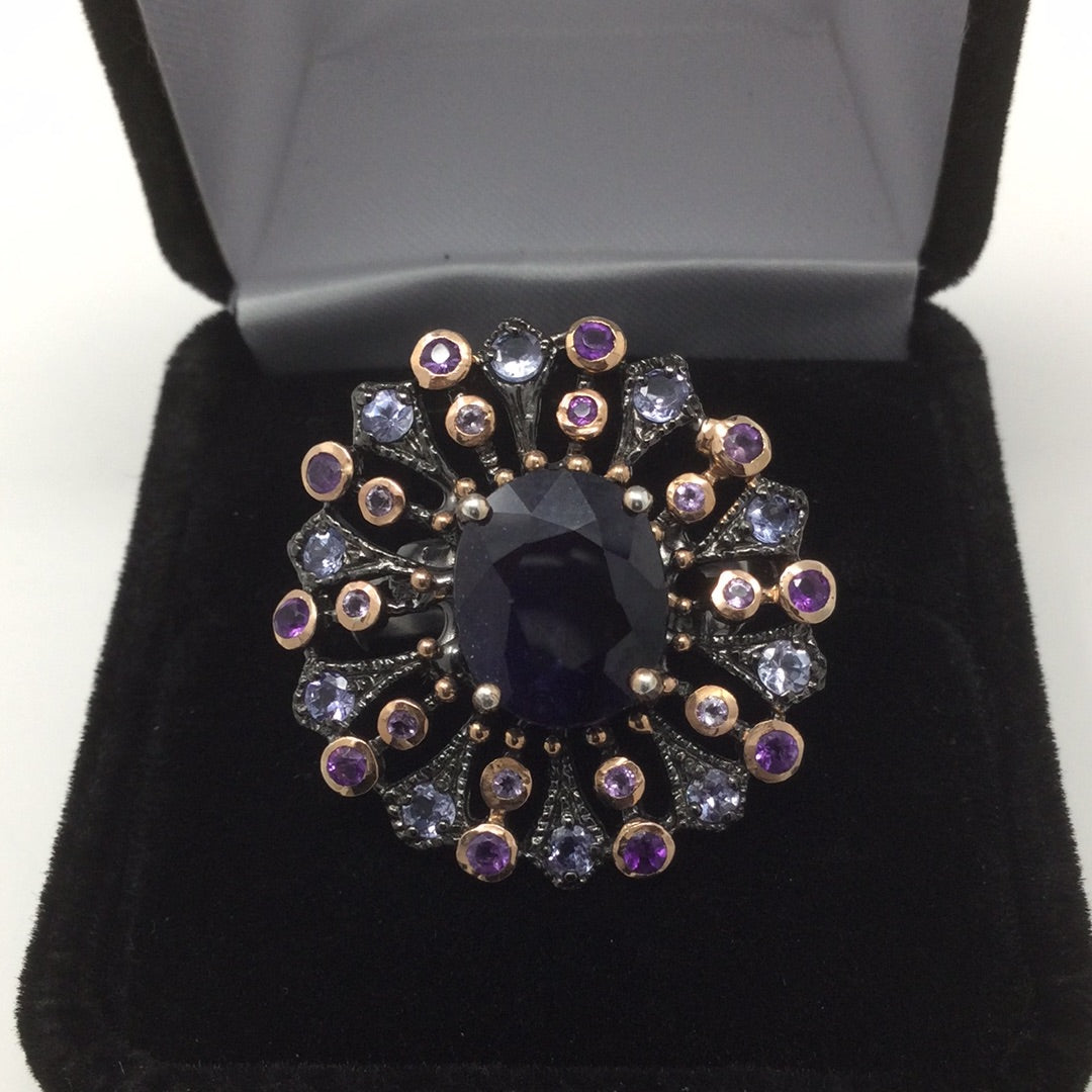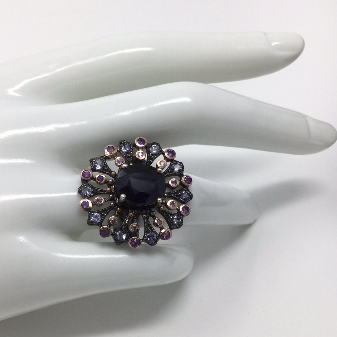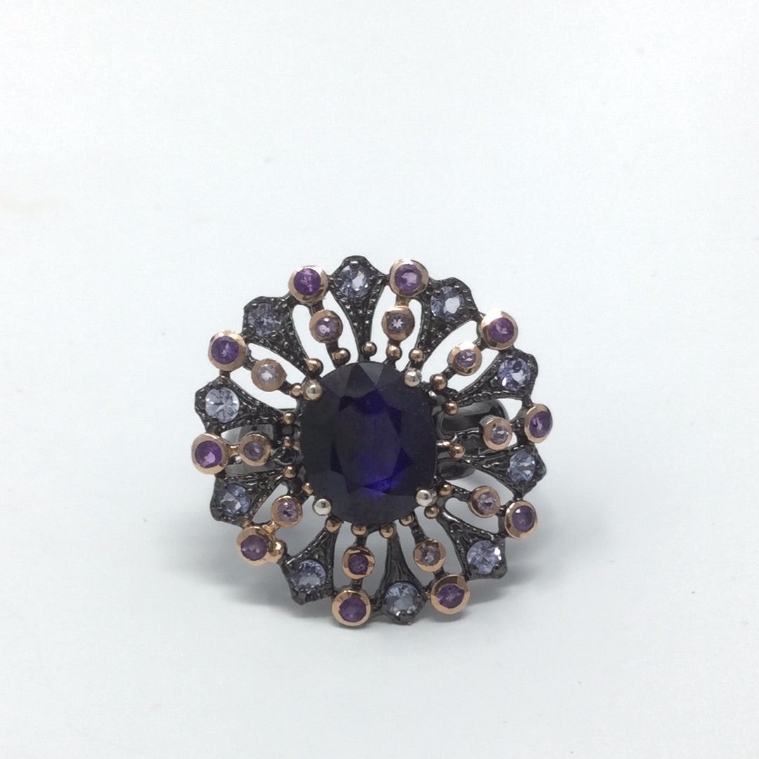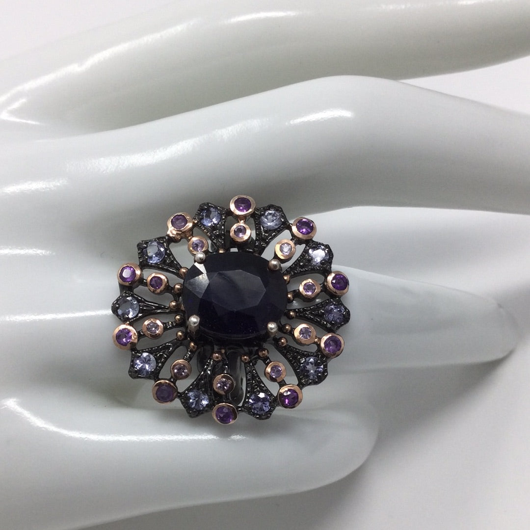 An exclusive custom made ring featuring a genuine deep blue Sapphire measuring Approx 15mm by 10mm. Artfully arranged genuine Amethyst and Tanzanite compliment this Sapphire in a starburst design. Set in .025 in with a Rhodium overlay and accents of Rose gold makes these gems pop. A one of a kind. Size 7 3/4
