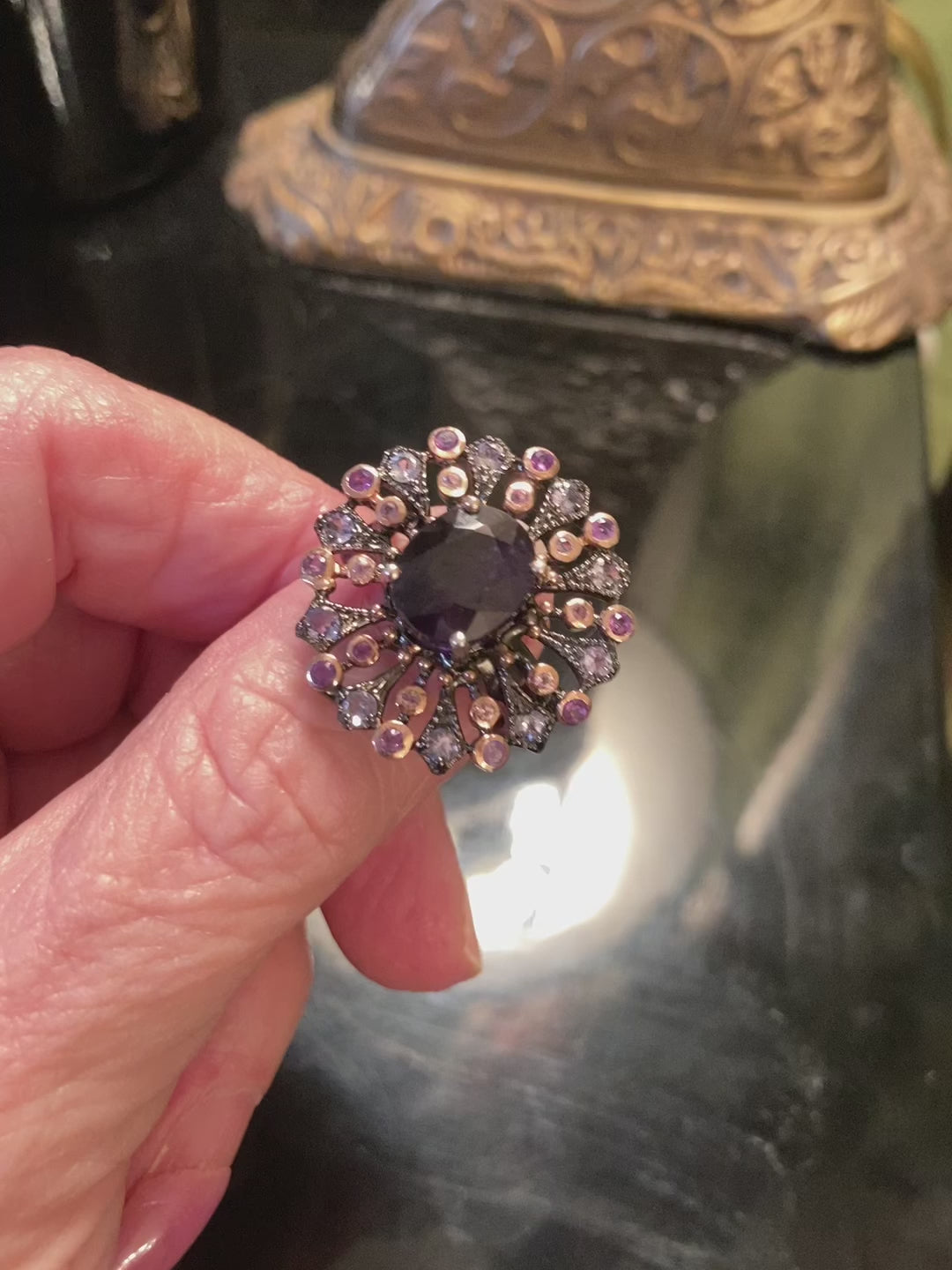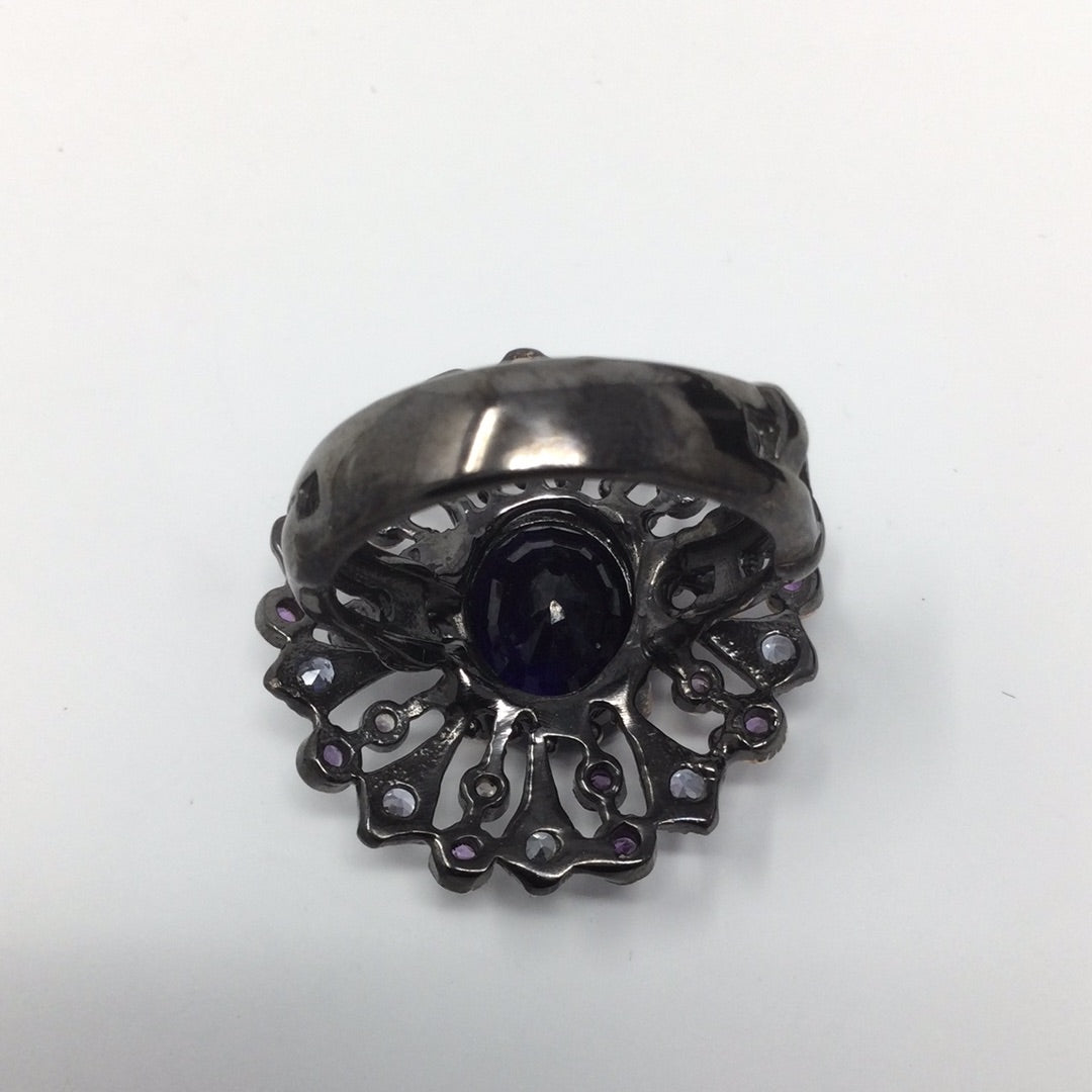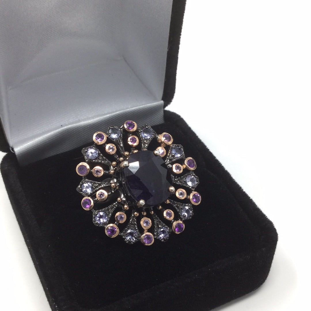 An exclusive custom made ring featuring a genuine deep blue Sapphire measuring Approx 15mm by 10mm. Artfully arranged genuine Amethyst and Tanzanite compliment this Sapphire in a starburst design. Set in .025 in with a Rhodium overlay and accents of Rose gold makes these gems pop. A one of a kind. Size 7 3/4