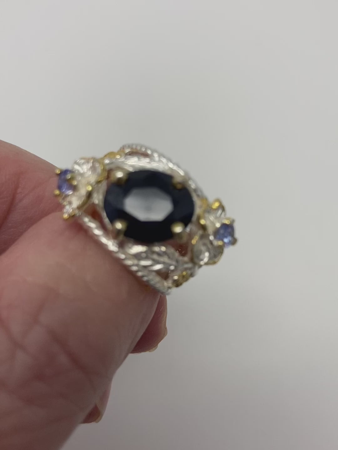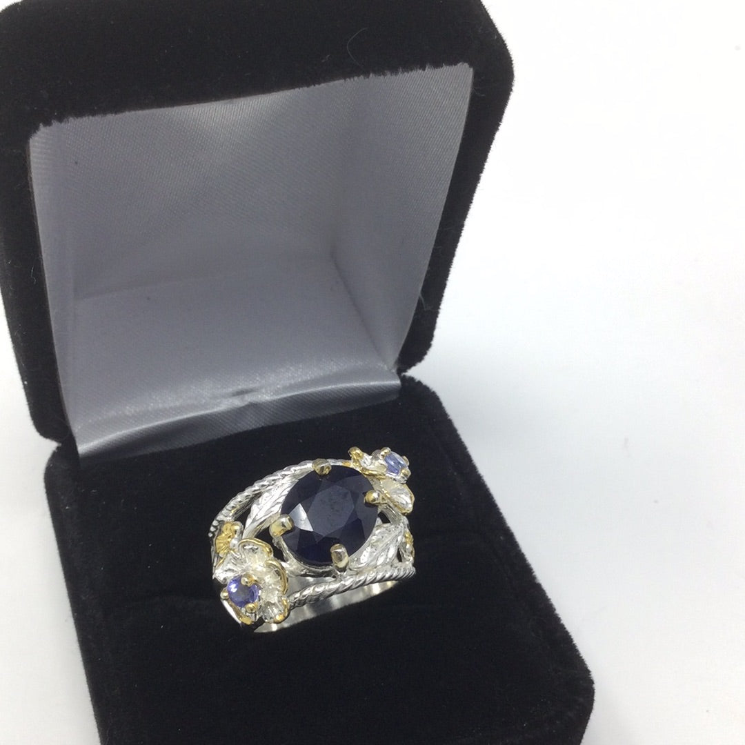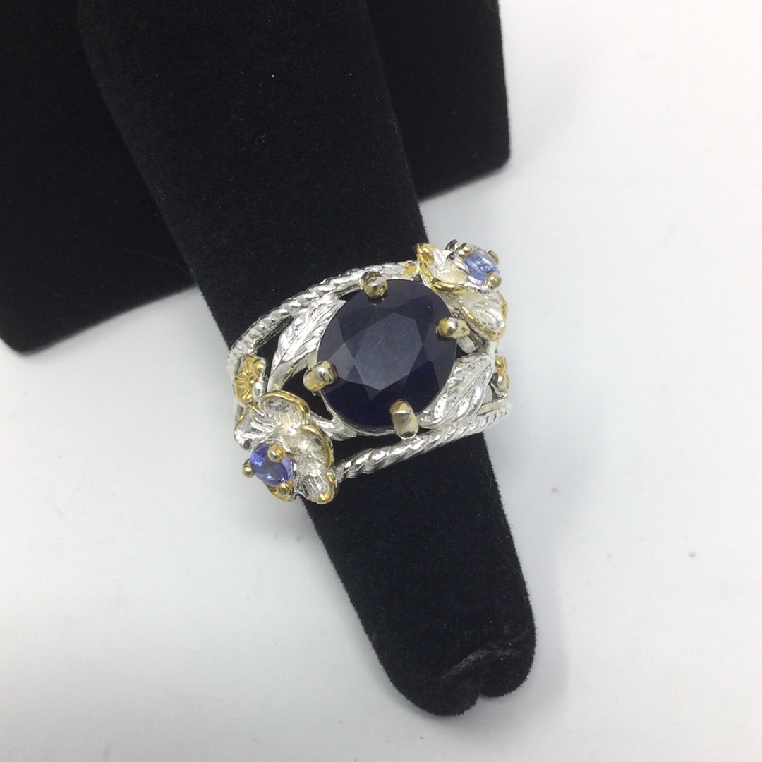 A rich navy blue genuine Sapphire measuring 11mm by 9mm a very nice size set in this custom made setting accented with genuine Tanzanite too. These gemstones were hand picked then this setting was created by artisans in this one of a kind design. The details are exquisite in this .925 setting with a 14K white and yellow gold overlay. Nice solid setting very well made, Sapphires in this size are not readily available, this is one you’ll want for your genuine gemstone jewelry collection. Size 5, Resize at your jeweler.