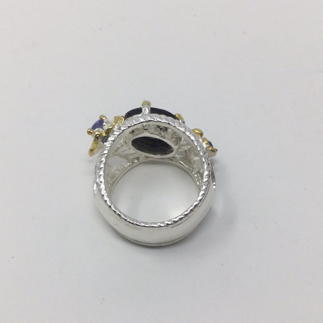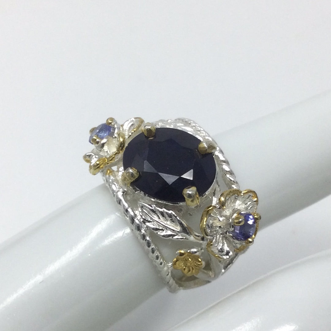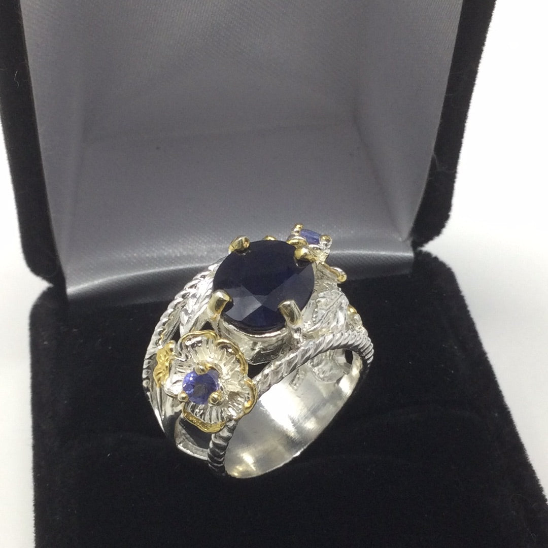 A rich navy blue genuine Sapphire measuring 11mm by 9mm a very nice size set in this custom made setting accented with genuine Tanzanite too. These gemstones were hand picked then this setting was created by artisans in this one of a kind design. The details are exquisite in this .925 setting with a 14K white and yellow gold overlay. Nice solid setting very well made, Sapphires in this size are not readily available, this is one you’ll want for your genuine gemstone jewelry collection. Size 5, Resize at your jeweler.