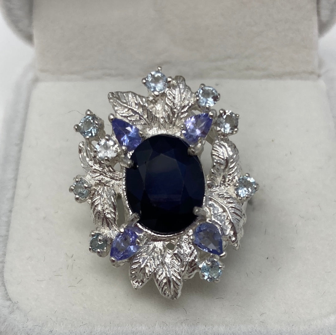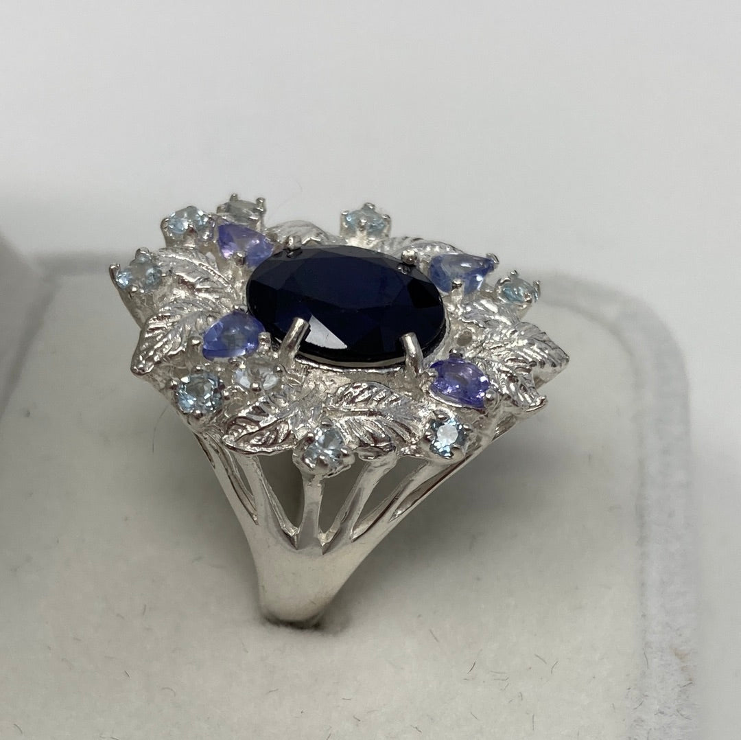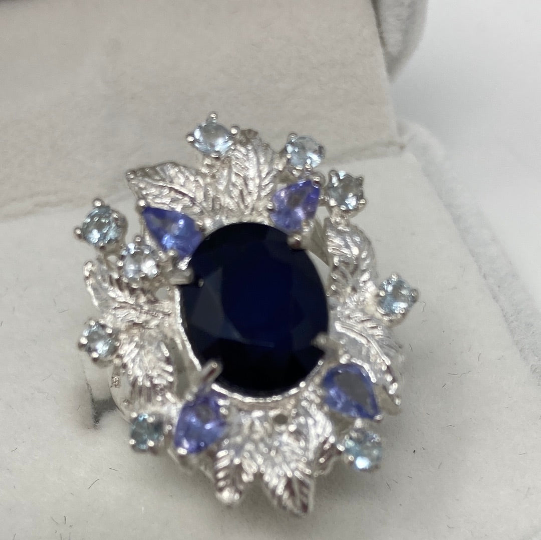 Sensual Genuine Sapphire encrusted with Genuine Tanzanites and Blue Topaz. It’s a sensational ring that looks similar to a high end Beverly Hills, Henry Winston treasure. This is a hand crafted, custom made on of a kind ring. If this were set in 14K gold it would be several thousand dollars. This breathtaking ring is set in .925 Sterling Silver, notice the details and you’ll see the pear shaped faceted Tanzanites, the attention to detail is amazing. Usually found in very high end gemstones. Invest in genuine gemstones. Size 6 1/4 Resize at your jeweler or use a ring guard