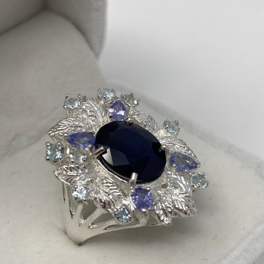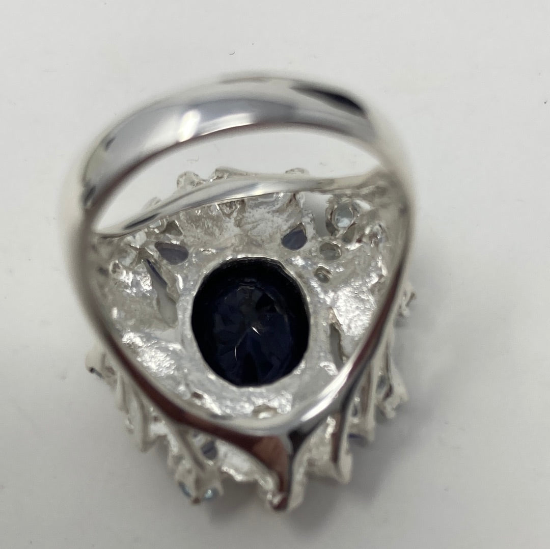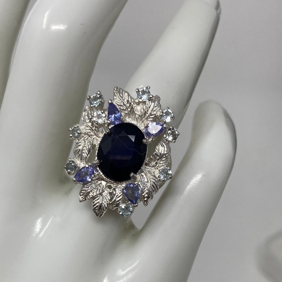 Sensual Genuine Sapphire encrusted with Genuine Tanzanites and Blue Topaz. It’s a sensational ring that looks similar to a high end Beverly Hills, Henry Winston treasure. This is a hand crafted, custom made on of a kind ring. If this were set in 14K gold it would be several thousand dollars. This breathtaking ring is set in .925 Sterling Silver, notice the details and you’ll see the pear shaped faceted Tanzanites, the attention to detail is amazing. Usually found in very high end gemstones. Invest in genuine gemstones. Size 6 1/4 Resize at your jeweler or use a ring guard