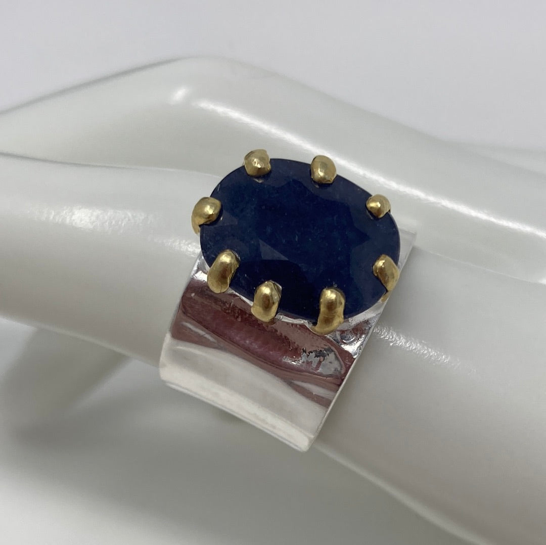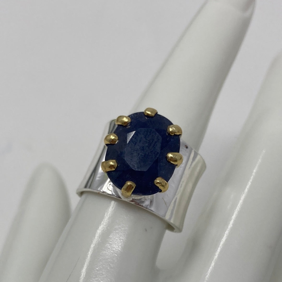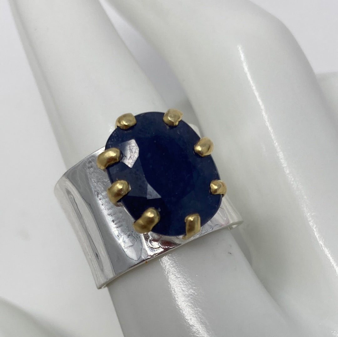 Look at this gorgeous 12 CTW Genuine Sapphire that looks magnificent in this custom made, one of a kind setting for this gemstone. The prongs are artfully done with a edgy look to show off this 14mm by 11mm gemstone to its best advantage. Set in .925 Sterling Silver with touches of yellow gold accents on the prongs. These larger Sapphires are harder to come by, I hope you’ll fulfill your desire to be the queen and wear this crown jewel like royalty. Size 7 1/1