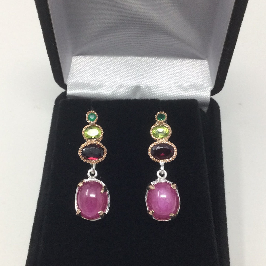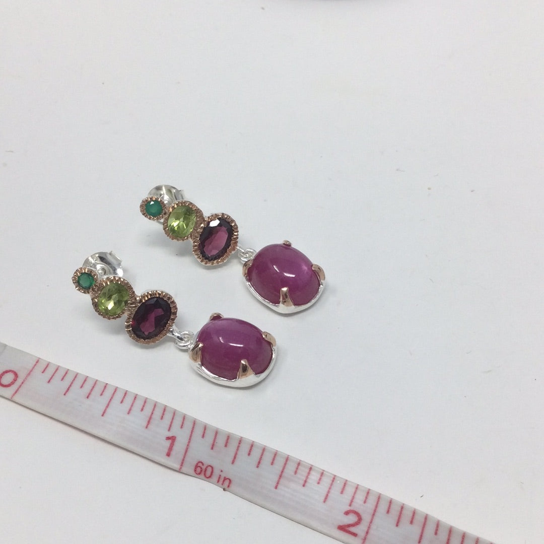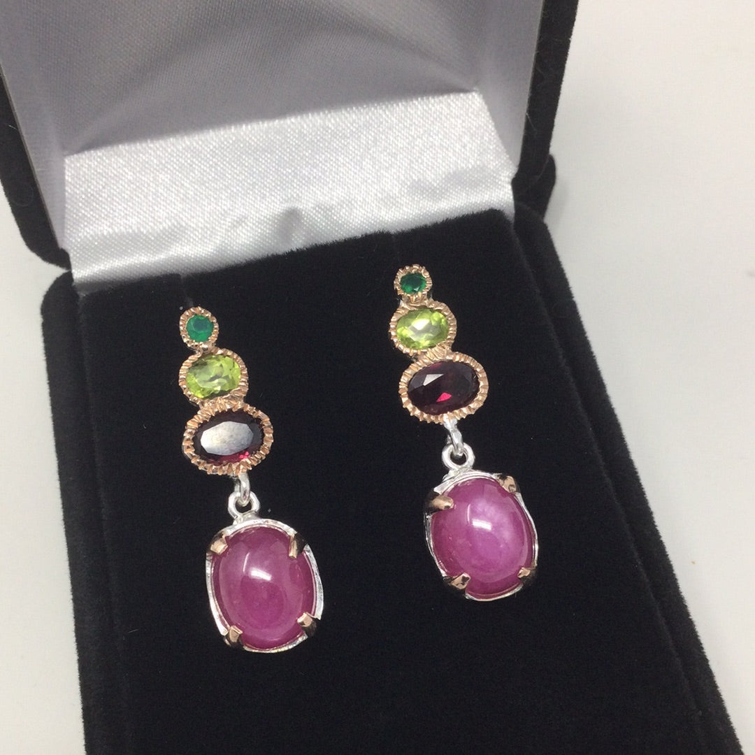 Rare Genuine Pink Star Rubies, 10mm by 8mm treasured gemstones that are very difficult to obtain. These are accented with genuine faceted Garnets and Peridot and Green Onyx, a symphony of gems. These are simply exquisite and to frame your face in splendor. Notice the shimmer of the Star as it moves across the stone, the stunning, wonderful artistic treasures in this beautiful earth. Set in .925 sterling silver with accent of rose gold. Custom made, one of a kind, never mass produced. Approximately a little over and inch long