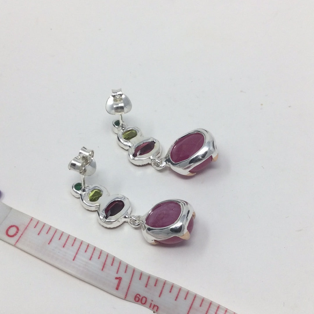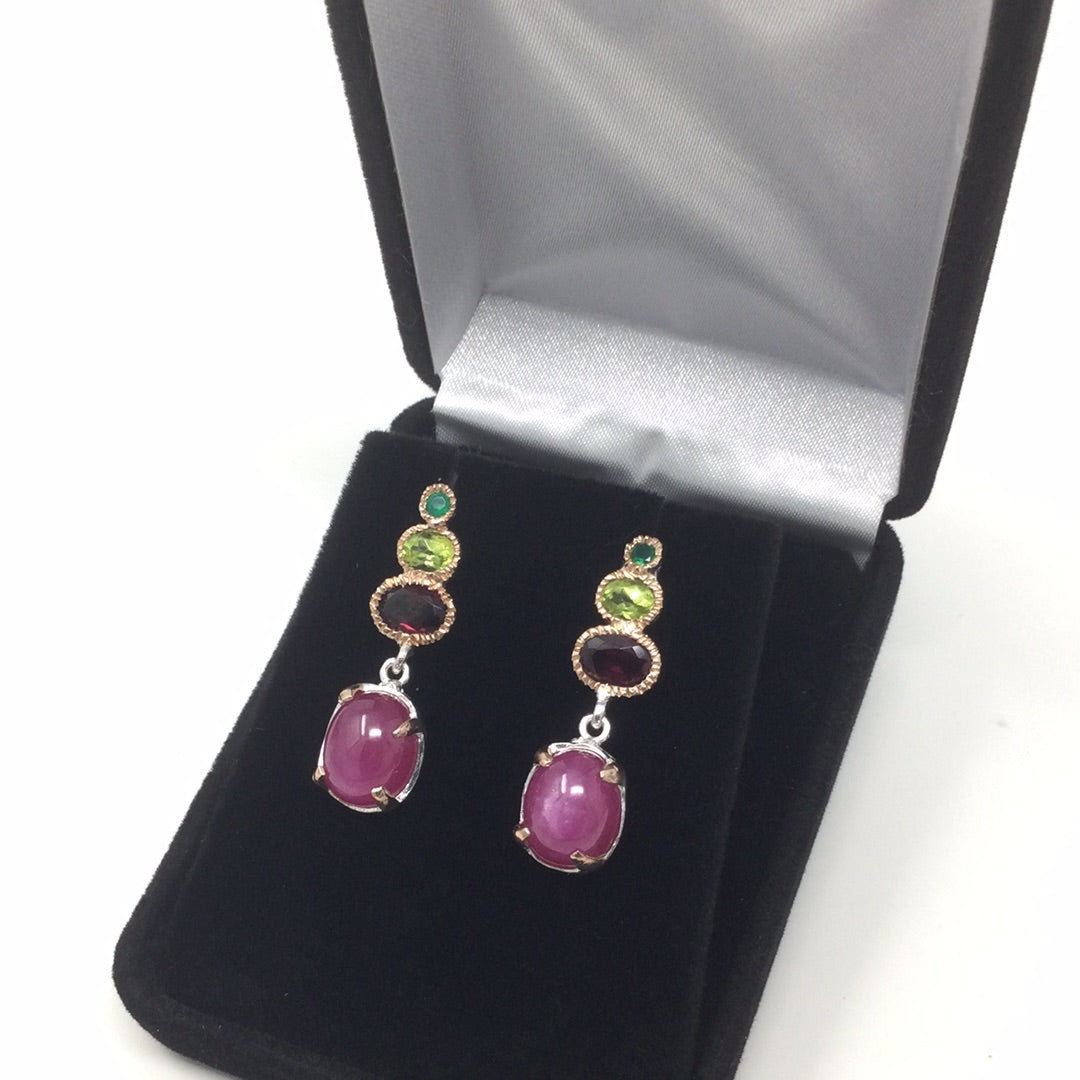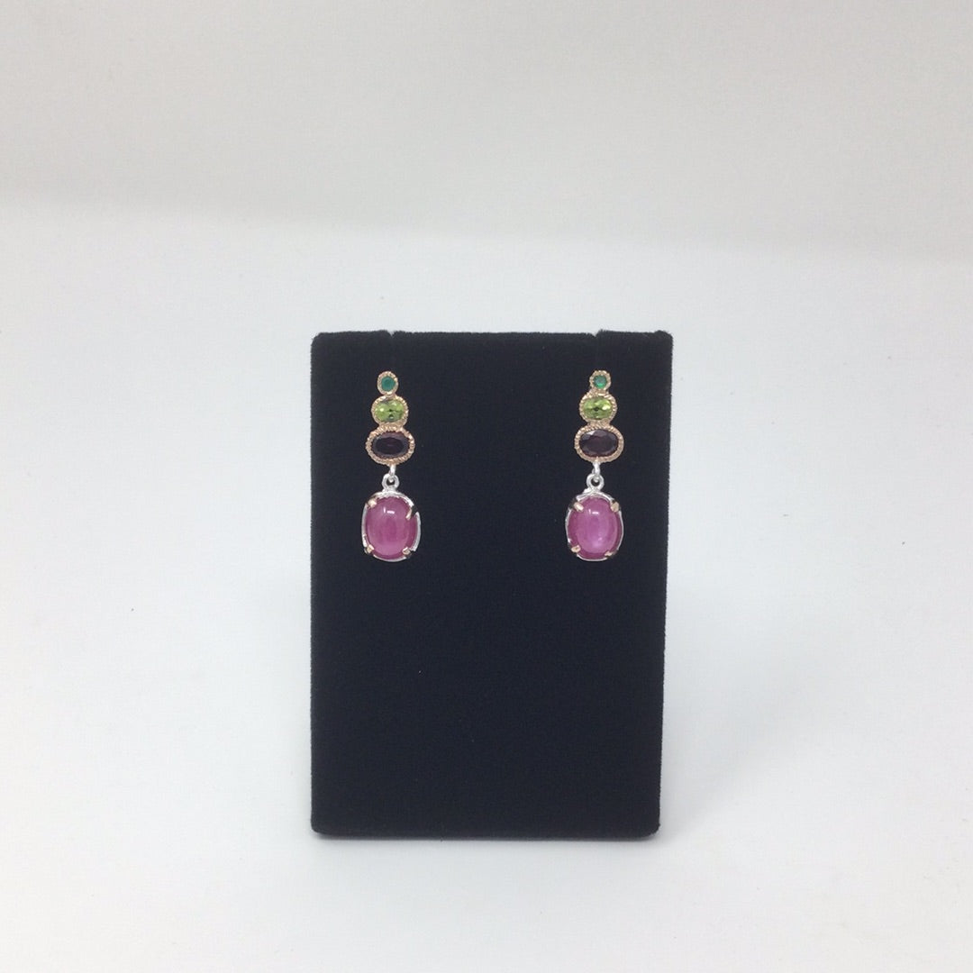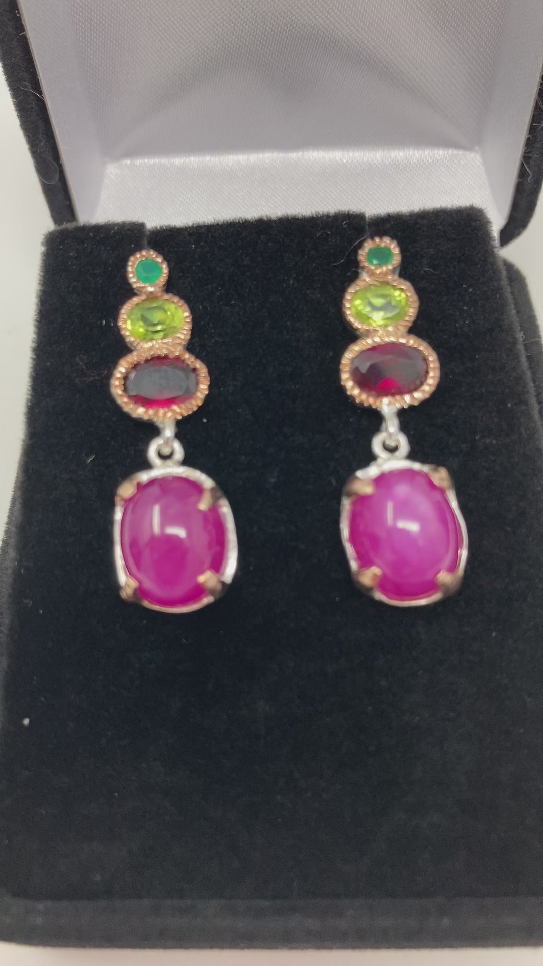 Rare Genuine Pink Star Rubies, 10mm by 8mm treasured gemstones that are very difficult to obtain. These are accented with genuine faceted Garnets and Peridot and Green Onyx, a symphony of gems. These are simply exquisite and to frame your face in splendor. Notice the shimmer of the Star as it moves across the stone, the stunning, wonderful artistic treasures in this beautiful earth. Set in .925 sterling silver with accent of rose gold. Custom made, one of a kind, never mass produced. Approximately a little over and inch long