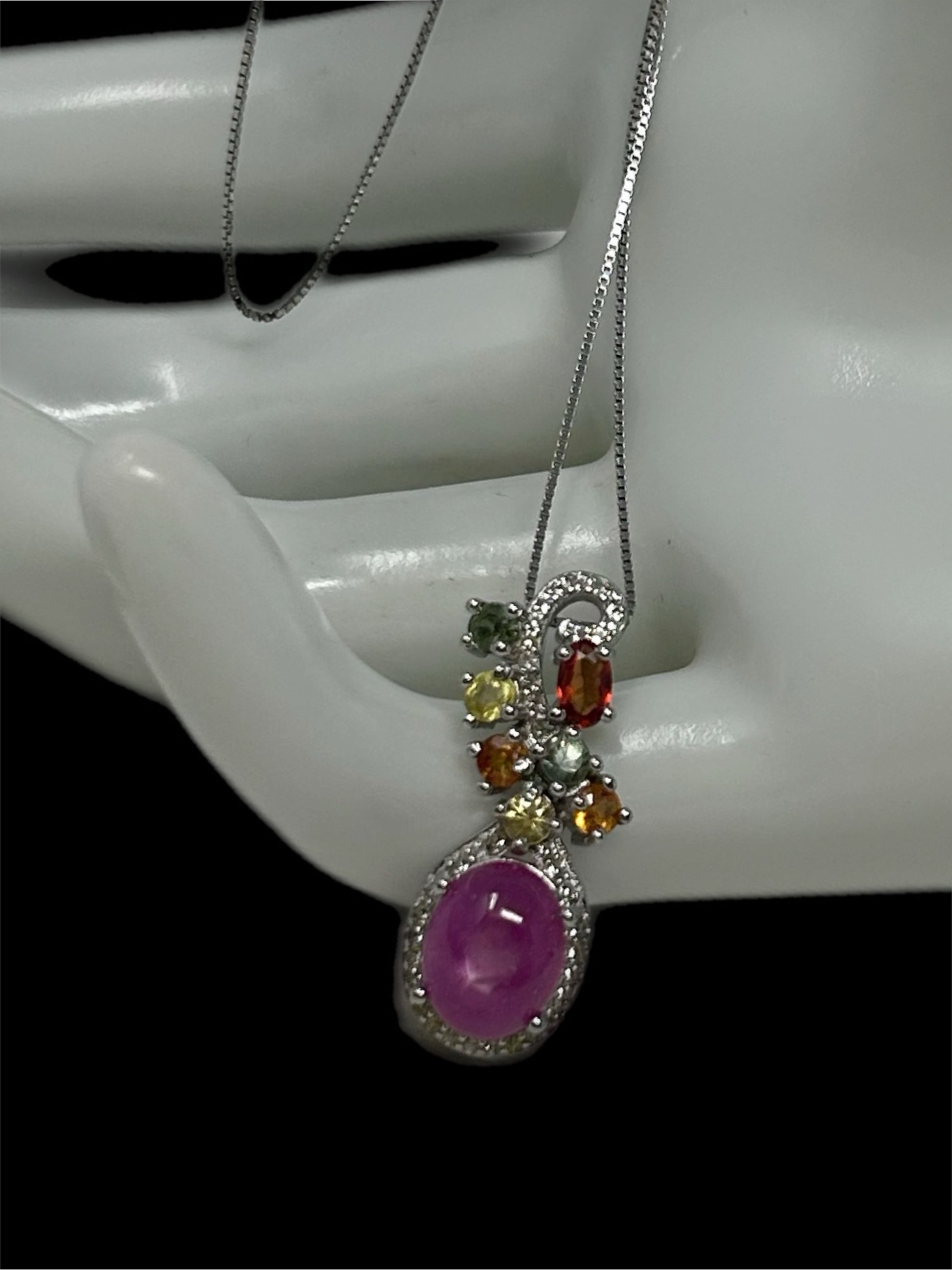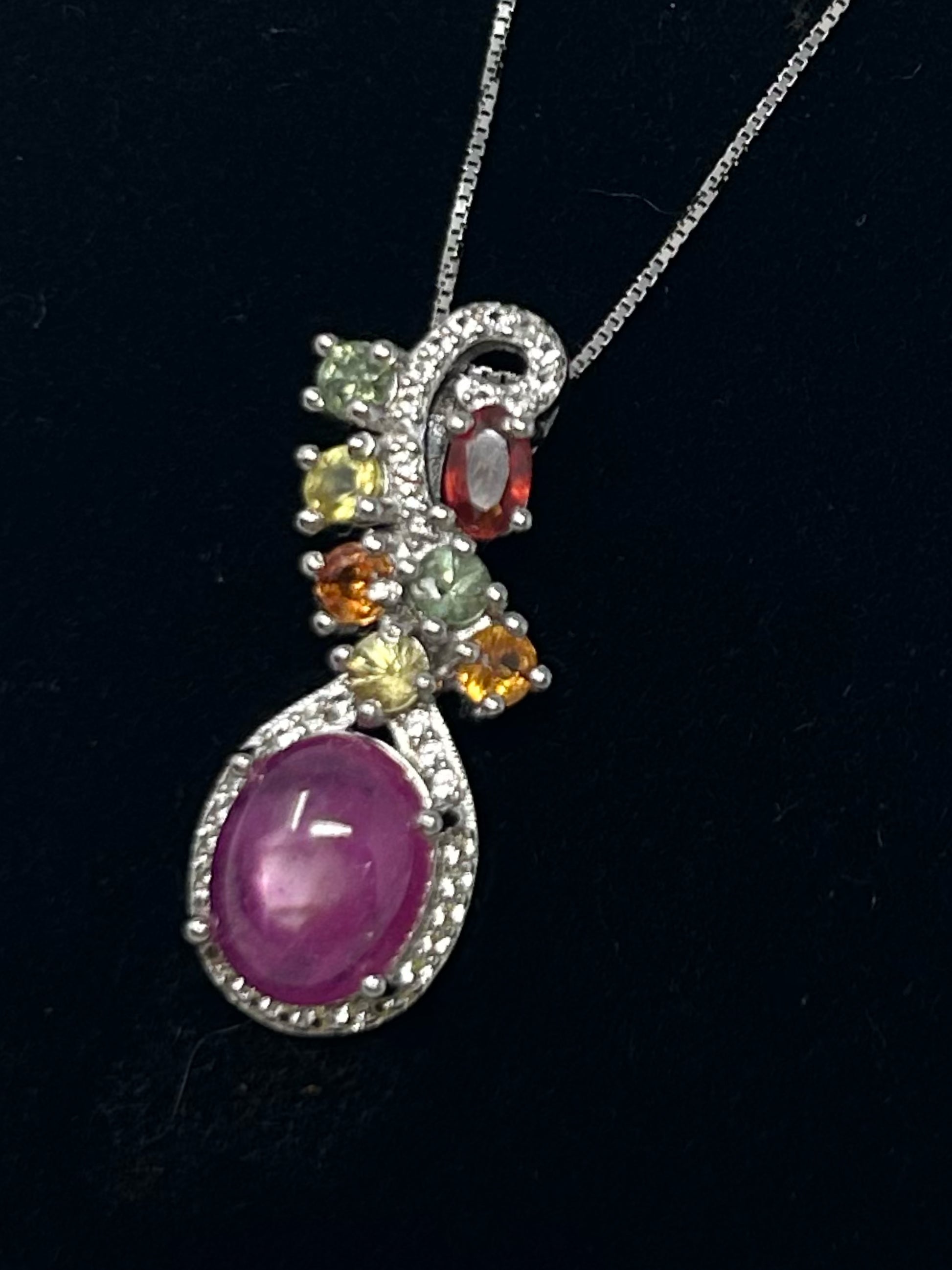 An exceptional treasure featuring a Genuine Star Ruby, look at the mesmerizing star moving across the surface of this gemstone. It is enchanting and a future family heirloom. Approximately 3 CTW set in .925 sterling silver on an 18” sterling silver chain. Notice the orange Sapphire and the Tourmaline's, a gemstone work of art.