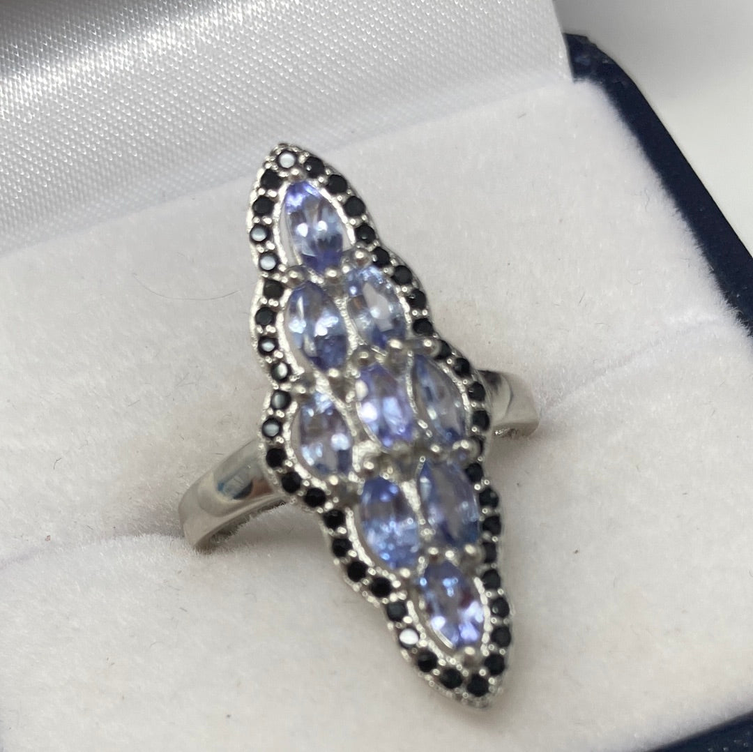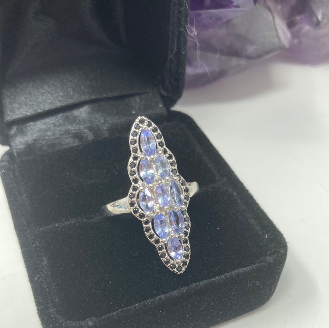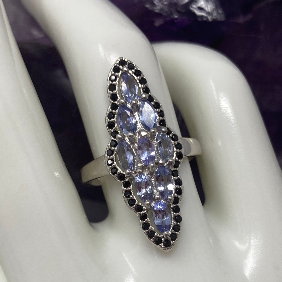 This is a one of a kind, featuring all genuine faceted Tanzanites. Please notice the detailing, the Tanzanite are faceted in a marquee cut and surrounded by genuine Black Spinels. It’s a work of art to wear, it has an Art Deco design that is a timeless classic. Set in .925 Sterling Silver, this is a lifetime investment in genuine gemstones. Size 7, Resize at your jeweler.