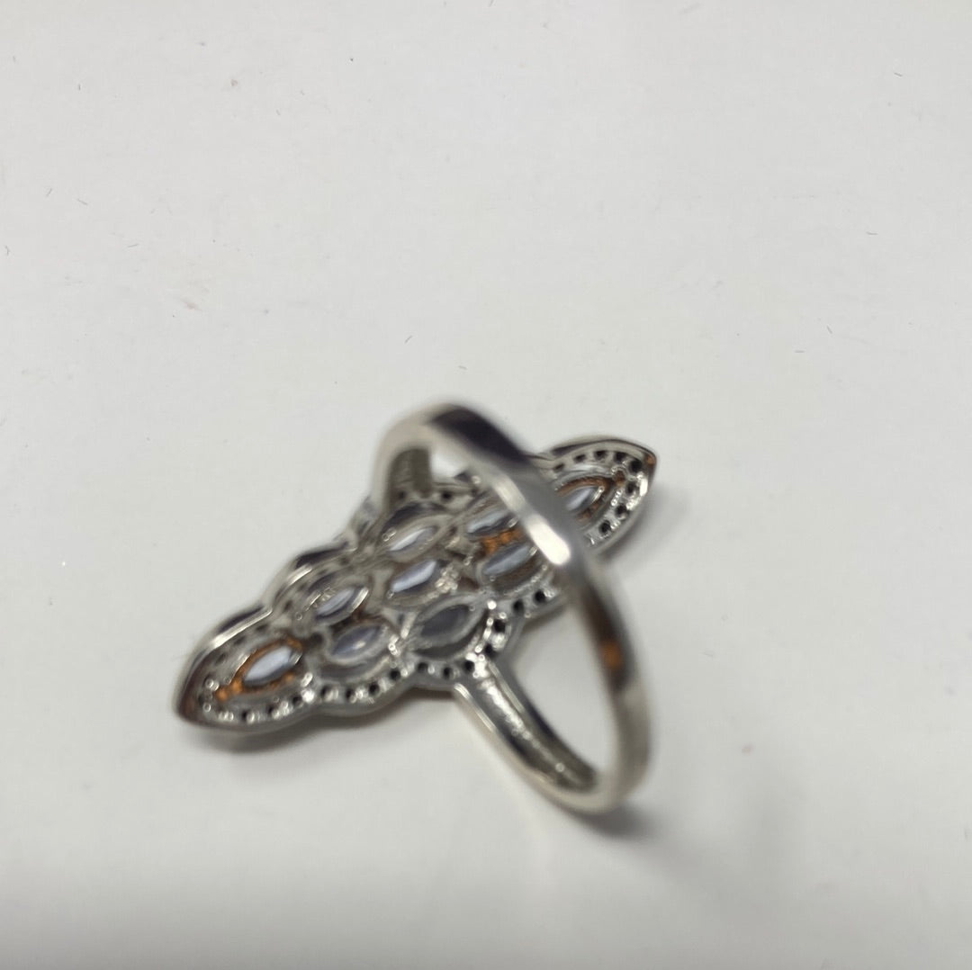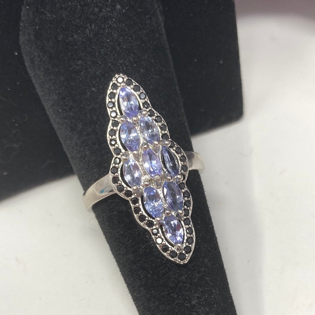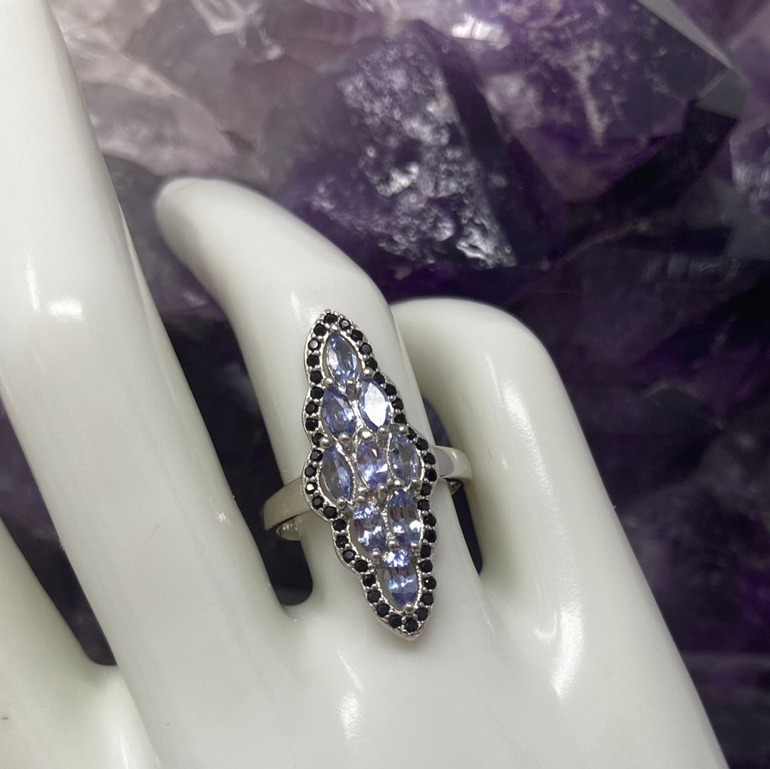 This is a one of a kind, featuring all genuine faceted Tanzanites. Please notice the detailing, the Tanzanite are faceted in a marquee cut and surrounded by genuine Black Spinels. It’s a work of art to wear, it has an Art Deco design that is a timeless classic. Set in .925 Sterling Silver, this is a lifetime investment in genuine gemstones. Size 7, Resize at your jeweler.