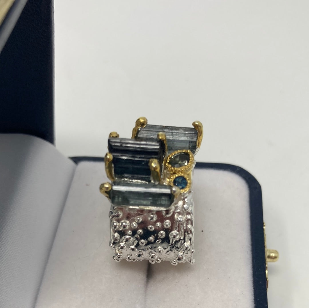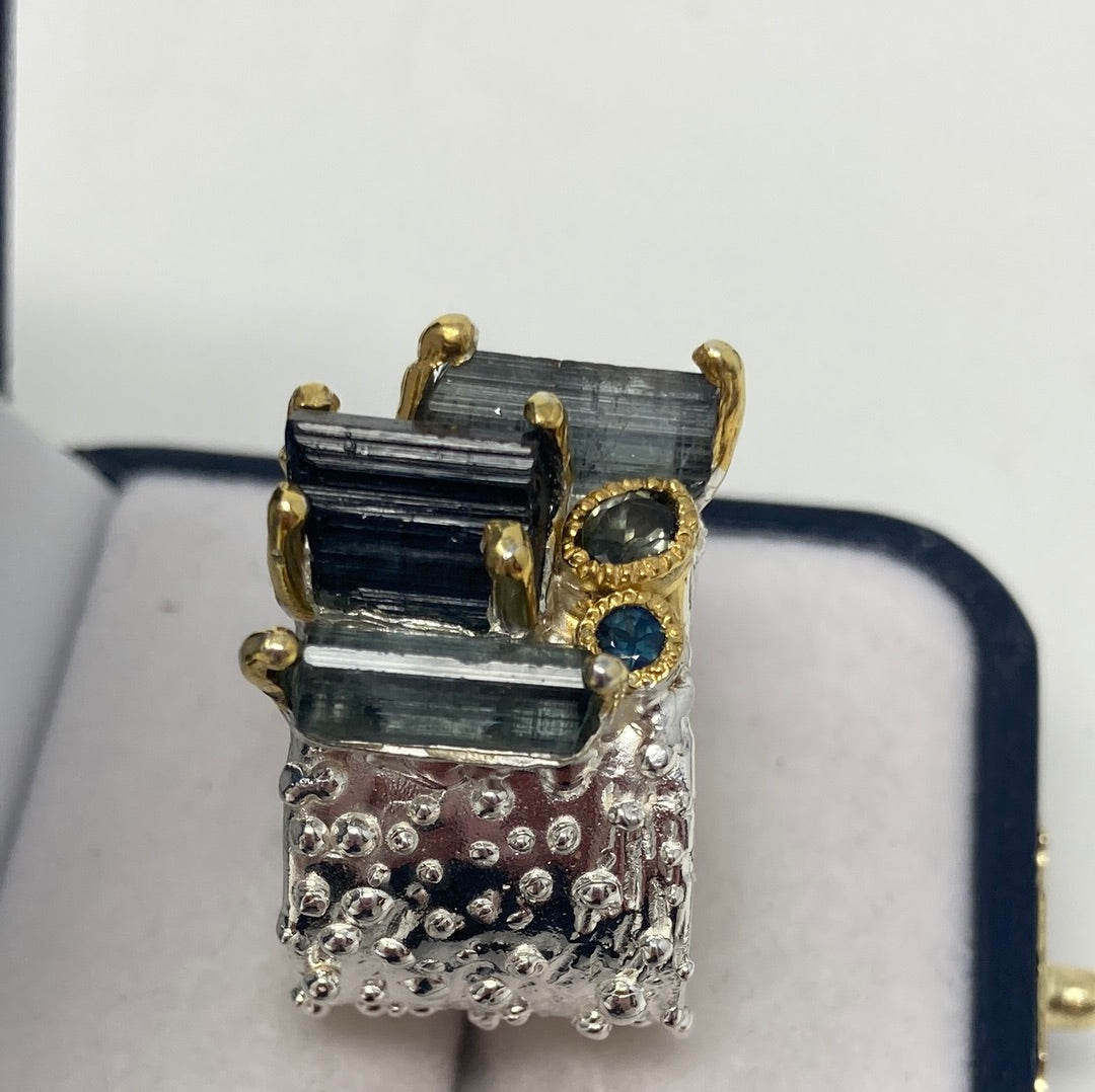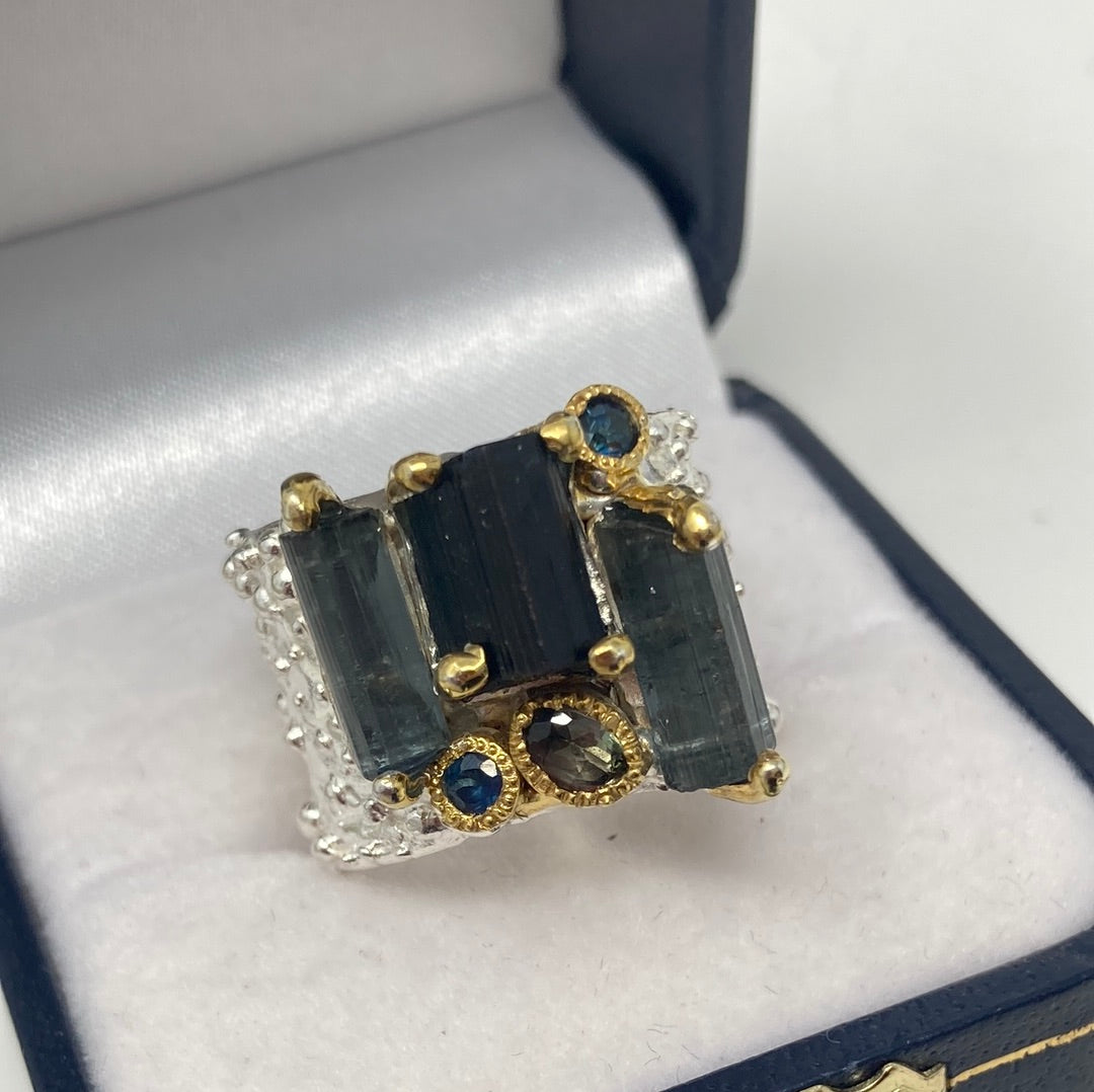An enchanting way to wear natural green Tourmalines, artfully arranged in this contemporary setting. This is a custom crafted, one of a kind design, each gemstone hand selected by the artisan for quality, like an artist except not using paint but genuine gemstones. The accent stones are genuine Sapphires intricately encircled in gold. Crafted in .925 Sterling Silver. Size 8