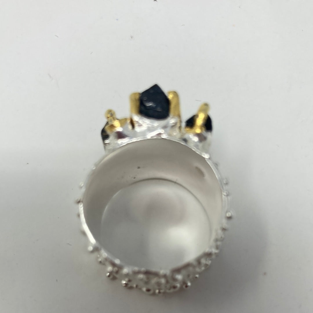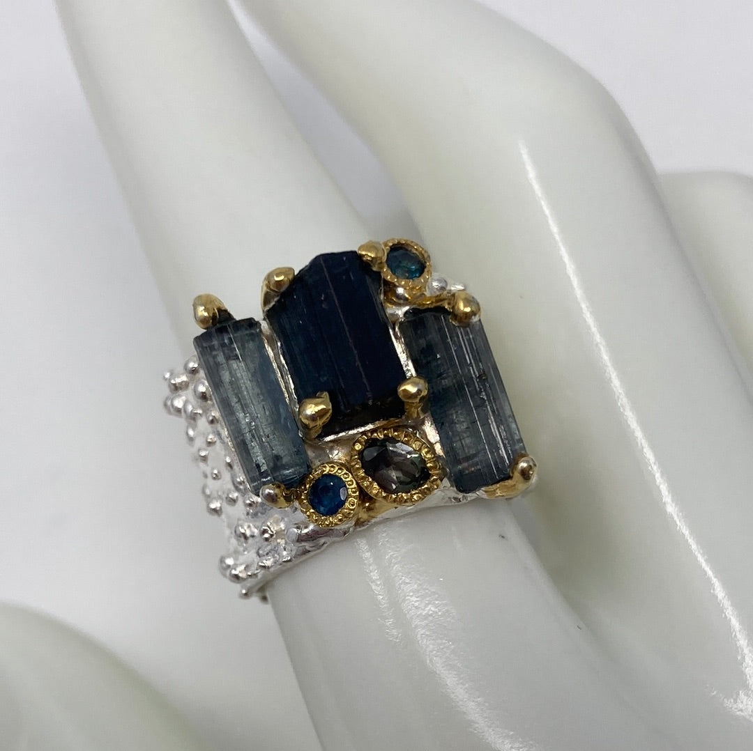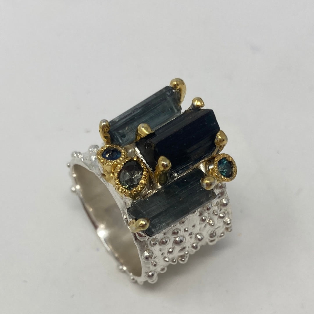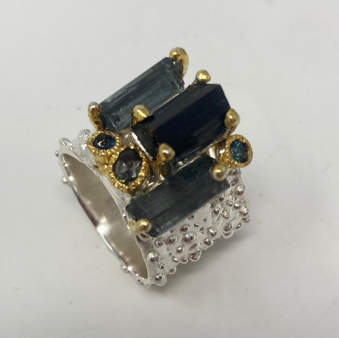 An enchanting way to wear natural green Tourmalines, artfully arranged in this contemporary setting. This is a custom crafted, one of a kind design, each gemstone hand selected by the artisan for quality, like an artist except not using paint but genuine gemstones. The accent stones are genuine Sapphires intricately encircled in gold. Crafted in .925 Sterling Silver. Size 8