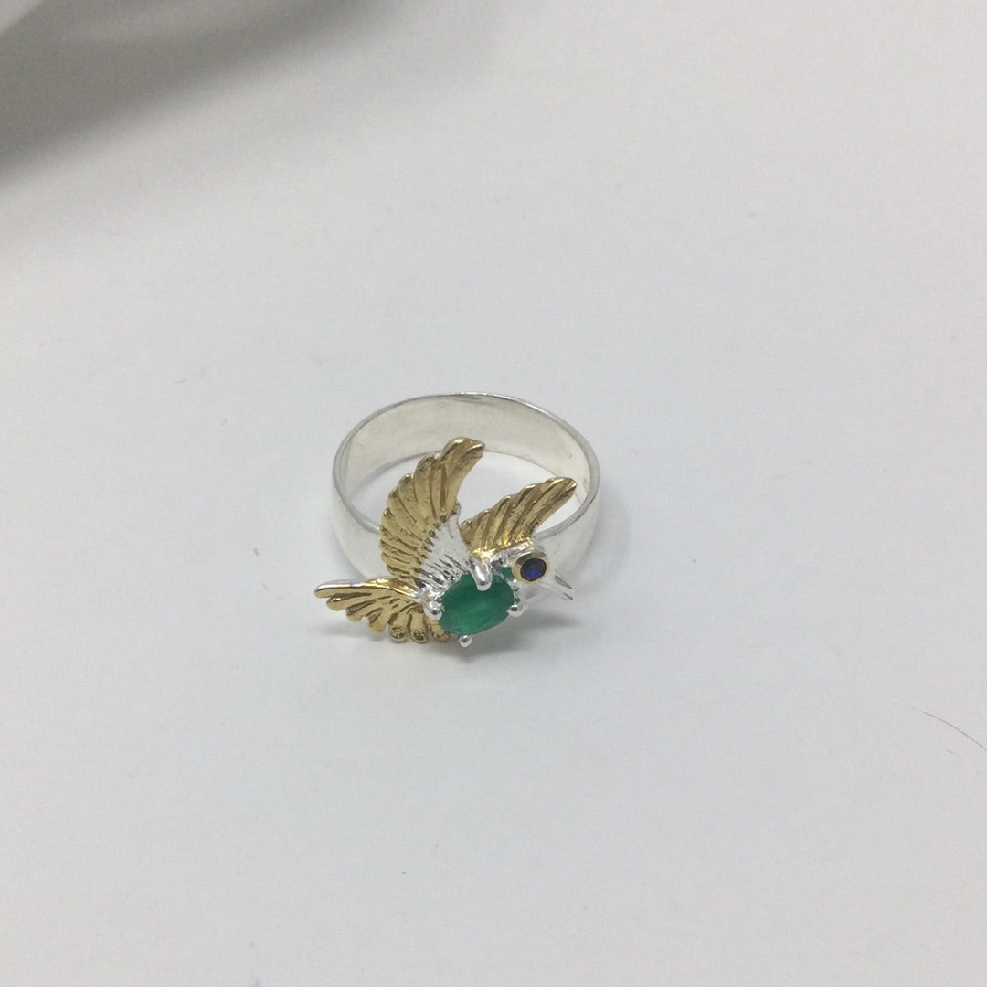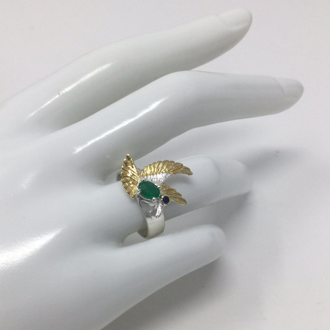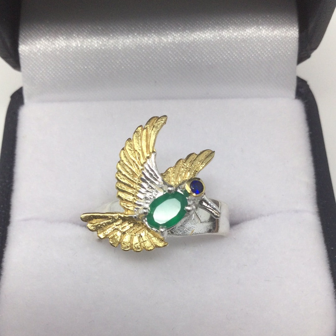 Incredibly sweet, imagine this bird perched upon your finger. All crafted in .925 sterling silver with a 14K white and yellow gold overlay. This ring features a intensely gorgeous genuine Green Onyx and notice that this is a faceted gem. Custom made by a loving hand that engraved the exquisite details on this bird breathing life into it. Size 7