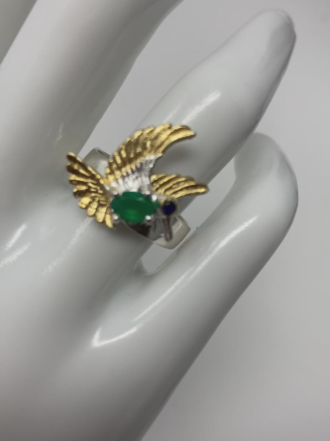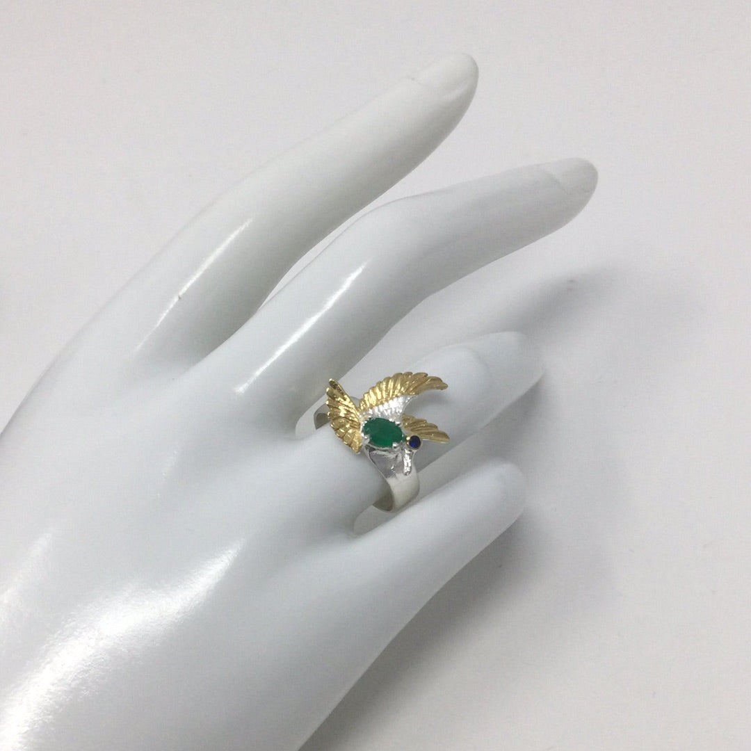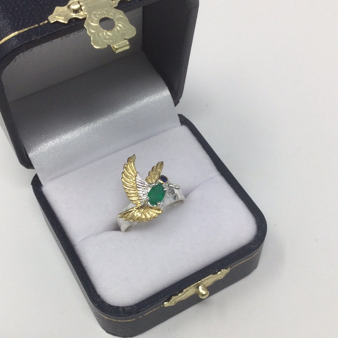 Incredibly sweet, imagine this bird perched upon your finger. All crafted in .925 sterling silver with a 14K white and yellow gold overlay. This ring features a intensely gorgeous genuine Green Onyx and notice that this is a faceted gem. Custom made by a loving hand that engraved the exquisite details on this bird breathing life into it. Size 7