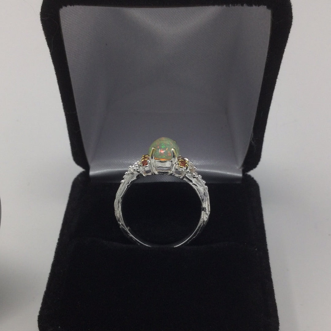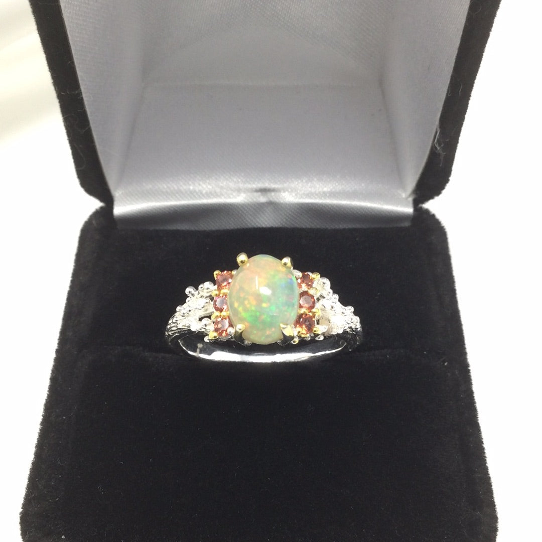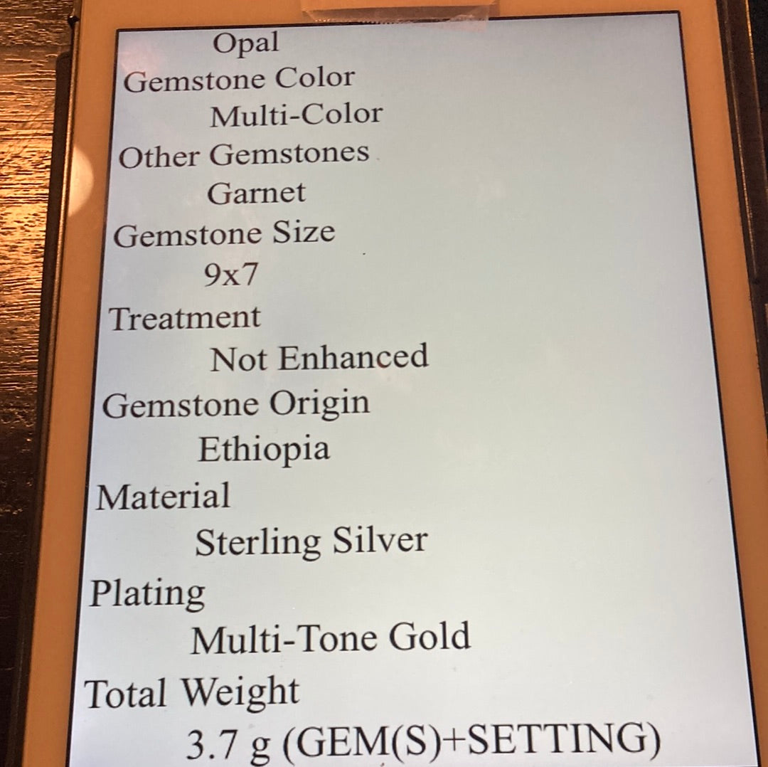 Somebody put the fire out, this Opal is hot, on fire with amazing flashes. This genuine, natural Opal measures 9mm by 7mm and wow is it a great quality gemstone, flanked by genuine Garnets. This ring won’t give you hot flashes but t will thrill and amaze your admirers. Set in .925 sterling silver with a 14K white gold overlay, one of a kind, never mass produced. Size 7 3/4 Resize at your jeweler or use a ring guard.