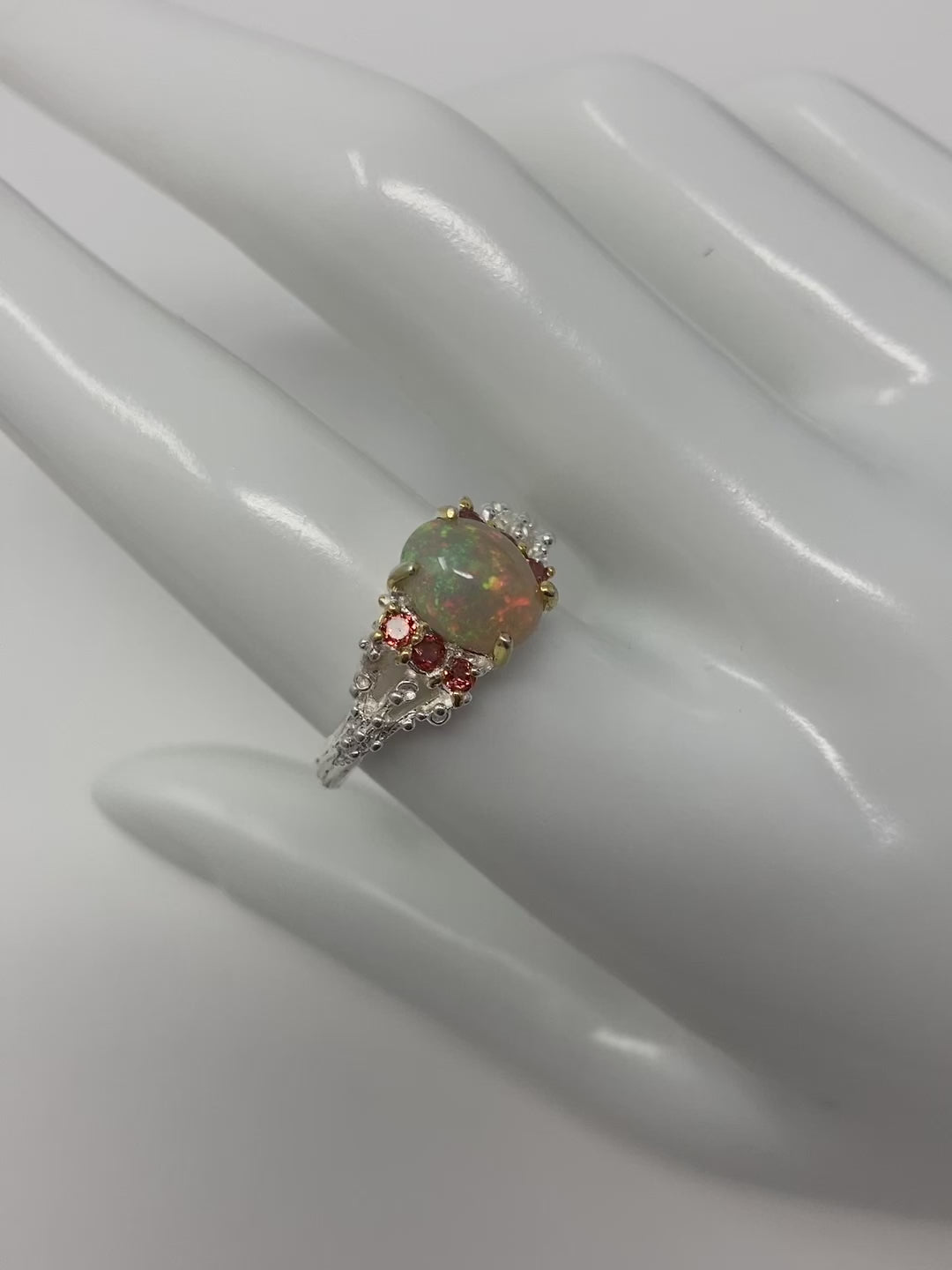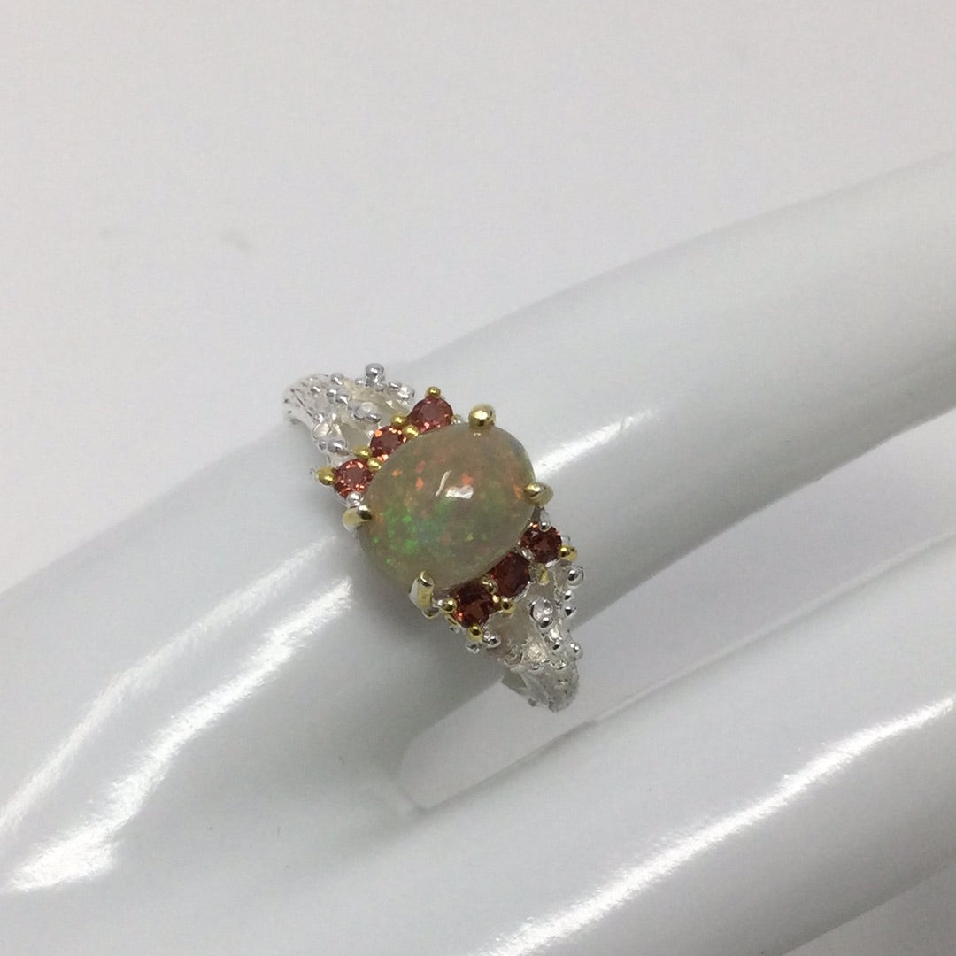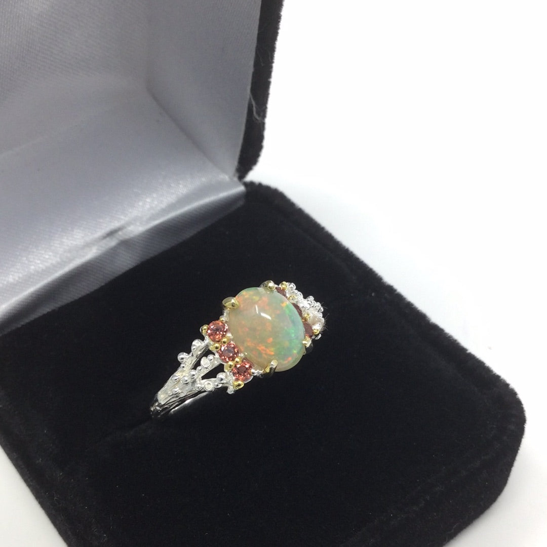 Somebody put the fire out, this Opal is hot, on fire with amazing flashes. This genuine, natural Opal measures 9mm by 7mm and wow is it a great quality gemstone, flanked by genuine Garnets. This ring won’t give you hot flashes but t will thrill and amaze your admirers. Set in .925 sterling silver with a 14K white gold overlay, one of a kind, never mass produced. Size 7 3/4 Resize at your jeweler or use a ring guard.