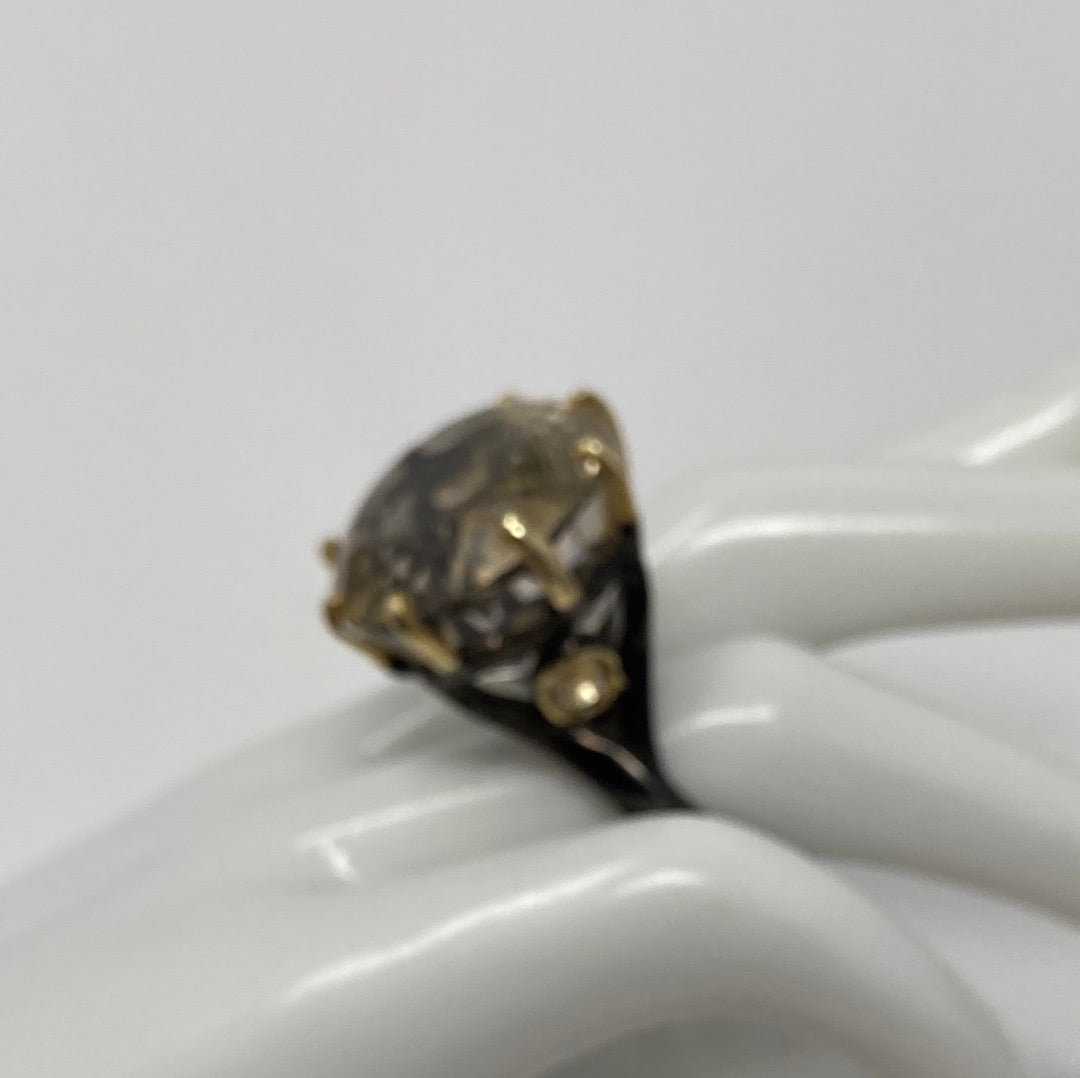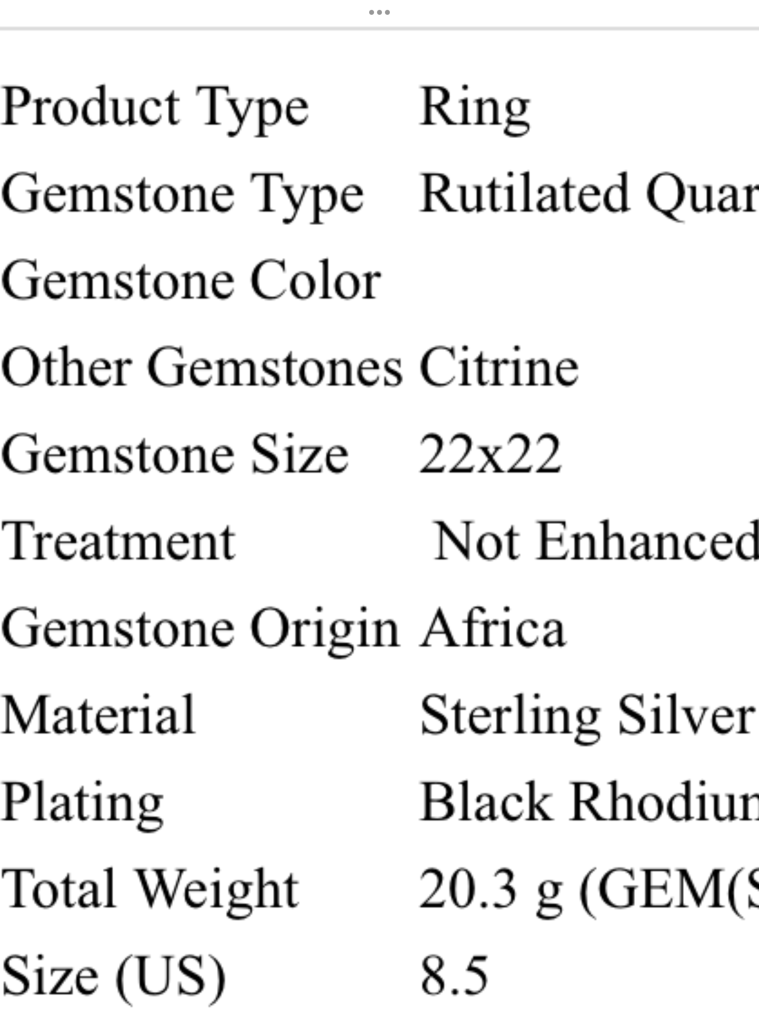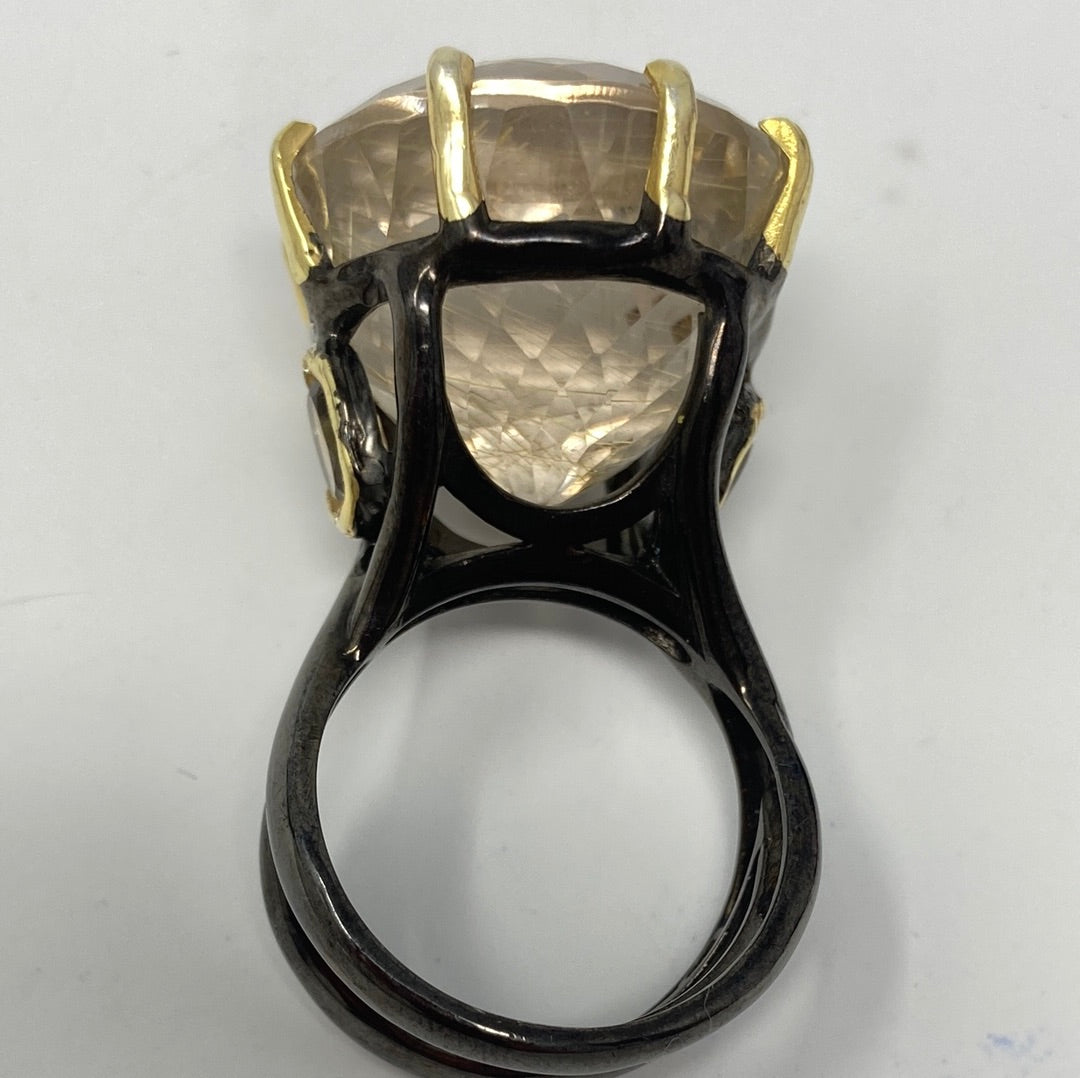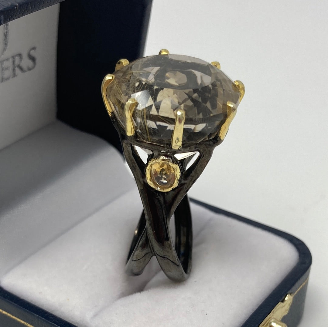 Look at the size of this baby, 45 CTW, jaw dropping magnificence! 22mm by 22mm of genuine top quality Golden Rutile. You can see the golden needles running through this gemstone. It one of the nicest specimens I’ve ever come across. Nice deep gemstone that sits securely in this solid .925 setting with a Rhodium overlay and Yellow gold embellishments. Flanked on each side by genuine Citrines. This one is super unique and I almost kept this one, it looks like a museum piece. Size 8 1/2, Resize at your jeweler or use a ring guard.