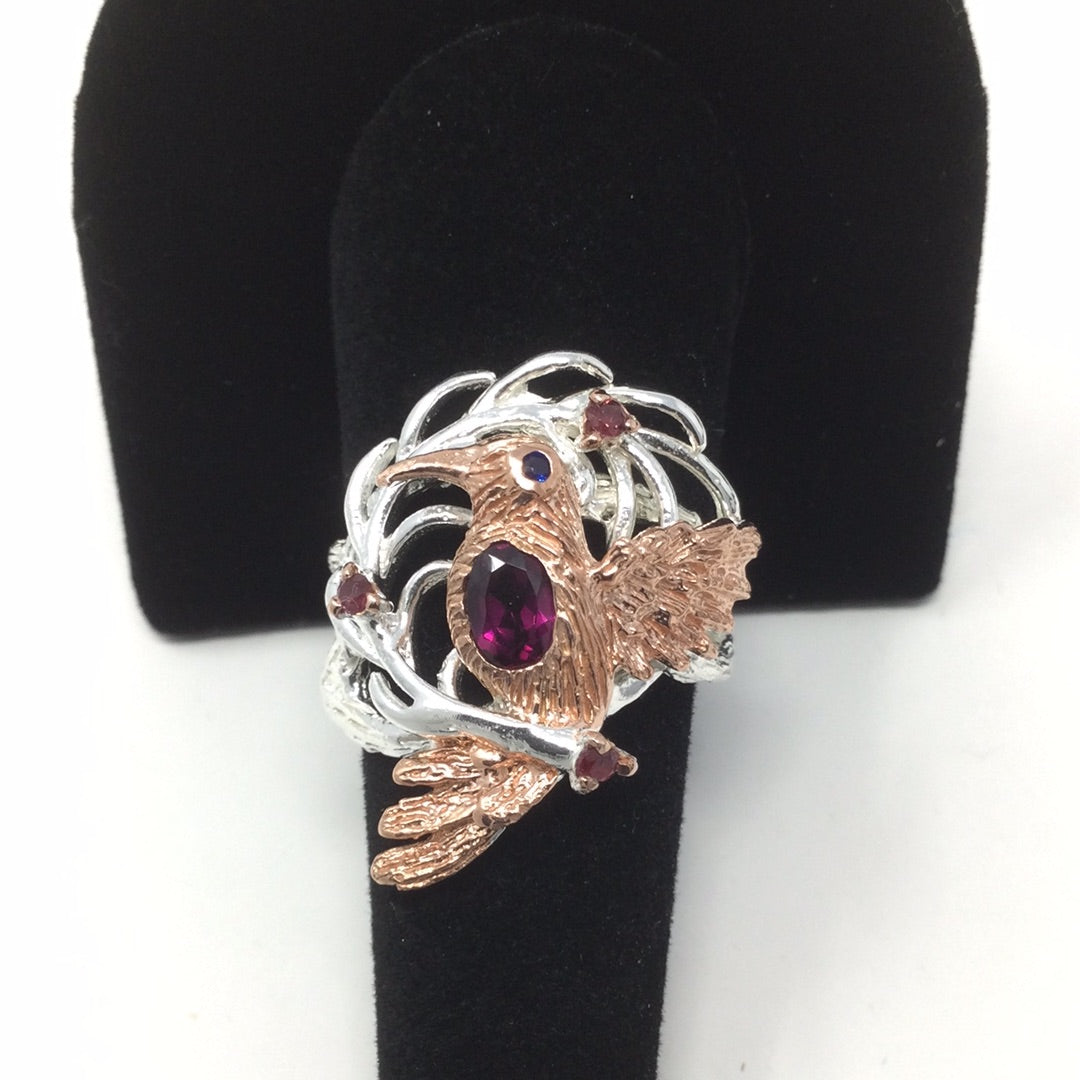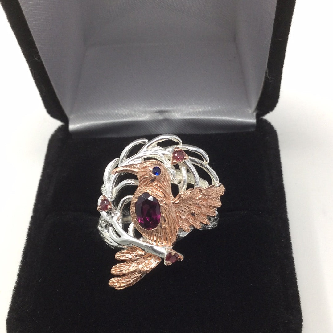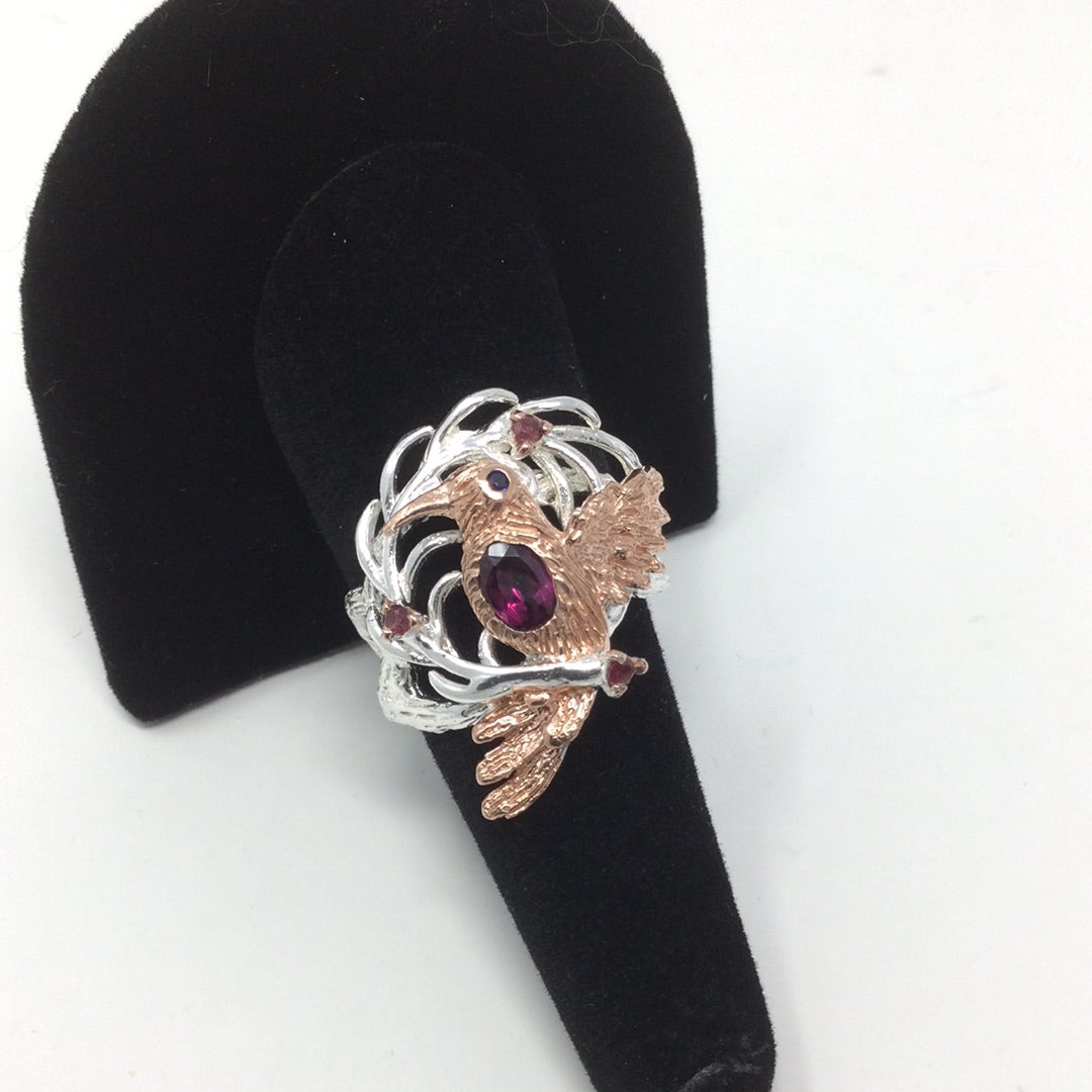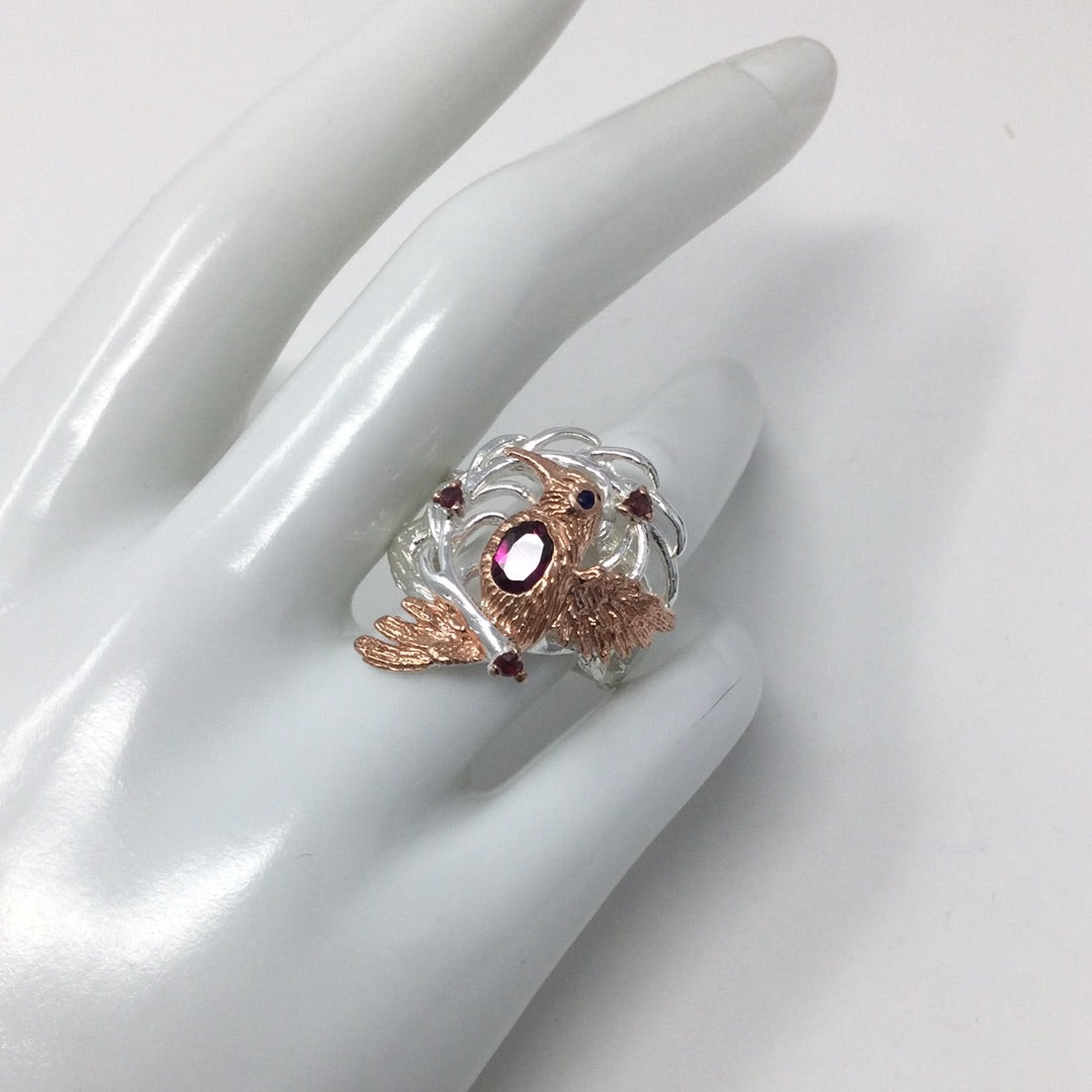 A precious little hummingbird so exquisitely detailed and refined. This bird is a real gem, featuring faceted, timeless red, Rhodolite garnets, genuine gemstones set in sterling silver with. 14K white and rose gold finish. Tiny little CZs are sprinkle in the setting to highlight the natural Garnets. Let this special bird perch upon your hand and remind you of the beauty in nature on a Gods greatest canvas, out earth. Invest in finely crafted genuine gemstone jewelry for your future family heirlooms. Size 7 3/4, Resize at your jeweler.