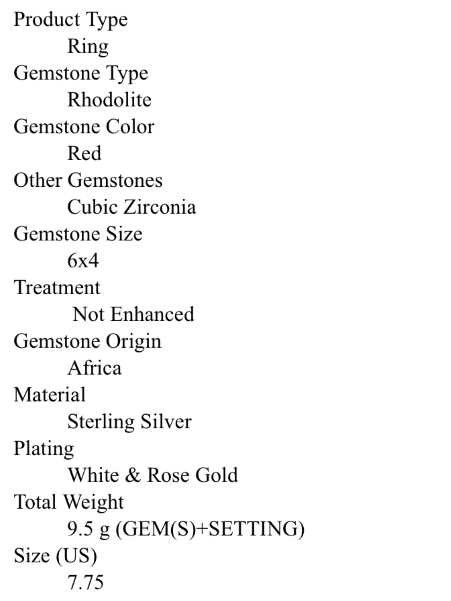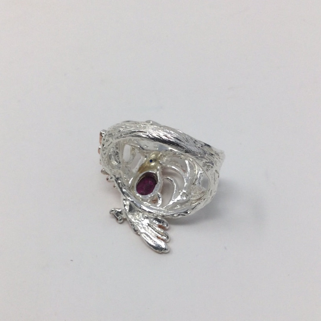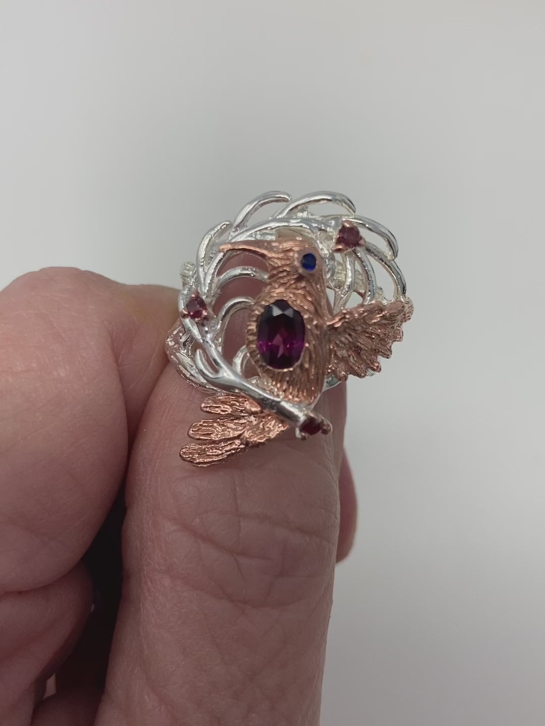 A precious little hummingbird so exquisitely detailed and refined. This bird is a real gem, featuring faceted, timeless red, Rhodolite garnets, genuine gemstones set in sterling silver with. 14K white and rose gold finish. Tiny little CZs are sprinkle in the setting to highlight the natural Garnets. Let this special bird perch upon your hand and remind you of the beauty in nature on a Gods greatest canvas, out earth. Invest in finely crafted genuine gemstone jewelry for your future family heirlooms. Size 7 3/4, Resize at your jeweler.