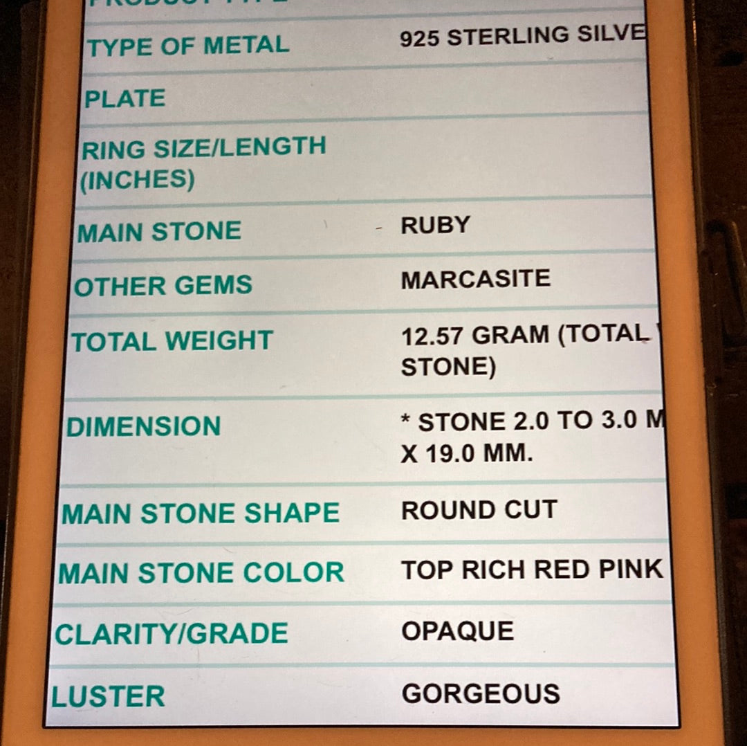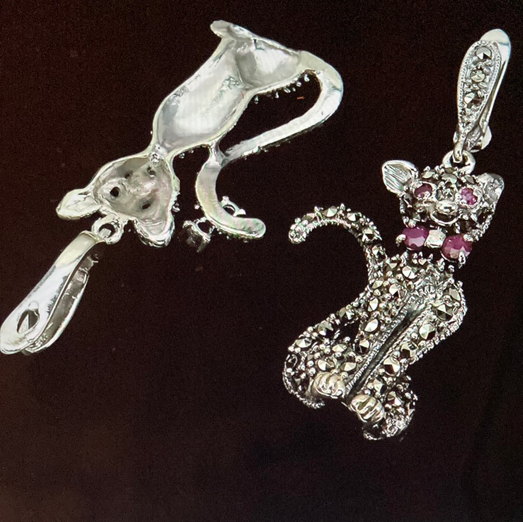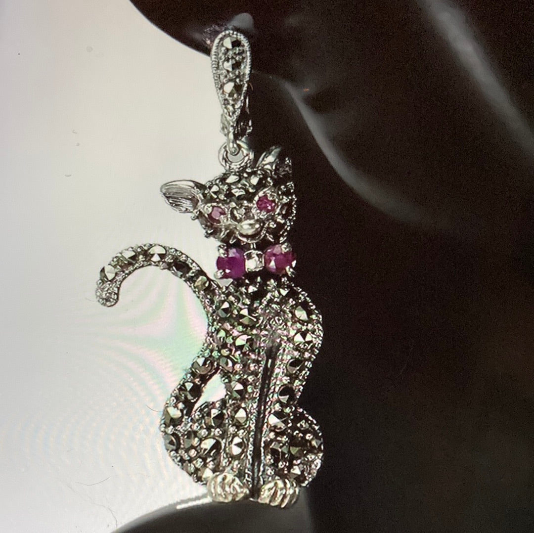 These are super special and so exquisitely detailed, antically created from .925 sterling silver encrusted with Marcasites, inset with genuine Rubies. Approximately 1 1/4” long