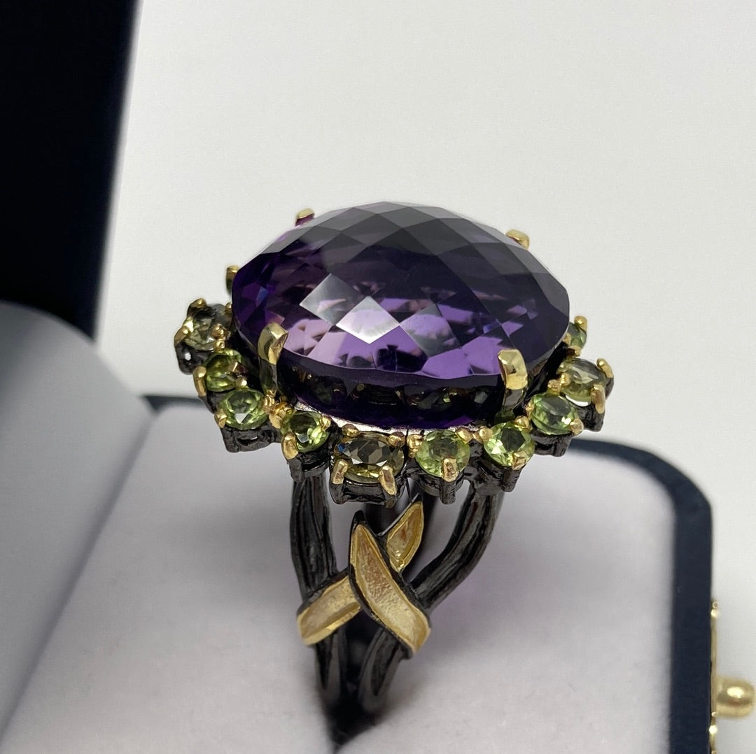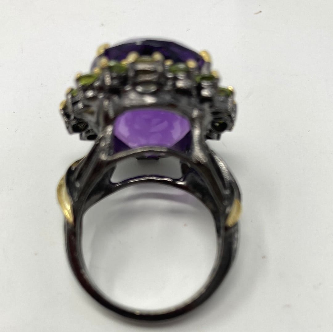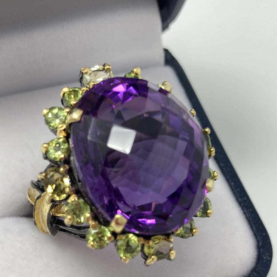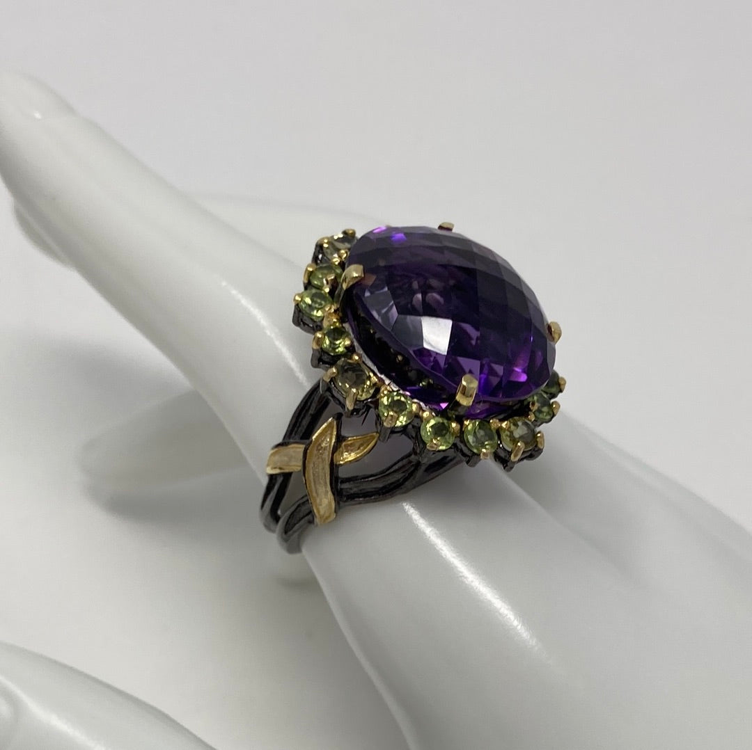 This is ring of poetry upon your hand in a incredible 35 CTW rich purple Amethyst. This is the highly desirable checkerboard faceting that intensifies sparkle factor. This custom made, one of a kind spectacular gemstone is kissed by oval, genuine Green Tourmalines placed strategically on the ring. Set in .925 sterling silver with a Rhodium overlay for durability and beauty. Size 8 1/2, Resize at your jeweler or use a ring guard.