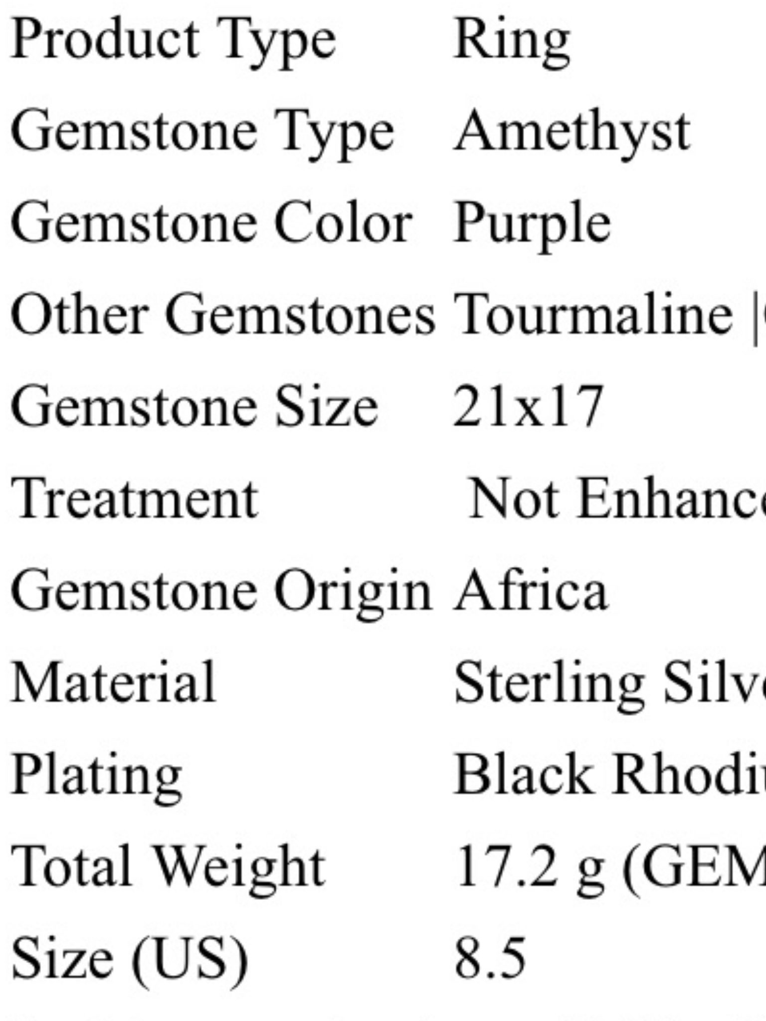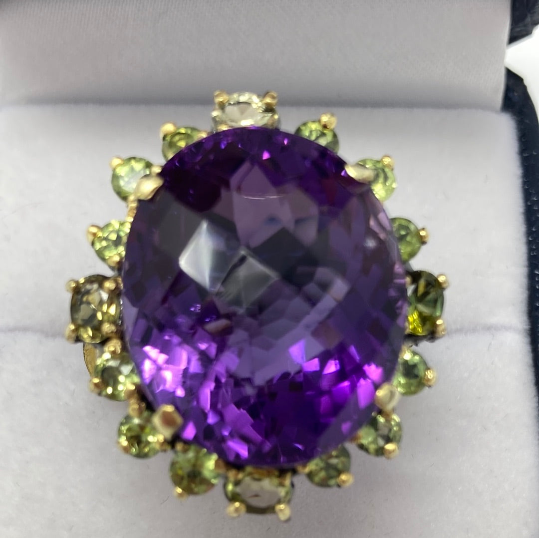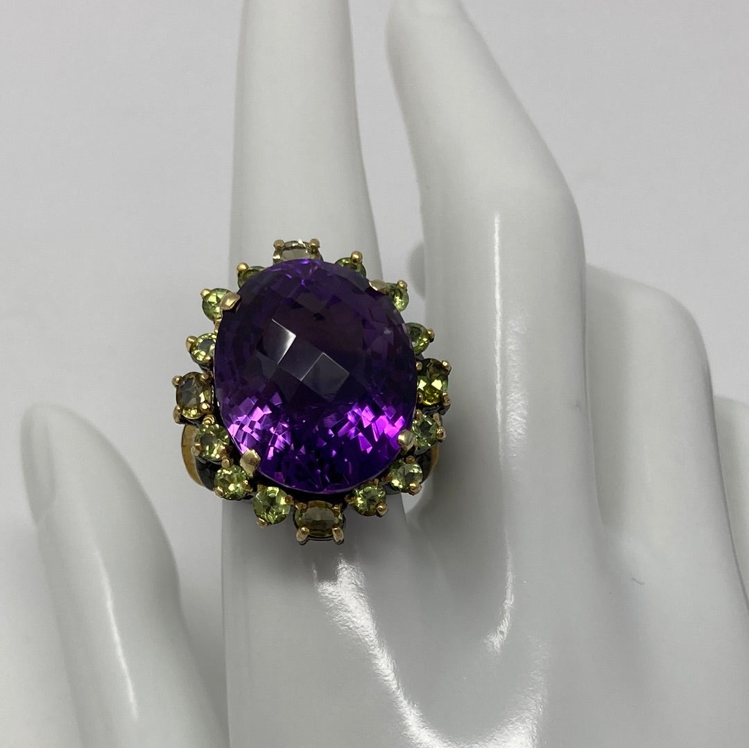 This is ring of poetry upon your hand in a incredible 35 CTW rich purple Amethyst. This is the highly desirable checkerboard faceting that intensifies sparkle factor. This custom made, one of a kind spectacular gemstone is kissed by oval, genuine Green Tourmalines placed strategically on the ring. Set in .925 sterling silver with a Rhodium overlay for durability and beauty. Size 8 1/2, Resize at your jeweler or use a ring guard.