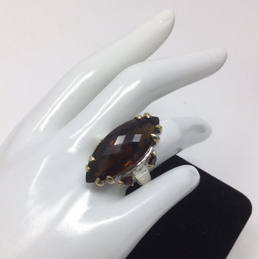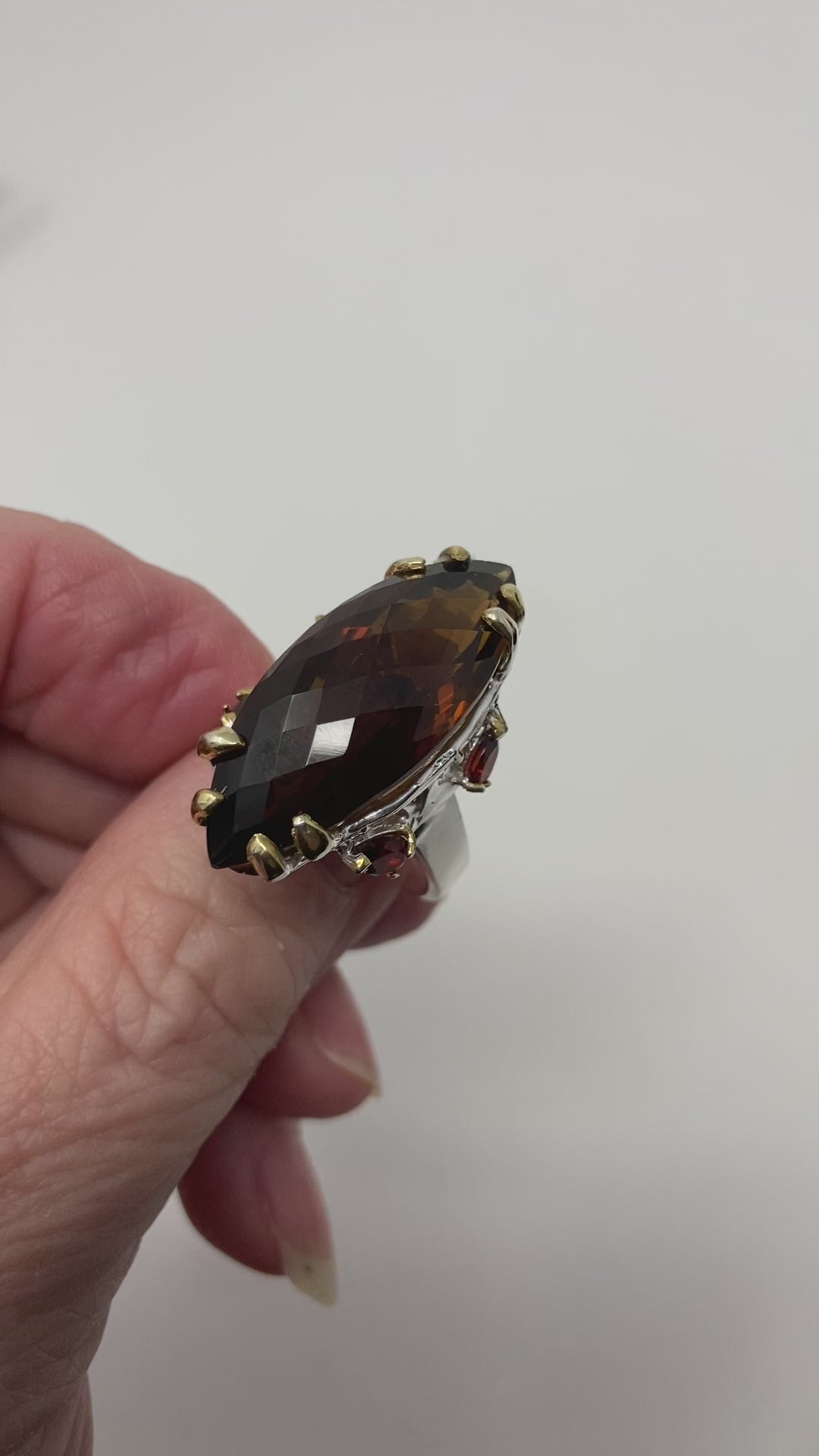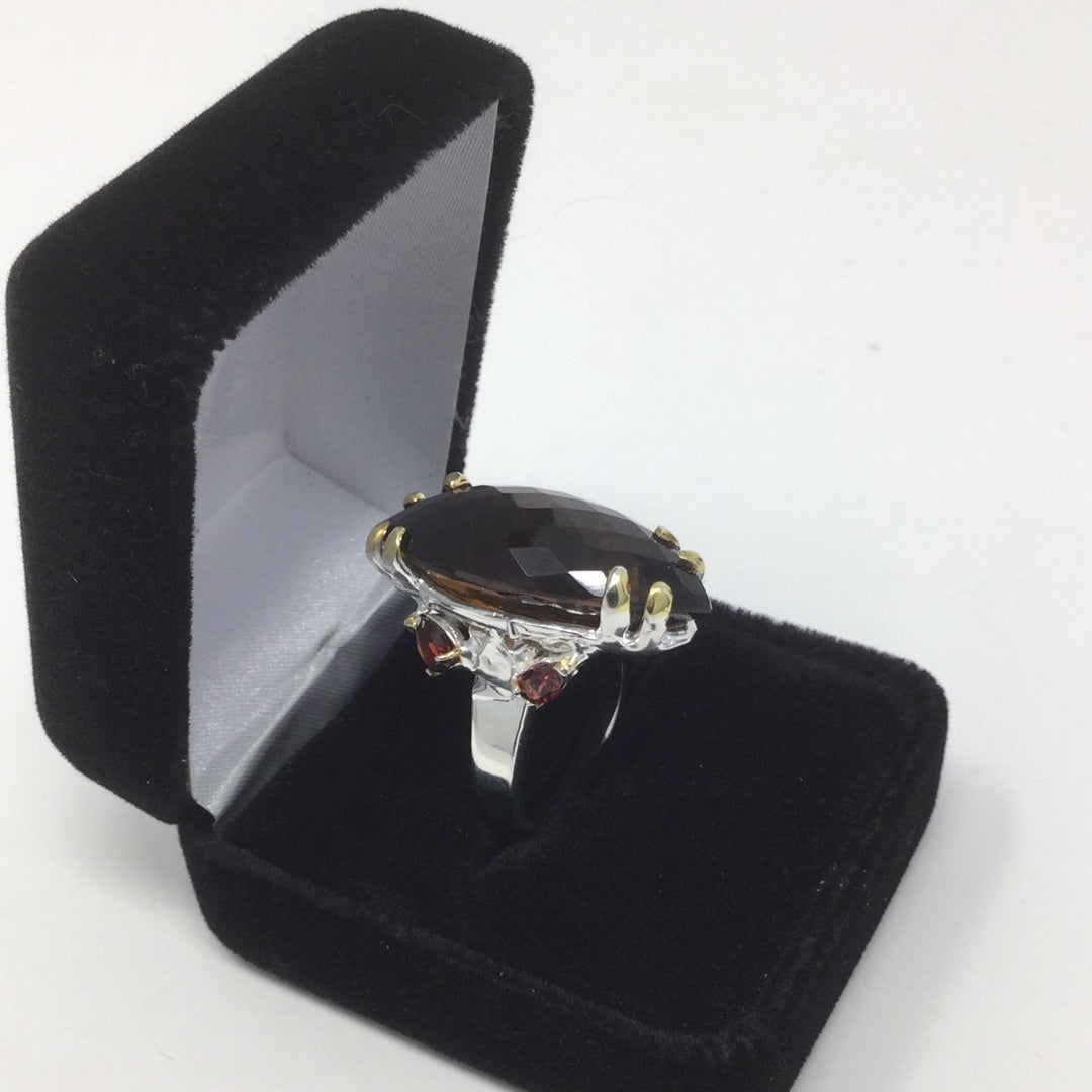 Over 20 CTW of genuine Smokey Quartz also referred to as Smokey Topaz, this one features that highly desirable checkerboard faceting in a breathtaking marquee cut! Each side is then accented with pear shaped genuine Garnets. Set in .925 in sterling silver with yellow gold overlay on the secure claw like prongs. This ring has lots of details and is a custom made one of a kind artistic statement. Size 8, Resize at your jeweler.