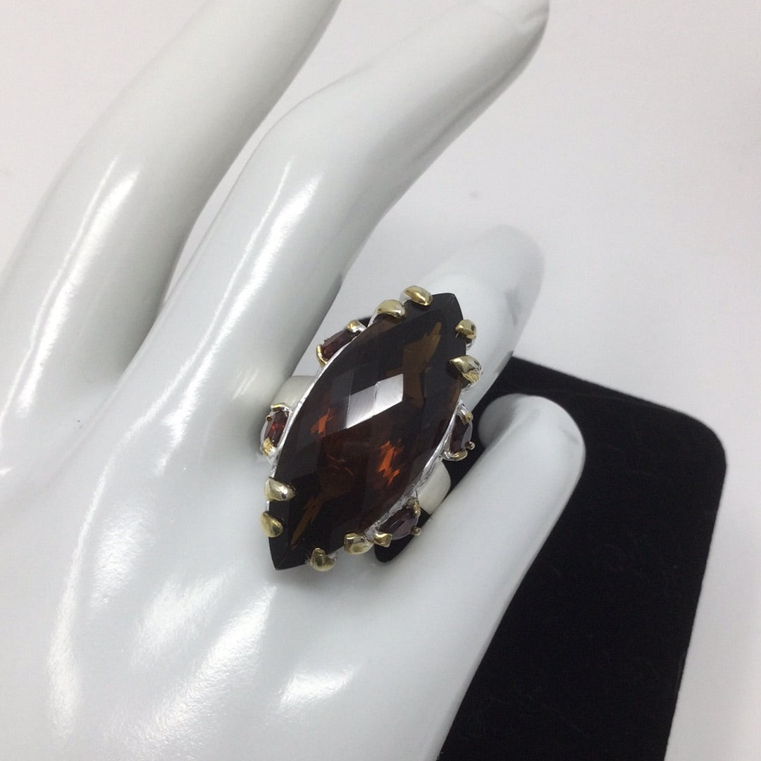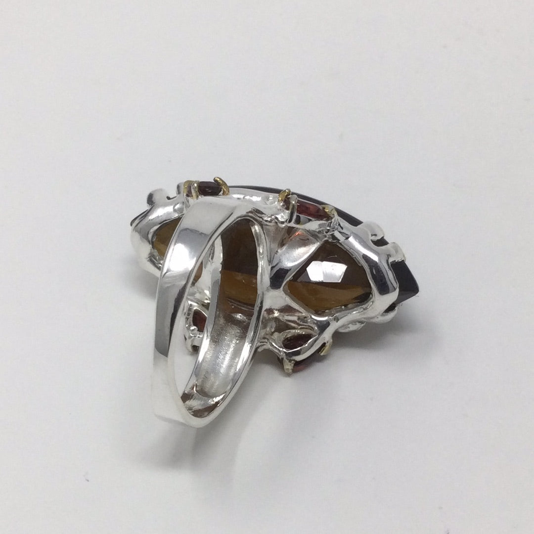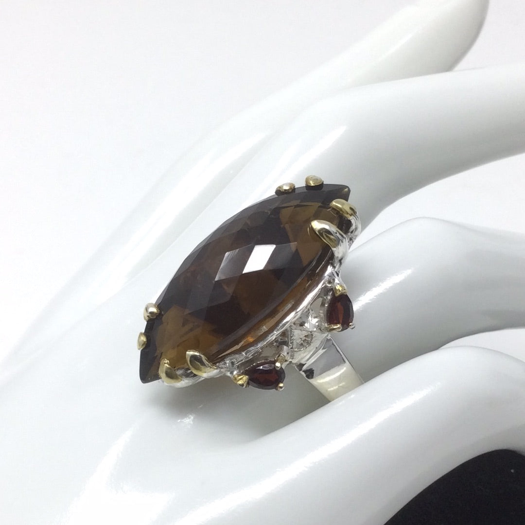 Over 20 CTW of genuine Smokey Quartz also referred to as Smokey Topaz, this one features that highly desirable checkerboard faceting in a breathtaking marquee cut! Each side is then accented with pear shaped genuine Garnets. Set in .925 in sterling silver with yellow gold overlay on the secure claw like prongs. This ring has lots of details and is a custom made one of a kind artistic statement. Size 8, Resize at your jeweler.