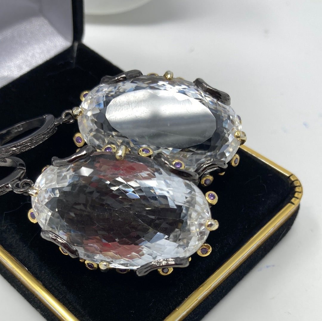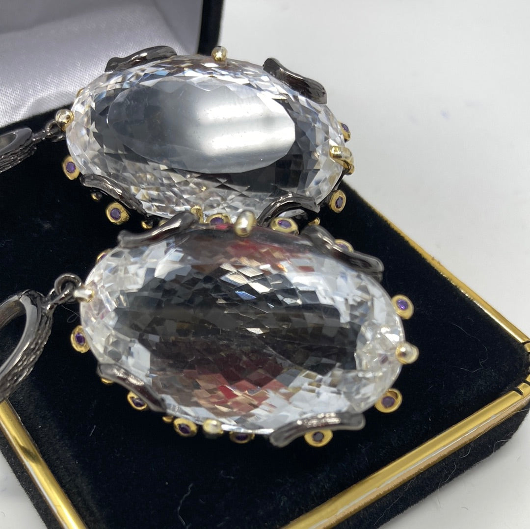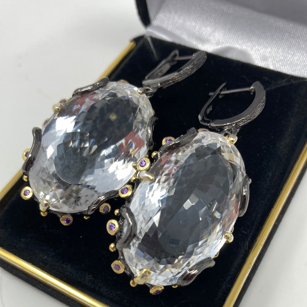 Seldom can you find this top quality genuine Rock Crystal Quartz in this impeccable clarity. These gemstones were hand selected for cut, color and clarity and they have it all! These are not mass produced, one of a kind, custom made earrings that are future family heirlooms. A stunning way to frame your face and skin for incandescent beauty. Encircling these majestic genuine gemstones are tiny Amethyst CZS, super classy works for all occasions. Set in .925 sterling silver with a Rhodium overlay and touches of yellow gold. Little over an inch long.