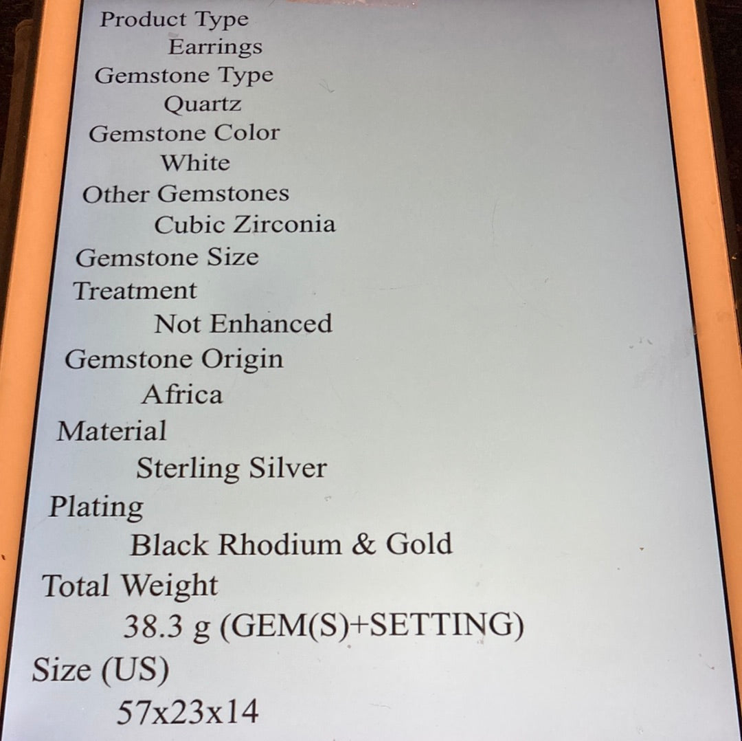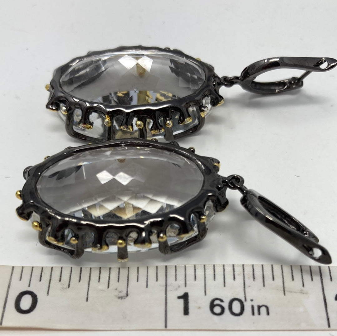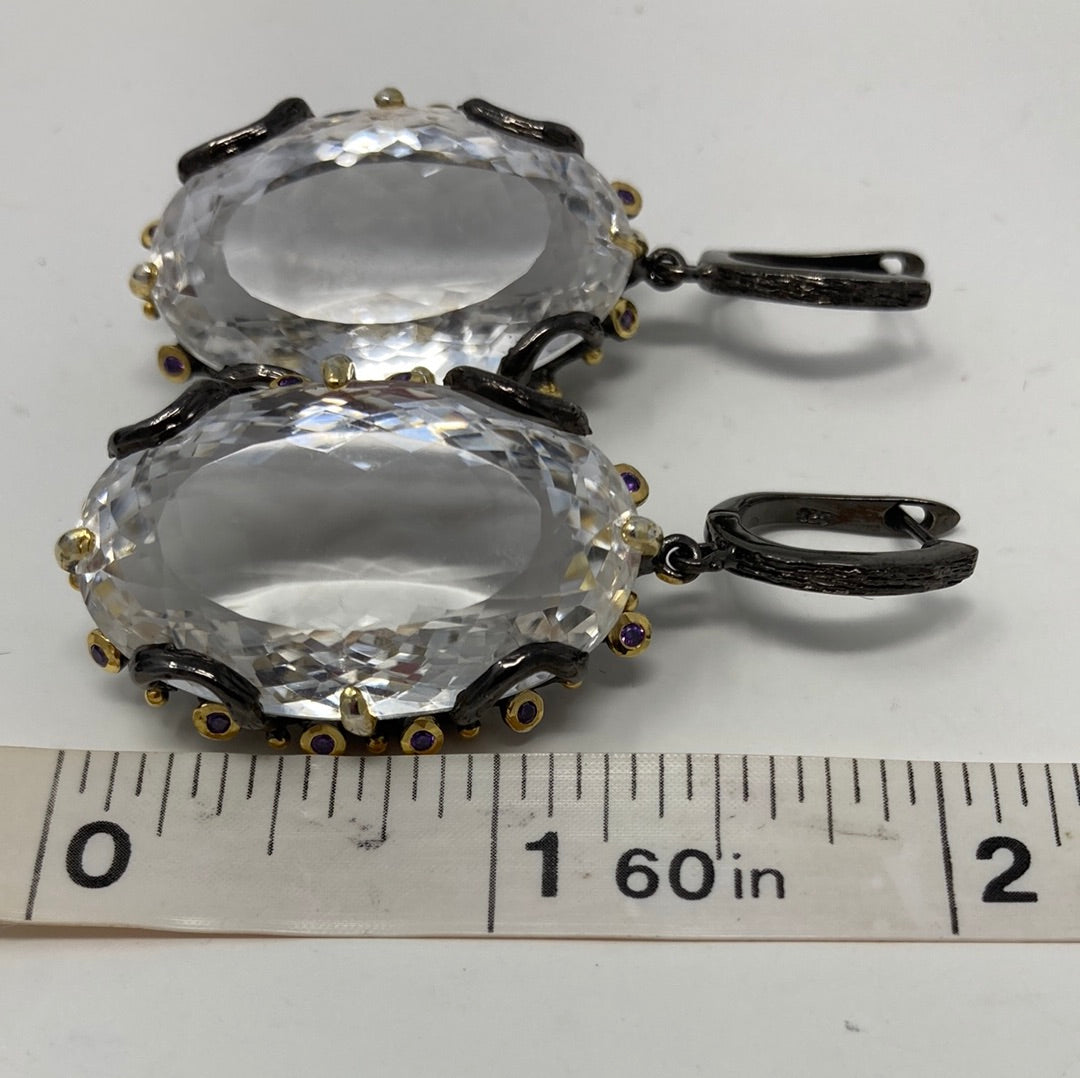 Seldom can you find this top quality genuine Rock Crystal Quartz in this impeccable clarity. These gemstones were hand selected for cut, color and clarity and they have it all! These are not mass produced, one of a kind, custom made earrings that are future family heirlooms. A stunning way to frame your face and skin for incandescent beauty. Encircling these majestic genuine gemstones are tiny Amethyst CZS, super classy works for all occasions. Set in .925 sterling silver with a Rhodium overlay and touches of yellow gold. Little over an inch long.