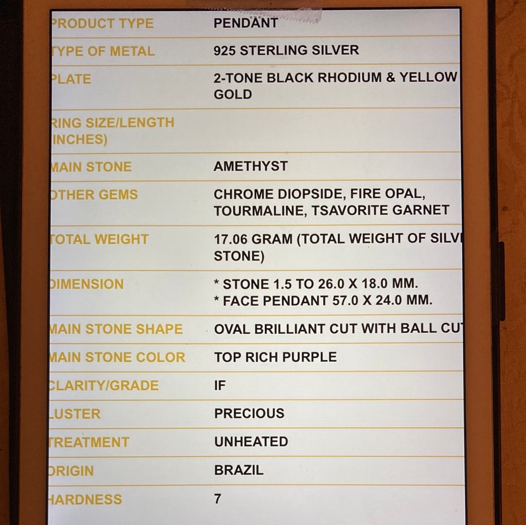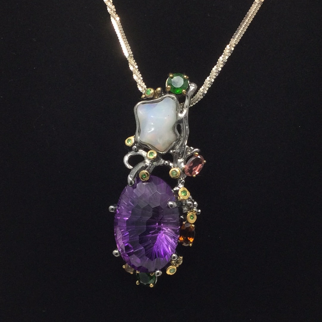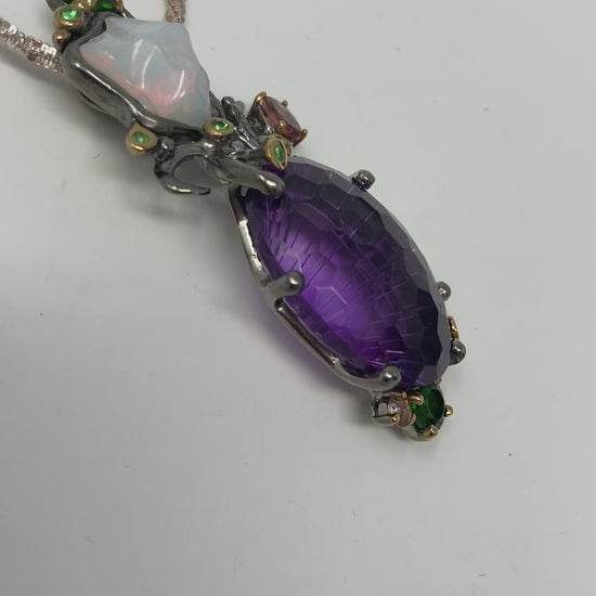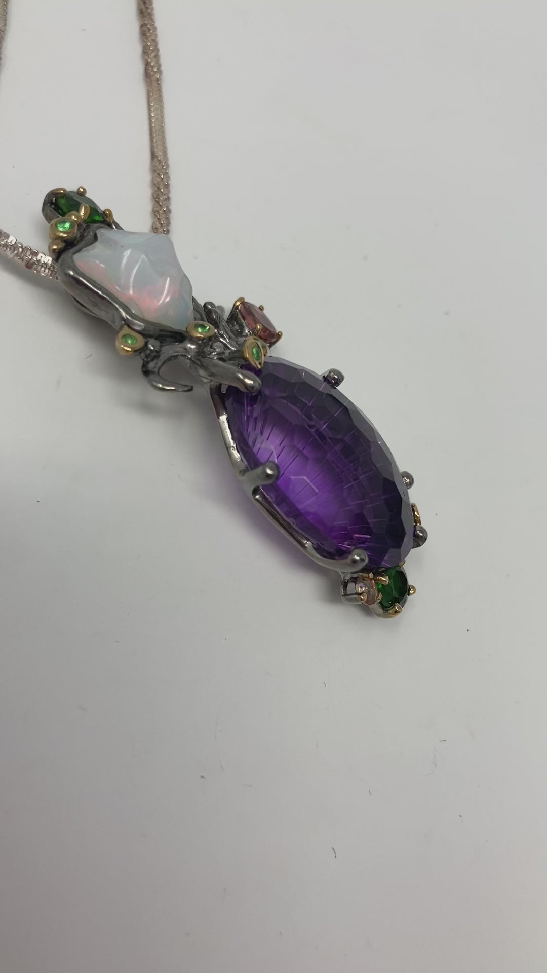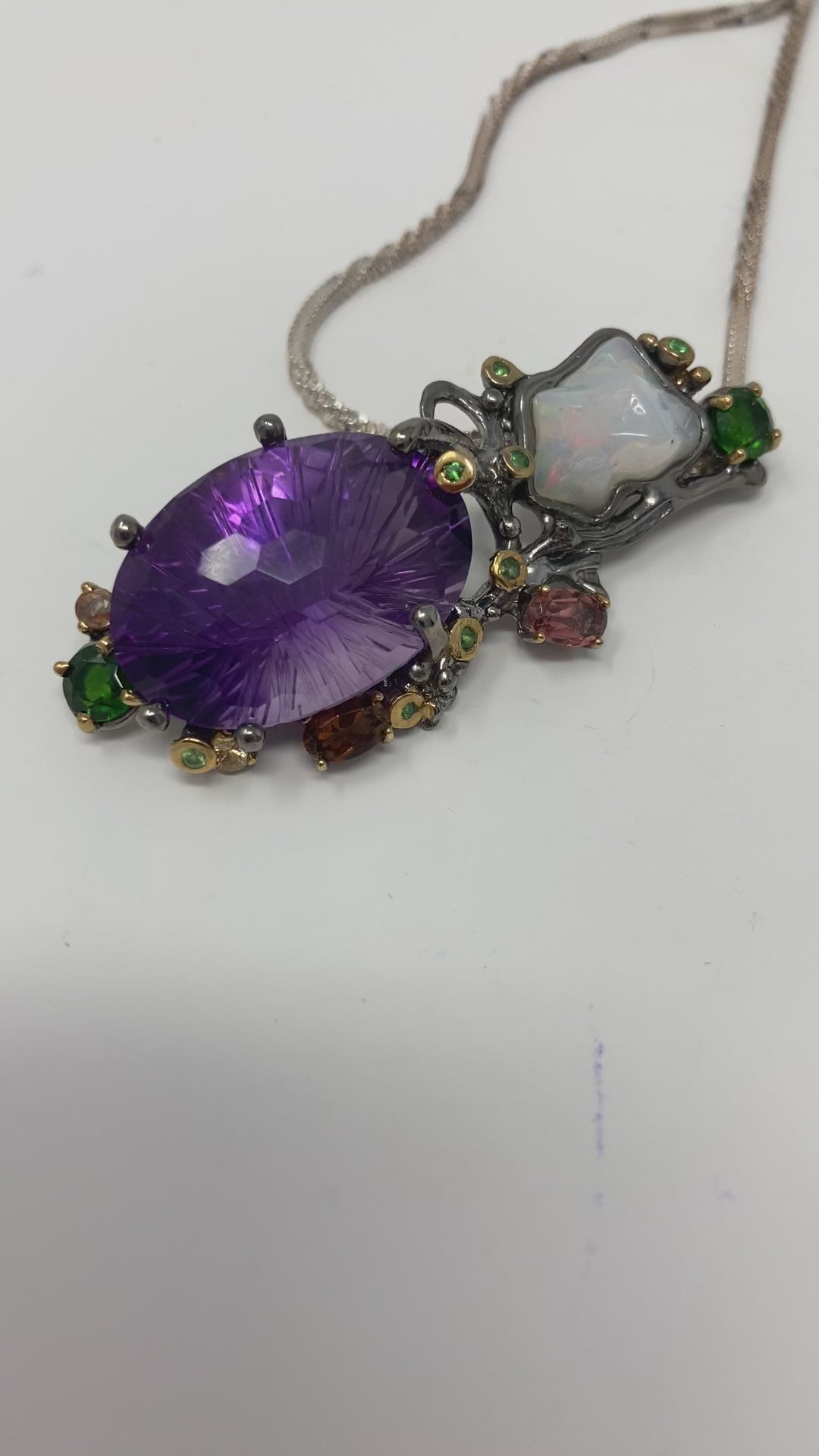 This pendant is bejeweled with precious genuine gemstone, in addition to this fabulous 30 + CTW Amethyst and fiery freeform Opal, you have rare Tsavorite, Pink Tourmaline and Russian Chrome Diopside. A very artistic gemstone masterpiece that will have all eyes on you, it’s a very unique elevated look, all custom made, a one of a kind crafted in .925 sterling silver with a Rhodium overlay and 14K yellow gold accents. This pendant will thrill you for years to come and will be a great family heirloom piece. Invest in genuine gemstones. Approximately 2” long comes with a unique 20” sterling silver chain too.