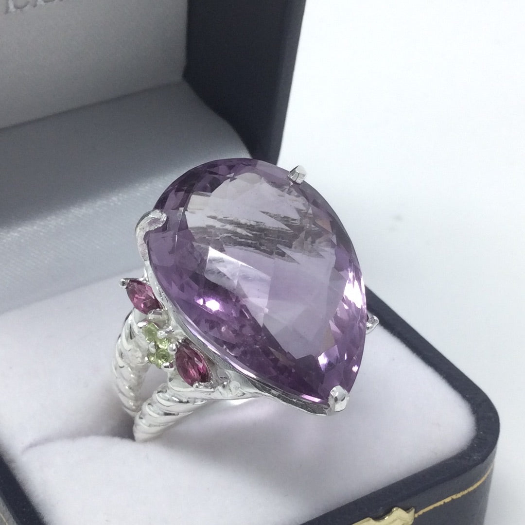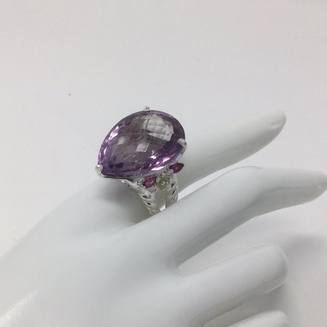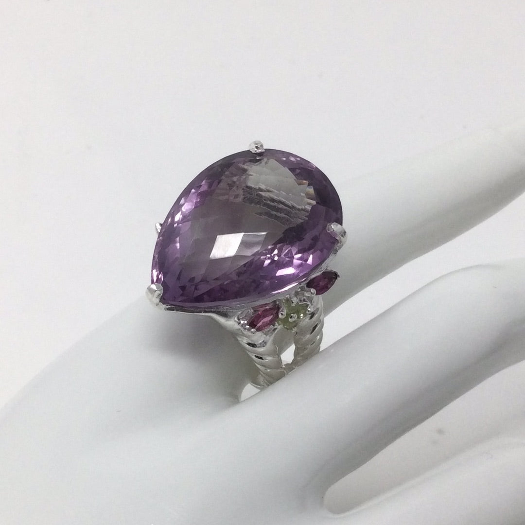 Insanely gorgeous, a massive 45 CTW Lavender Amethyst, exceptional, highly sought after checkerboard faceting. This pear shaped genuine gemstone is a superb specimen fit for royalty. It’s a lifetime investment, people pay more for costume jewelry, these are valuable gemstones that enhance many things, even your frame of mind. Accented on the side with beautiful genuine Rhodolite Garnets with a sprinkling of green CZS for artistic contrast. Throughout history gemstones have been valued even mentioned in ancient times in the Bible used in construction of the temple. Adorn yourself in natural beauty from our earth, wear genuine gemstones. Set in .925 sterling silver with a white gold overlay for durability and beauty. This is a one of a kind custom creation made for this unique gemstone. Size 8 1/2, Resize at your jeweler or use a ring guard.