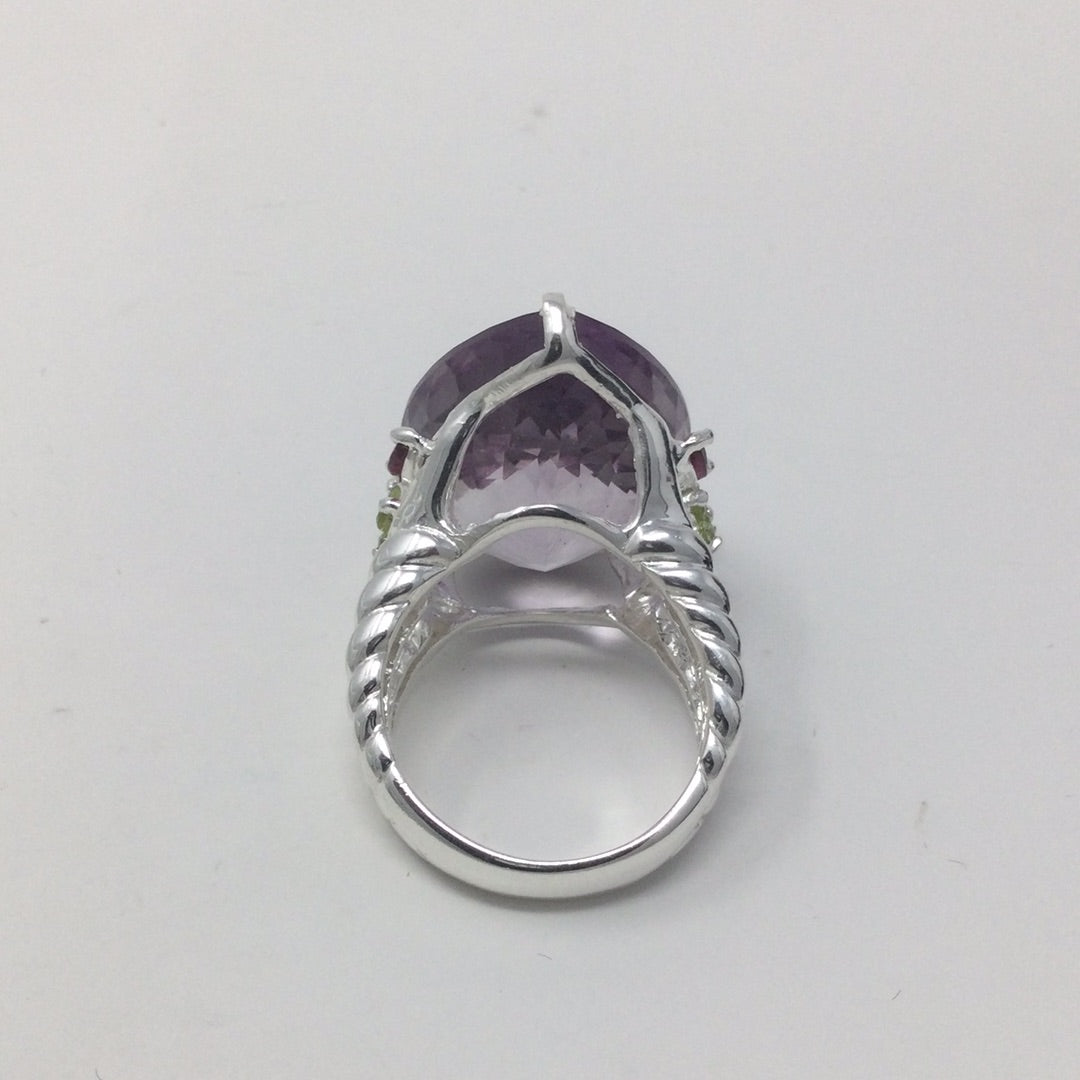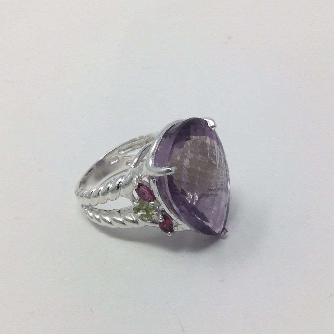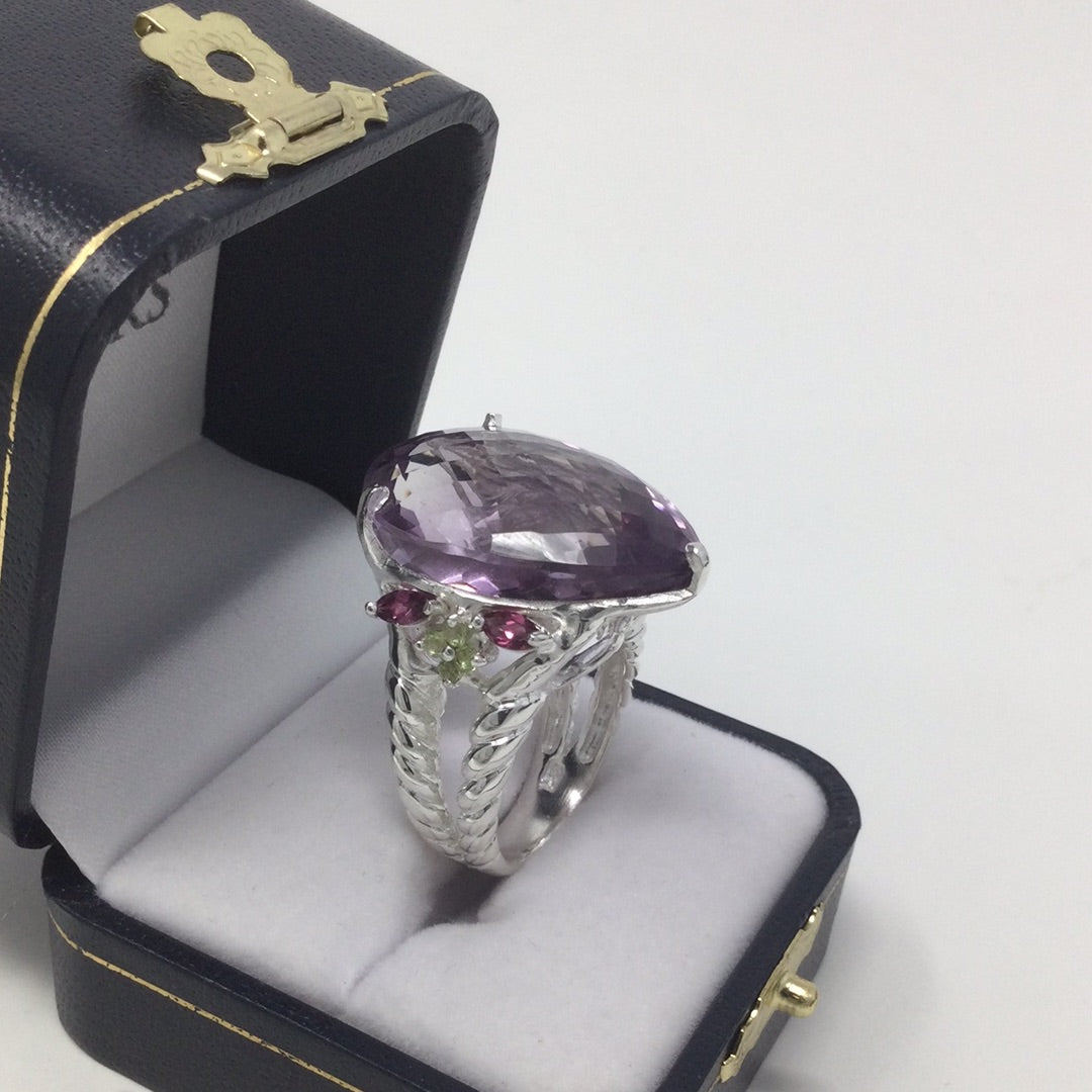 Insanely gorgeous, a massive 45 CTW Lavender Amethyst, exceptional, highly sought after checkerboard faceting. This pear shaped genuine gemstone is a superb specimen fit for royalty. It’s a lifetime investment, people pay more for costume jewelry, these are valuable gemstones that enhance many things, even your frame of mind. Accented on the side with beautiful genuine Rhodolite Garnets with a sprinkling of green CZS for artistic contrast. Throughout history gemstones have been valued even mentioned in ancient times in the Bible used in construction of the temple. Adorn yourself in natural beauty from our earth, wear genuine gemstones. Set in .925 sterling silver with a white gold overlay for durability and beauty. This is a one of a kind custom creation made for this unique gemstone. Size 8 1/2, Resize at your jeweler or use a ring guard.