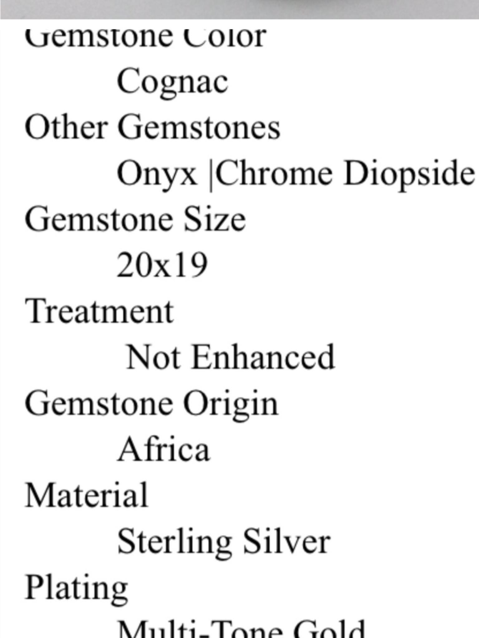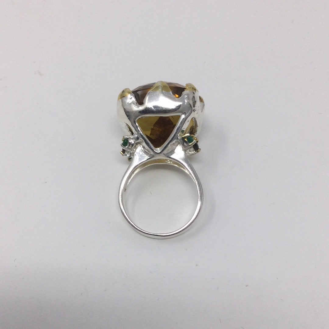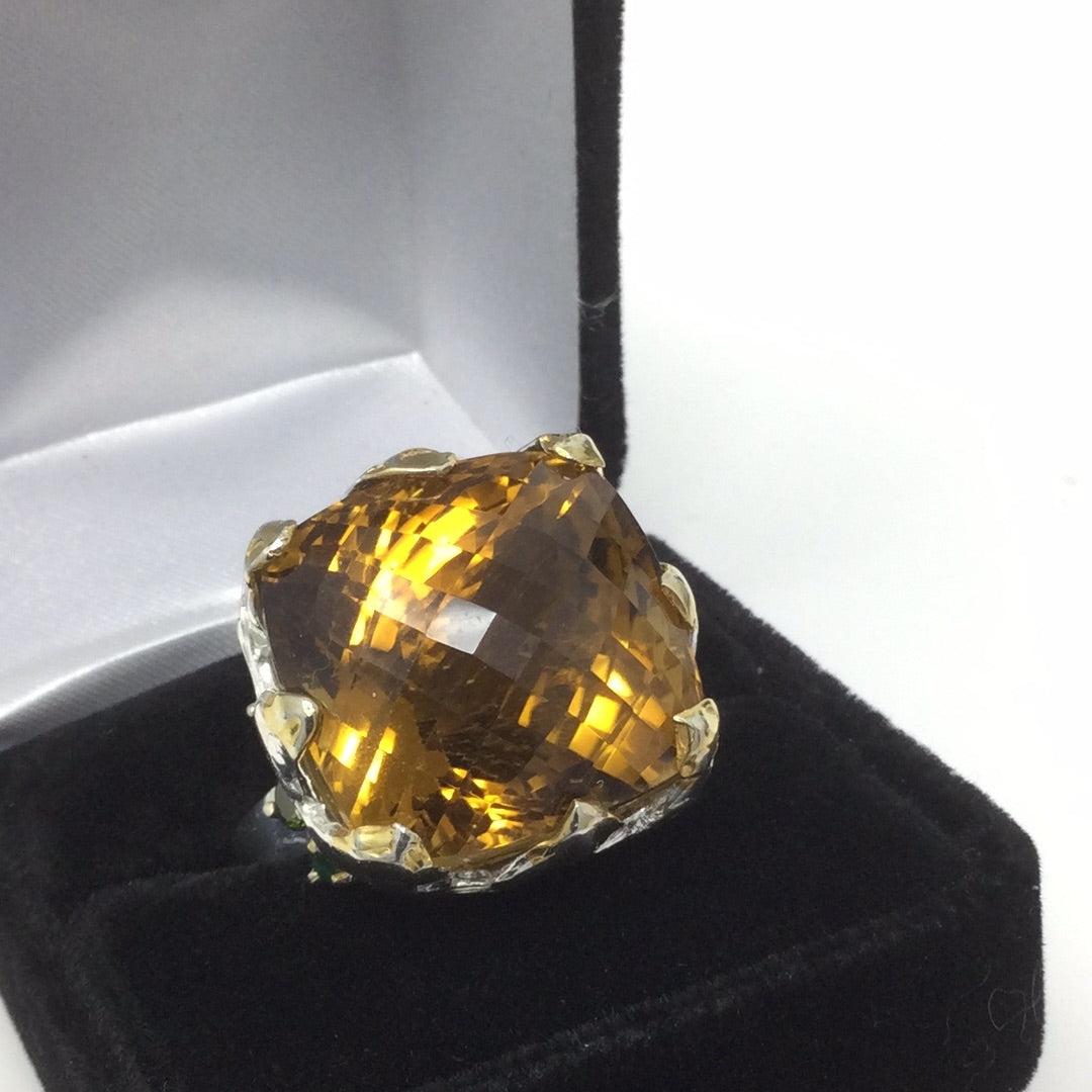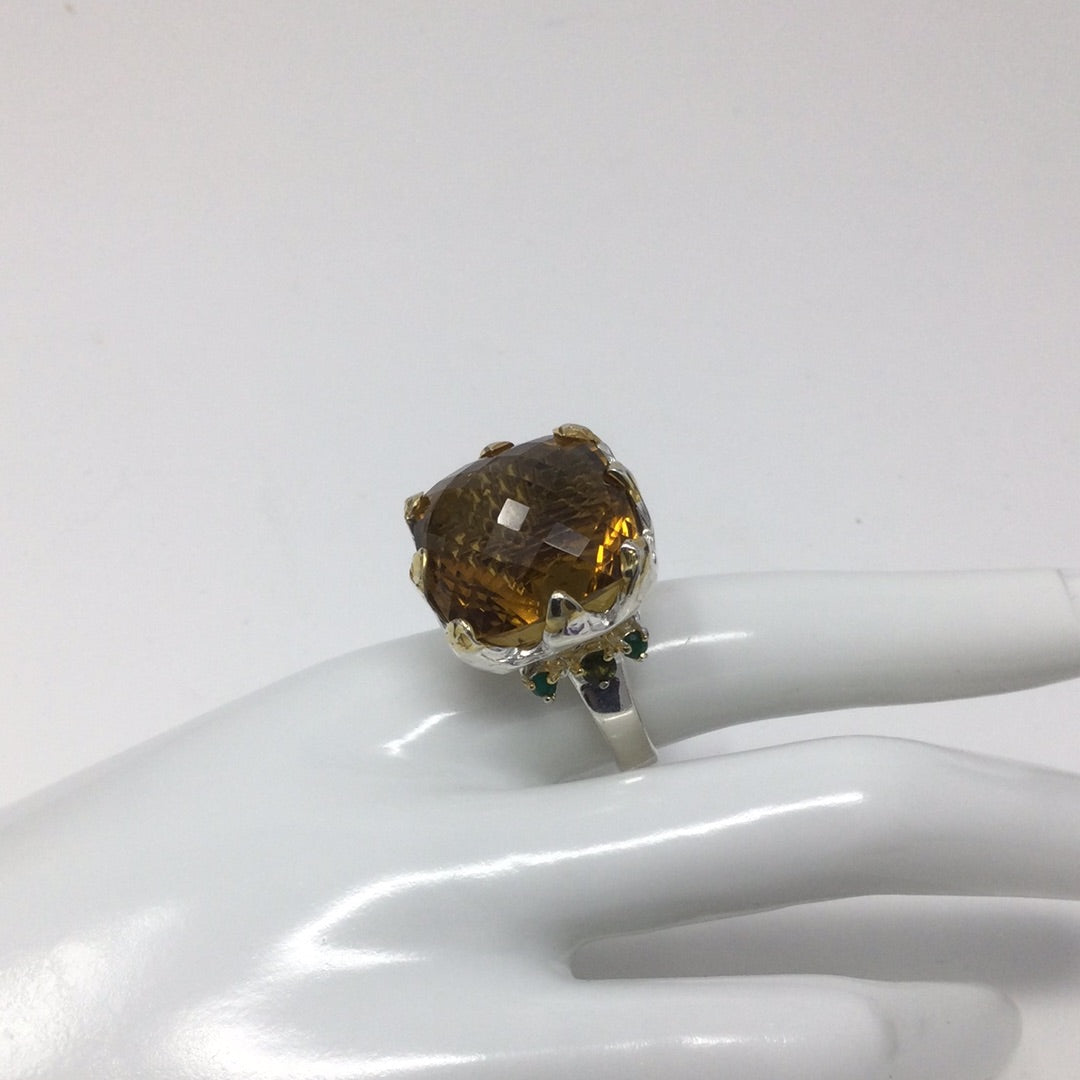 A superb gemstone showpiece specimen of genuine Cognac Quartz in that highly desirable, fascinating checkerboard faceted cut. It’s just astonishing and will be a prize in your gemstone collection. This is a one of a kind, artisan crafted in .925 sterling silver with a 14K white gold overlay with yellow gold accents on the prongs. Notice also it is flanked on each side with genuine Russian Chrome Diopside and Green Onyx. Invest in these unique artistic pieces, never mass produced, a wow factor that is you. Size 8, Resize at your jeweler or use a ring guard.