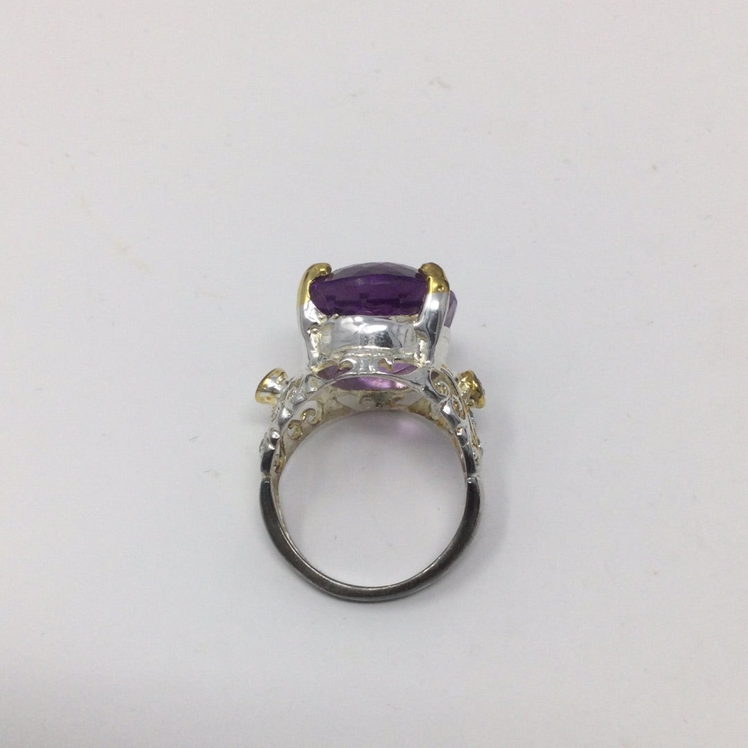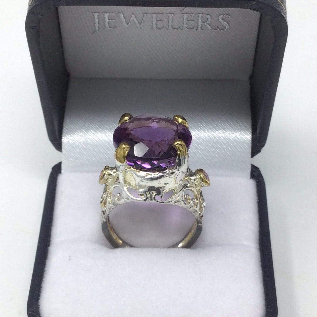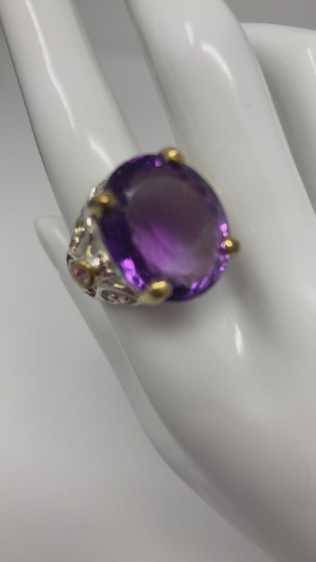 Breathtakingly over 25 CTW, just gorgeous, this natural, hi quality genuine 19mm by 16mm Amethyst was hand selected to be showcased in this custom designed, one of a kind setting. Crafted in .925 sterling silver with a 14K white and yellow gold overlay, accented with genuine Topaz. Noticed the scrollwork design, very classy, your own personal art gallery for your finger. Size 8 1/4 Resize at your jeweler or use a ring guard.
