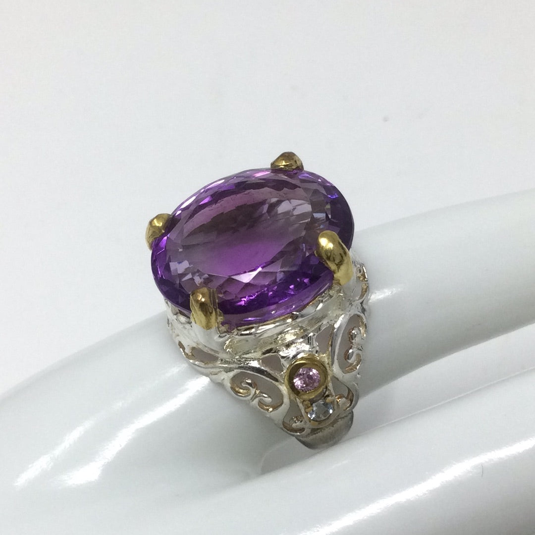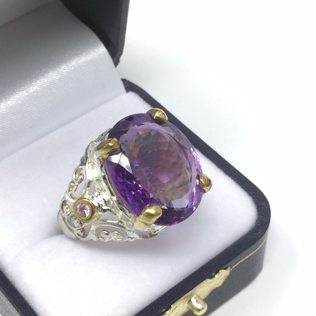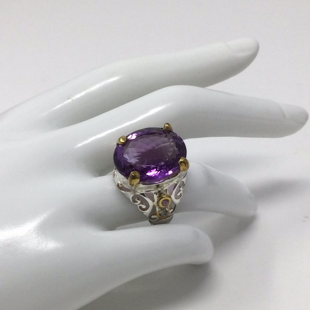 Breathtakingly over 25 CTW, just gorgeous, this natural, hi quality genuine 19mm by 16mm Amethyst was hand selected to be showcased in this custom designed, one of a kind setting. Crafted in .925 sterling silver with a 14K white and yellow gold overlay, accented with genuine Topaz. Noticed the scrollwork design, very classy, your own personal art gallery for your finger. Size 8 1/4 Resize at your jeweler or use a ring guard.