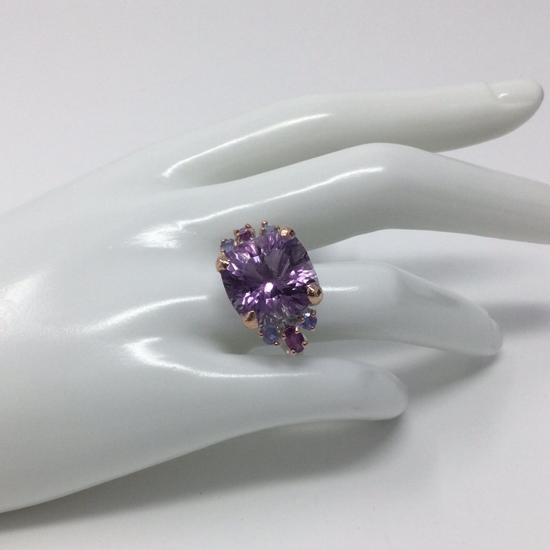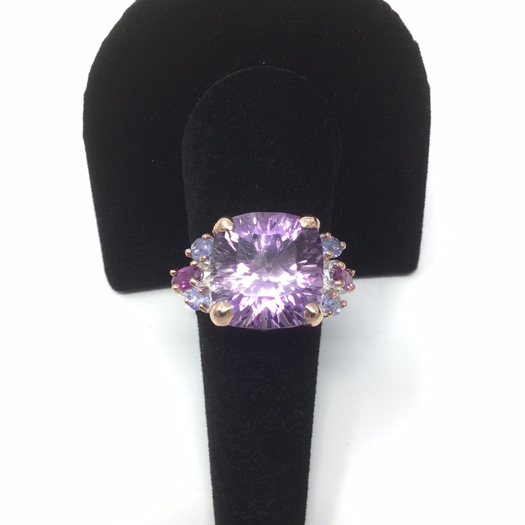 Super Amazing, fantastic rare faceted, eternity cushion cut top quality Amethyst ! This one of a kind is a delightful future heirloom of refinement, flanked by Rhodolite Garnets and genuine Tanzanite light up this unique creative beauty. An astounding work of art, approximately 17 CTW. Set in .945 sterling silver with a 14K white gold overlay. Size 8, resize at your jeweler