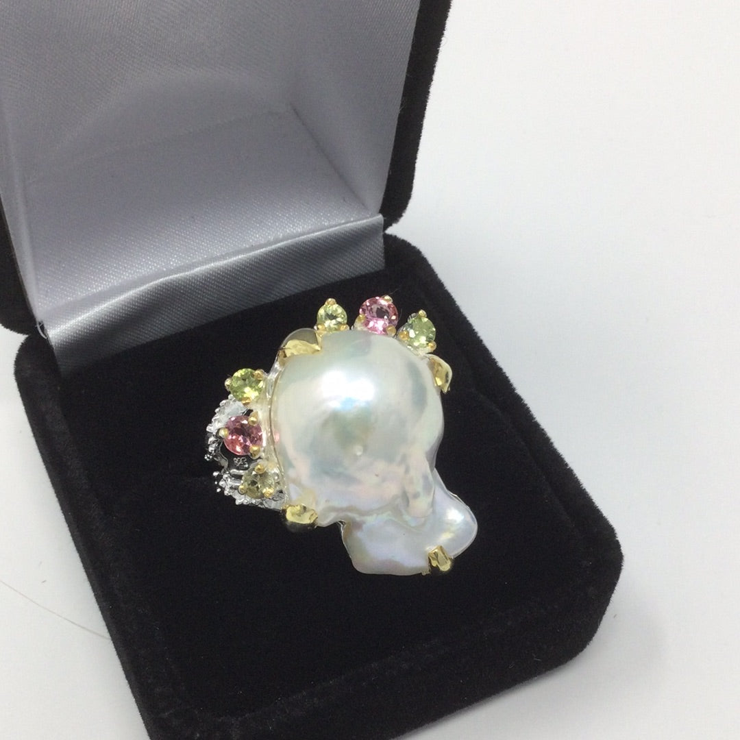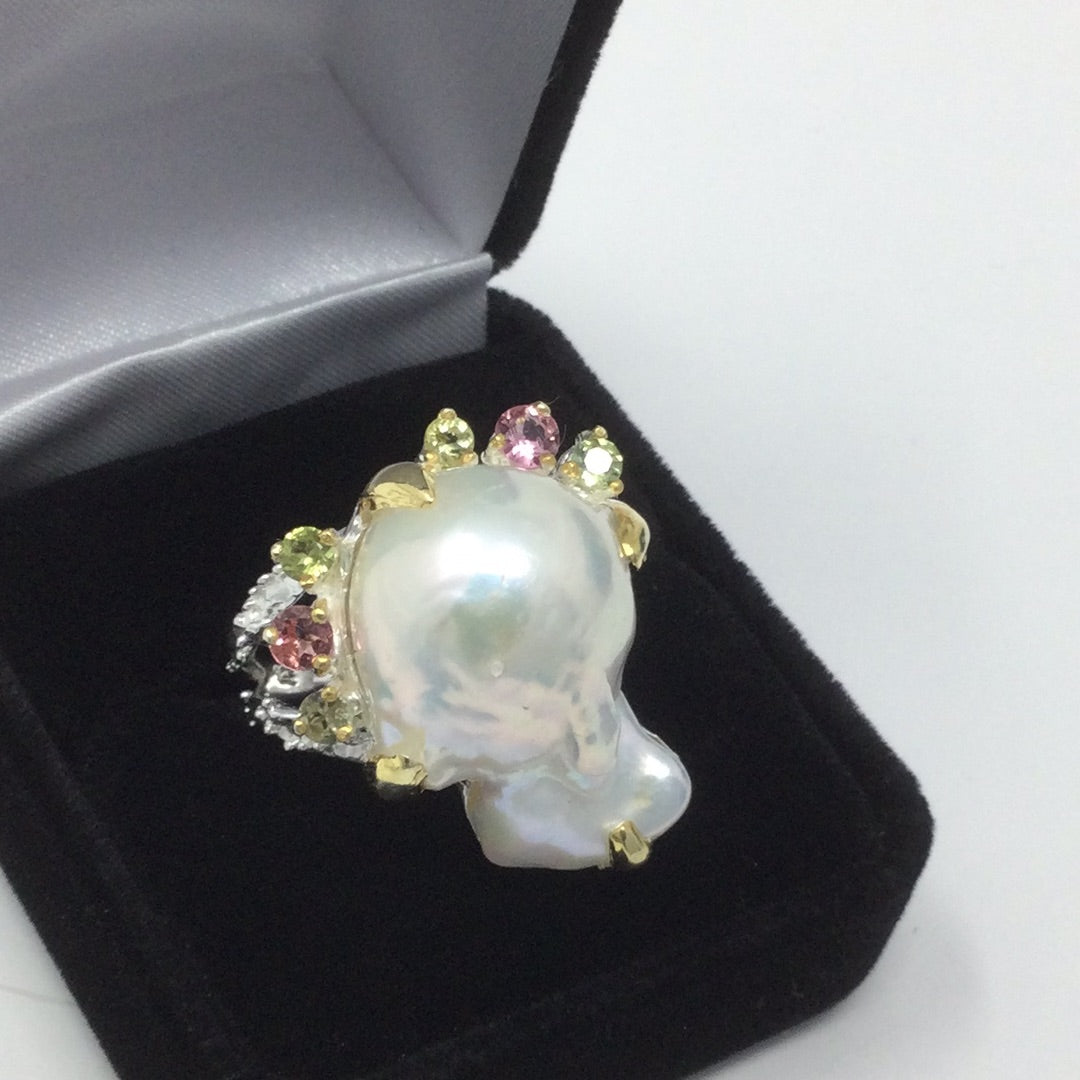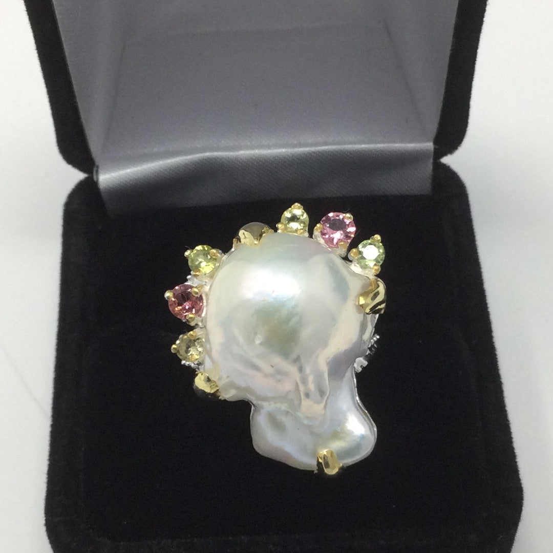 A thrilling unique treasure from the sea, a genuine 40+ CTW Baroque Pear, treasured throughout history, adorned in the crowns of royalty. Now you can make your royal entrance bedecked in this epic Baroque Pearl ring accented with Peridot & Tourmaline. Set in .925 with a white gold overlay for durability and beauty. Size 8, Resize at your jeweler.